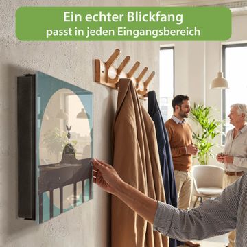 Bringe Ordnung und Eleganz in deinen Eingangsbereich mit dem banjado Schlüsselkasten Motiv Motiv City Poster Berlin. Die moderne Schlüsselbox kombiniert funktionales Design mit hochwertiger Verarbeitung und wird so zu einem echten Hingucker in Flur, Büro oder Ferienwohnung. ✅ Stilvolle Schlüsselaufbewahrung mit Glasfront im Motiv Motiv City Poster Berlin Der Design-Schlüsselkasten Motiv Motiv City Poster Berlin bietet Platz für bis zu 50 Schlüssel, die auf 5 stabilen Reihen mit je 10 Haken übersichtlich verstaut werden. Mit seinen kompakten Maßen von 30 x 30 x 5 cm passt die Schlüsselbox perfekt auch in kleinere Räume. Der schwarz lackierte Stahlkorpus mit rechts angeschlagenem Türscharnier harmoniert mit der Glasfront und fügt sich nahtlos in jedes Wohnambiente ein. Ob als Schlüsselorganizer für Zuhause oder als praktische Lösung für Büros, Praxen und Gewerbe, der banjado Schlüsselkasten sorgt für Ordnung und Übersicht. Dank der magnetischen, mit Kreidestiften beschreibbaren Glasfront kannst du Notizen anheften oder Termine direkt auf der Oberfläche festhalten. Die Schlüsselbox Motiv Motiv City Poster Berlin zur Wandmontage wird inklusive Befestigungsmaterial geliefert und ist schnell angebracht. So hast du deine Schlüssel jederzeit griffbereit und zugleich stilvoll verstaut. Mit diesem banjado Schlüsselkasten Motiv Motiv City Poster Berlin kombinierst du praktische Aufbewahrung mit stilvollem Wohndesign. Ob privat oder geschäftlich, die Schlüsselbox sorgt für mehr Ordnung, Übersicht und ein wohnliches Ambiente.Vorteile im Überblick