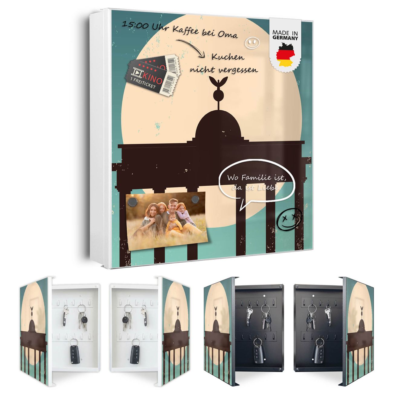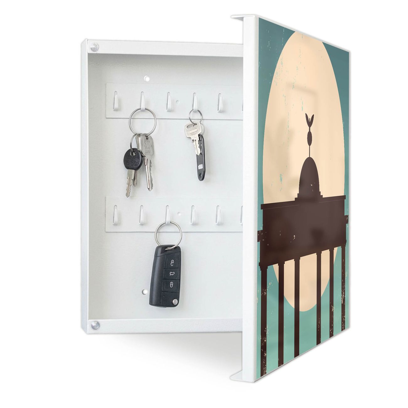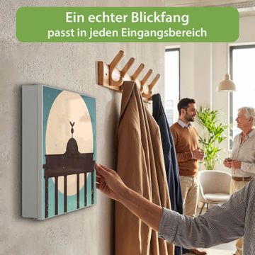 Bringe Ordnung und Eleganz in deinen Eingangsbereich mit dem banjado Schlüsselkasten Motiv Motiv City Poster Berlin. Die moderne Schlüsselbox kombiniert funktionales Design mit hochwertiger Verarbeitung und wird so zu einem echten Hingucker in Flur, Büro oder Ferienwohnung. ✅ Stilvolle Schlüsselaufbewahrung mit Motiv Motiv City Poster Berlin Der Design-Schlüsselkasten Motiv Motiv City Poster Berlin bietet Platz für bis zu 32 Schlüssel, die auf 4 stabilen Reihen mit je 8 Haken übersichtlich verstaut werden. Mit seinen kompakten Maßen von 30 x 30 x 5 cm passt die Schlüsselbox perfekt auch in kleinere Räume. Der weiß lackierte Stahlkorpus mit rechts angeschlagenem Türscharnier harmoniert mit gedruckten Folie auf der Front und fügt sich nahtlos in jedes Wohnambiente ein. Ob als Schlüsselorganizer für Zuhause oder als praktische Lösung für Büros, Praxen und Gewerbe, der banjado Schlüsselkasten sorgt für Ordnung und Übersicht. Dank der magnetischen, mit Kreidestiften beschreibbaren Folie auf der Front kannst du Notizen anheften oder Termine direkt auf der Oberfläche festhalten. Die Schlüsselbox Motiv Motiv City Poster Berlin zur Wandmontage wird inklusive Befestigungsmaterial geliefert und ist schnell angebracht. So hast du deine Schlüssel jederzeit griffbereit und zugleich stilvoll verstaut. Mit diesem banjado Schlüsselkasten Motiv Motiv City Poster Berlin kombinierst du praktische Aufbewahrung mit stilvollem Wohndesign. Ob privat oder geschäftlich, die Schlüsselbox sorgt für mehr Ordnung, Übersicht und ein wohnliches Ambiente.Vorteile im Überblick