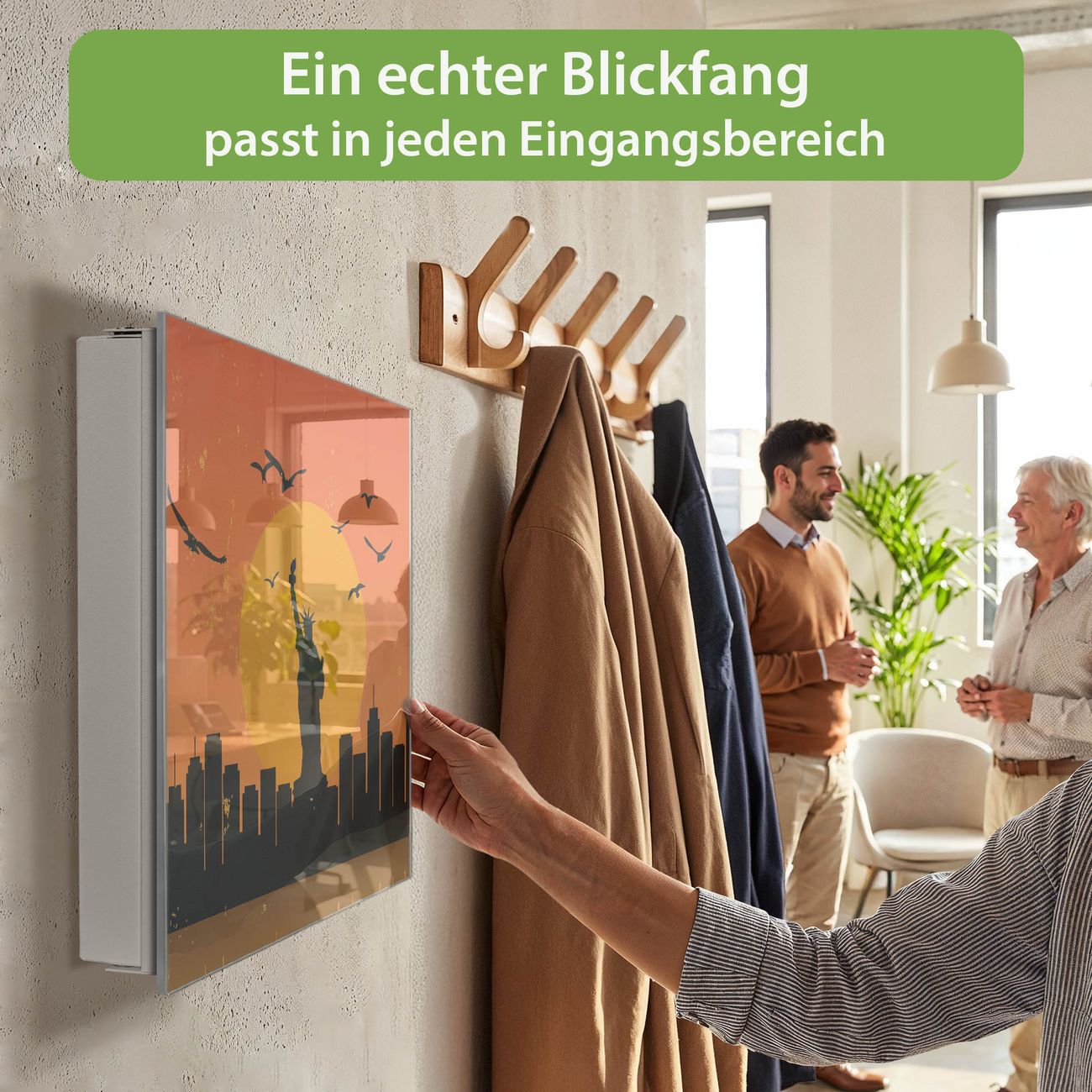 Bringe Ordnung und Eleganz in deinen Eingangsbereich mit dem banjado Schlüsselkasten Motiv Motiv City Poster New York. Die moderne Schlüsselbox kombiniert funktionales Design mit hochwertiger Verarbeitung und wird so zu einem echten Hingucker in Flur, Büro oder Ferienwohnung. ✅ Stilvolle Schlüsselaufbewahrung mit Glasfront im Motiv Motiv City Poster New York Der Design-Schlüsselkasten Motiv Motiv City Poster New York bietet Platz für bis zu 50 Schlüssel, die auf 5 stabilen Reihen mit je 10 Haken übersichtlich verstaut werden. Mit seinen kompakten Maßen von 30 x 30 x 5 cm passt die Schlüsselbox perfekt auch in kleinere Räume. Der weiß lackierte Stahlkorpus mit rechts angeschlagenem Türscharnier harmoniert mit der Glasfront und fügt sich nahtlos in jedes Wohnambiente ein. Ob als Schlüsselorganizer für Zuhause oder als praktische Lösung für Büros, Praxen und Gewerbe, der banjado Schlüsselkasten sorgt für Ordnung und Übersicht. Dank der magnetischen, mit Kreidestiften beschreibbaren Glasfront kannst du Notizen anheften oder Termine direkt auf der Oberfläche festhalten. Die Schlüsselbox Motiv Motiv City Poster New York zur Wandmontage wird inklusive Befestigungsmaterial geliefert und ist schnell angebracht. So hast du deine Schlüssel jederzeit griffbereit und zugleich stilvoll verstaut. Mit diesem banjado Schlüsselkasten Motiv Motiv City Poster New York kombinierst du praktische Aufbewahrung mit stilvollem Wohndesign. Ob privat oder geschäftlich, die Schlüsselbox sorgt für mehr Ordnung, Übersicht und ein wohnliches Ambiente.Vorteile im Überblick