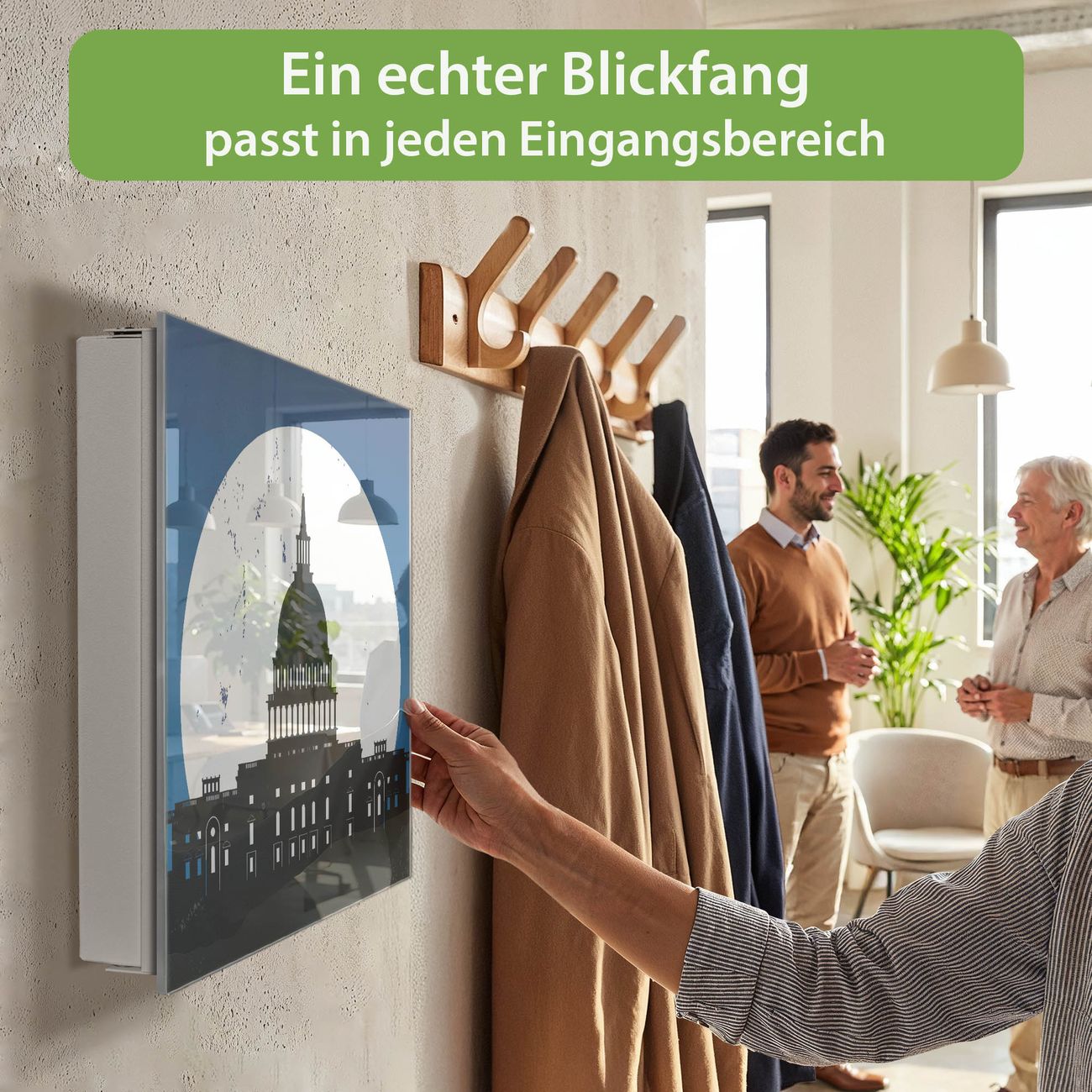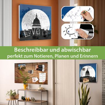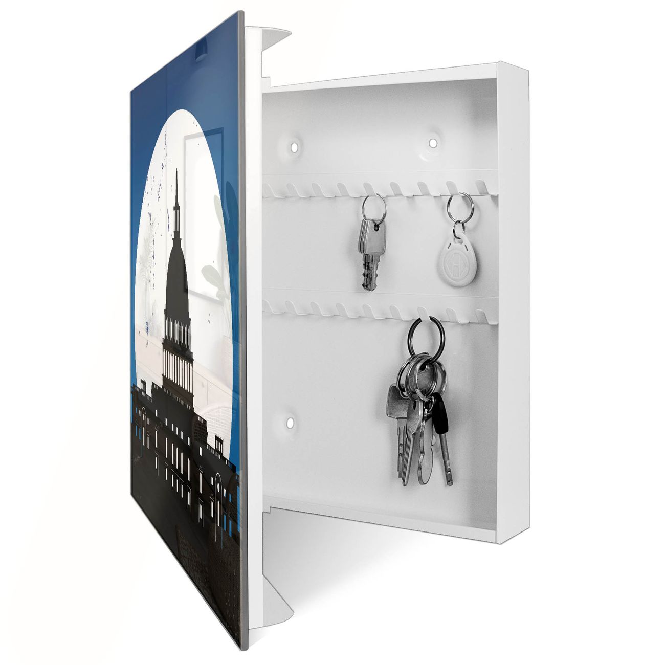 Bringe Ordnung und Eleganz in deinen Eingangsbereich mit dem banjado Schlüsselkasten Motiv Motiv City Poster Washington. Die moderne Schlüsselbox kombiniert funktionales Design mit hochwertiger Verarbeitung und wird so zu einem echten Hingucker in Flur, Büro oder Ferienwohnung. ✅ Stilvolle Schlüsselaufbewahrung mit Glasfront im Motiv Motiv City Poster Washington Der Design-Schlüsselkasten Motiv Motiv City Poster Washington bietet Platz für bis zu 50 Schlüssel, die auf 5 stabilen Reihen mit je 10 Haken übersichtlich verstaut werden. Mit seinen kompakten Maßen von 30 x 30 x 5 cm passt die Schlüsselbox perfekt auch in kleinere Räume. Der weiß lackierte Stahlkorpus mit rechts angeschlagenem Türscharnier harmoniert mit der Glasfront und fügt sich nahtlos in jedes Wohnambiente ein. Ob als Schlüsselorganizer für Zuhause oder als praktische Lösung für Büros, Praxen und Gewerbe, der banjado Schlüsselkasten sorgt für Ordnung und Übersicht. Dank der magnetischen, mit Kreidestiften beschreibbaren Glasfront kannst du Notizen anheften oder Termine direkt auf der Oberfläche festhalten. Die Schlüsselbox Motiv Motiv City Poster Washington zur Wandmontage wird inklusive Befestigungsmaterial geliefert und ist schnell angebracht. So hast du deine Schlüssel jederzeit griffbereit und zugleich stilvoll verstaut. Mit diesem banjado Schlüsselkasten Motiv Motiv City Poster Washington kombinierst du praktische Aufbewahrung mit stilvollem Wohndesign. Ob privat oder geschäftlich, die Schlüsselbox sorgt für mehr Ordnung, Übersicht und ein wohnliches Ambiente.Vorteile im Überblick