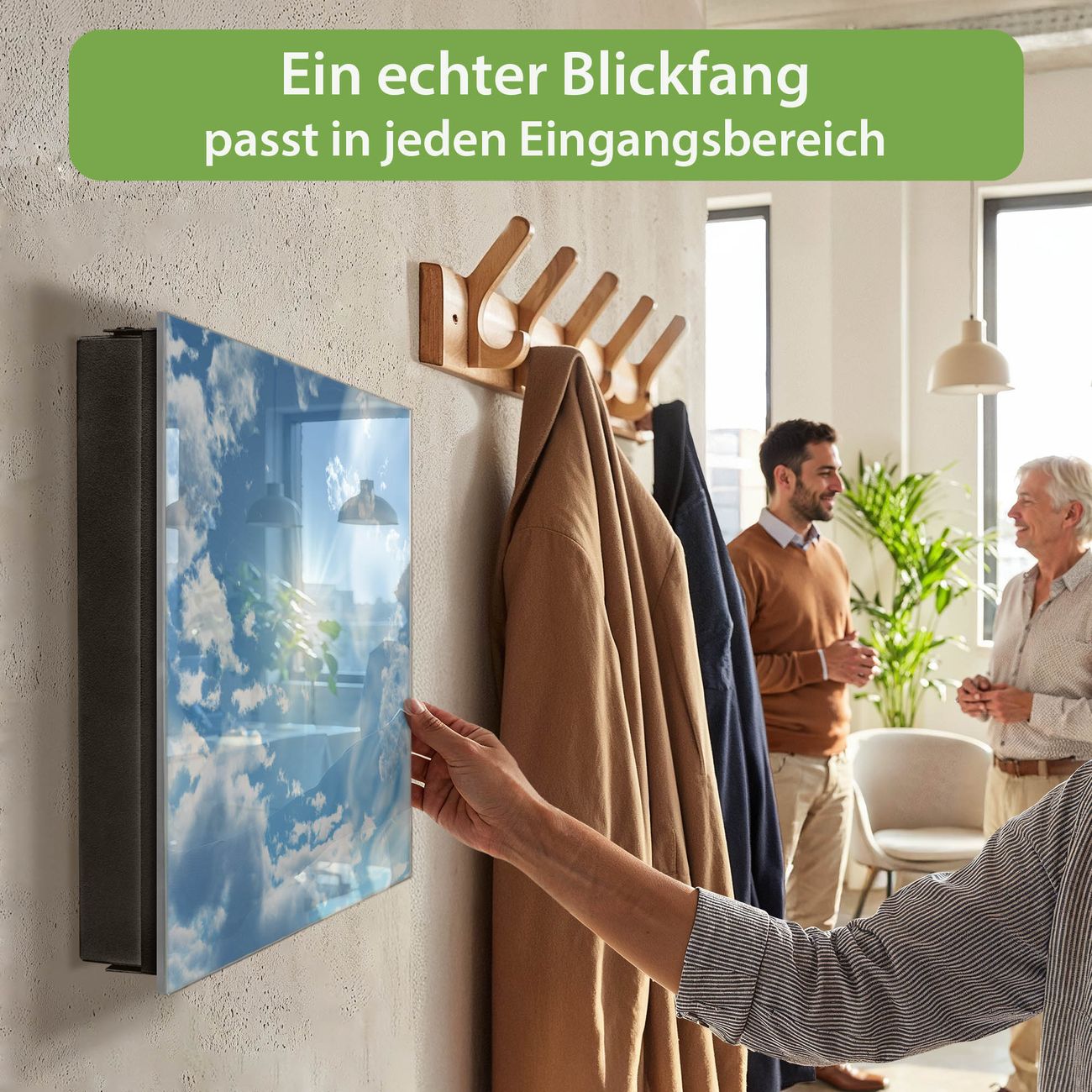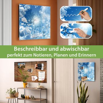 Bringe Ordnung und Eleganz in deinen Eingangsbereich mit dem banjado Schlüsselkasten Motiv Motiv Clouds. Die moderne Schlüsselbox kombiniert funktionales Design mit hochwertiger Verarbeitung und wird so zu einem echten Hingucker in Flur, Büro oder Ferienwohnung. ✅ Stilvolle Schlüsselaufbewahrung mit Glasfront im Motiv Motiv Clouds Der Design-Schlüsselkasten Motiv Motiv Clouds bietet Platz für bis zu 50 Schlüssel, die auf 5 stabilen Reihen mit je 10 Haken übersichtlich verstaut werden. Mit seinen kompakten Maßen von 30 x 30 x 5 cm passt die Schlüsselbox perfekt auch in kleinere Räume. Der schwarz lackierte Stahlkorpus mit rechts angeschlagenem Türscharnier harmoniert mit der Glasfront und fügt sich nahtlos in jedes Wohnambiente ein. Ob als Schlüsselorganizer für Zuhause oder als praktische Lösung für Büros, Praxen und Gewerbe, der banjado Schlüsselkasten sorgt für Ordnung und Übersicht. Dank der magnetischen, mit Kreidestiften beschreibbaren Glasfront kannst du Notizen anheften oder Termine direkt auf der Oberfläche festhalten. Die Schlüsselbox Motiv Motiv Clouds zur Wandmontage wird inklusive Befestigungsmaterial geliefert und ist schnell angebracht. So hast du deine Schlüssel jederzeit griffbereit und zugleich stilvoll verstaut. Mit diesem banjado Schlüsselkasten Motiv Motiv Clouds kombinierst du praktische Aufbewahrung mit stilvollem Wohndesign. Ob privat oder geschäftlich, die Schlüsselbox sorgt für mehr Ordnung, Übersicht und ein wohnliches Ambiente.Vorteile im Überblick