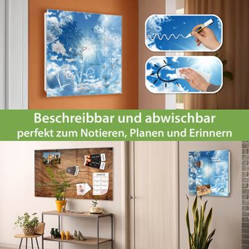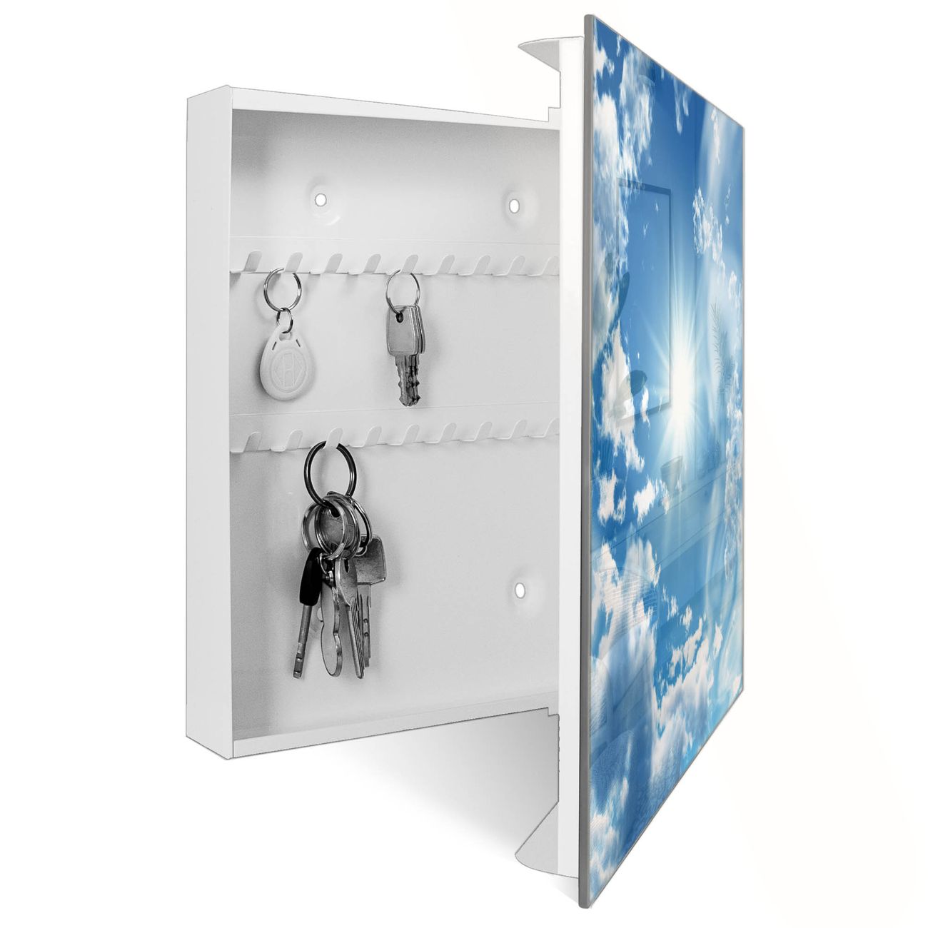 Bringe Ordnung und Eleganz in deinen Eingangsbereich mit dem banjado Schlüsselkasten Motiv Motiv Clouds. Die moderne Schlüsselbox kombiniert funktionales Design mit hochwertiger Verarbeitung und wird so zu einem echten Hingucker in Flur, Büro oder Ferienwohnung. ✅ Stilvolle Schlüsselaufbewahrung mit Glasfront im Motiv Motiv Clouds Der Design-Schlüsselkasten Motiv Motiv Clouds bietet Platz für bis zu 50 Schlüssel, die auf 5 stabilen Reihen mit je 10 Haken übersichtlich verstaut werden. Mit seinen kompakten Maßen von 30 x 30 x 5 cm passt die Schlüsselbox perfekt auch in kleinere Räume. Der weiß lackierte Stahlkorpus mit rechts angeschlagenem Türscharnier harmoniert mit der Glasfront und fügt sich nahtlos in jedes Wohnambiente ein. Ob als Schlüsselorganizer für Zuhause oder als praktische Lösung für Büros, Praxen und Gewerbe, der banjado Schlüsselkasten sorgt für Ordnung und Übersicht. Dank der magnetischen, mit Kreidestiften beschreibbaren Glasfront kannst du Notizen anheften oder Termine direkt auf der Oberfläche festhalten. Die Schlüsselbox Motiv Motiv Clouds zur Wandmontage wird inklusive Befestigungsmaterial geliefert und ist schnell angebracht. So hast du deine Schlüssel jederzeit griffbereit und zugleich stilvoll verstaut. Mit diesem banjado Schlüsselkasten Motiv Motiv Clouds kombinierst du praktische Aufbewahrung mit stilvollem Wohndesign. Ob privat oder geschäftlich, die Schlüsselbox sorgt für mehr Ordnung, Übersicht und ein wohnliches Ambiente.Vorteile im Überblick