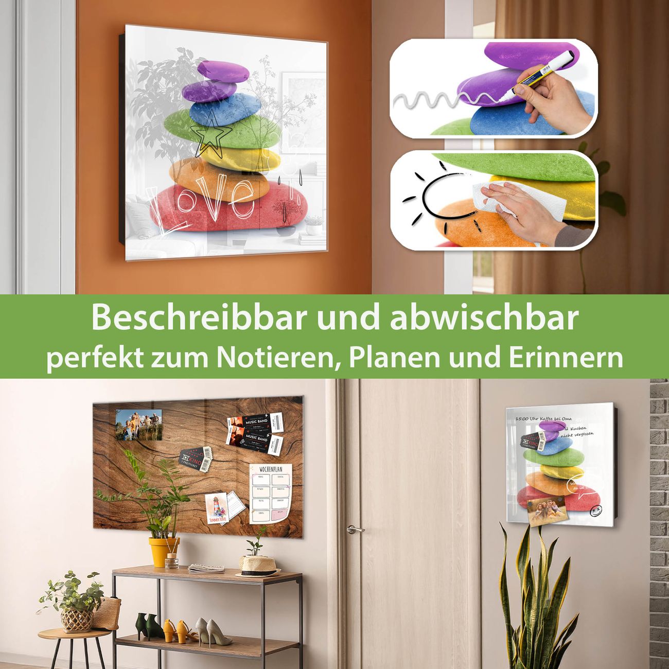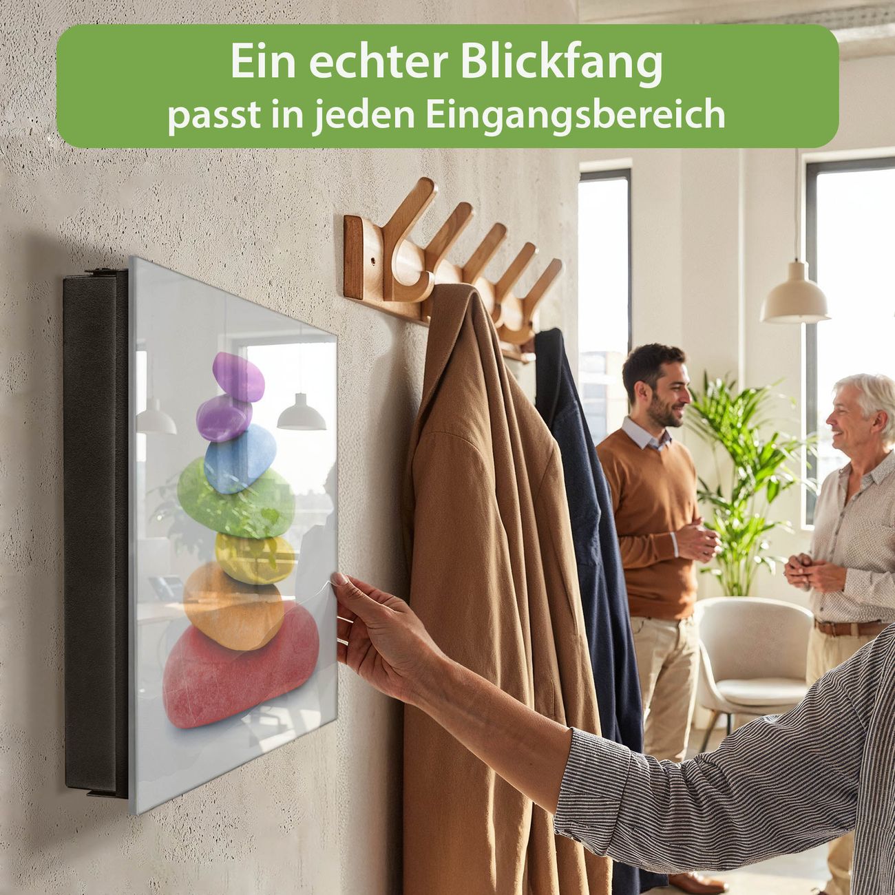 Bringe Ordnung und Eleganz in deinen Eingangsbereich mit dem banjado Schlüsselkasten Motiv Motiv Coloured Stone. Die moderne Schlüsselbox kombiniert funktionales Design mit hochwertiger Verarbeitung und wird so zu einem echten Hingucker in Flur, Büro oder Ferienwohnung. ✅ Stilvolle Schlüsselaufbewahrung mit Glasfront im Motiv Motiv Coloured Stone Der Design-Schlüsselkasten Motiv Motiv Coloured Stone bietet Platz für bis zu 50 Schlüssel, die auf 5 stabilen Reihen mit je 10 Haken übersichtlich verstaut werden. Mit seinen kompakten Maßen von 30 x 30 x 5 cm passt die Schlüsselbox perfekt auch in kleinere Räume. Der schwarz lackierte Stahlkorpus mit rechts angeschlagenem Türscharnier harmoniert mit der Glasfront und fügt sich nahtlos in jedes Wohnambiente ein. Ob als Schlüsselorganizer für Zuhause oder als praktische Lösung für Büros, Praxen und Gewerbe, der banjado Schlüsselkasten sorgt für Ordnung und Übersicht. Dank der magnetischen, mit Kreidestiften beschreibbaren Glasfront kannst du Notizen anheften oder Termine direkt auf der Oberfläche festhalten. Die Schlüsselbox Motiv Motiv Coloured Stone zur Wandmontage wird inklusive Befestigungsmaterial geliefert und ist schnell angebracht. So hast du deine Schlüssel jederzeit griffbereit und zugleich stilvoll verstaut. Mit diesem banjado Schlüsselkasten Motiv Motiv Coloured Stone kombinierst du praktische Aufbewahrung mit stilvollem Wohndesign. Ob privat oder geschäftlich, die Schlüsselbox sorgt für mehr Ordnung, Übersicht und ein wohnliches Ambiente.Vorteile im Überblick