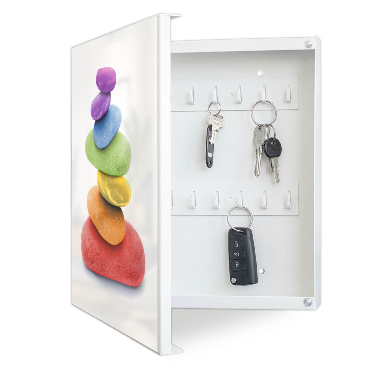 Bringe Ordnung und Eleganz in deinen Eingangsbereich mit dem banjado Schlüsselkasten Motiv Motiv Coloured Stone. Die moderne Schlüsselbox kombiniert funktionales Design mit hochwertiger Verarbeitung und wird so zu einem echten Hingucker in Flur, Büro oder Ferienwohnung. ✅ Stilvolle Schlüsselaufbewahrung mit Motiv Motiv Coloured Stone Der Design-Schlüsselkasten Motiv Motiv Coloured Stone bietet Platz für bis zu 32 Schlüssel, die auf 4 stabilen Reihen mit je 8 Haken übersichtlich verstaut werden. Mit seinen kompakten Maßen von 30 x 30 x 5 cm passt die Schlüsselbox perfekt auch in kleinere Räume. Der weiß lackierte Stahlkorpus mit links angeschlagenem Türscharnier harmoniert mit gedruckten Folie auf der Front und fügt sich nahtlos in jedes Wohnambiente ein. Ob als Schlüsselorganizer für Zuhause oder als praktische Lösung für Büros, Praxen und Gewerbe, der banjado Schlüsselkasten sorgt für Ordnung und Übersicht. Dank der magnetischen, mit Kreidestiften beschreibbaren Folie auf der Front kannst du Notizen anheften oder Termine direkt auf der Oberfläche festhalten. Die Schlüsselbox Motiv Motiv Coloured Stone zur Wandmontage wird inklusive Befestigungsmaterial geliefert und ist schnell angebracht. So hast du deine Schlüssel jederzeit griffbereit und zugleich stilvoll verstaut. Mit diesem banjado Schlüsselkasten Motiv Motiv Coloured Stone kombinierst du praktische Aufbewahrung mit stilvollem Wohndesign. Ob privat oder geschäftlich, die Schlüsselbox sorgt für mehr Ordnung, Übersicht und ein wohnliches Ambiente.Vorteile im Überblick