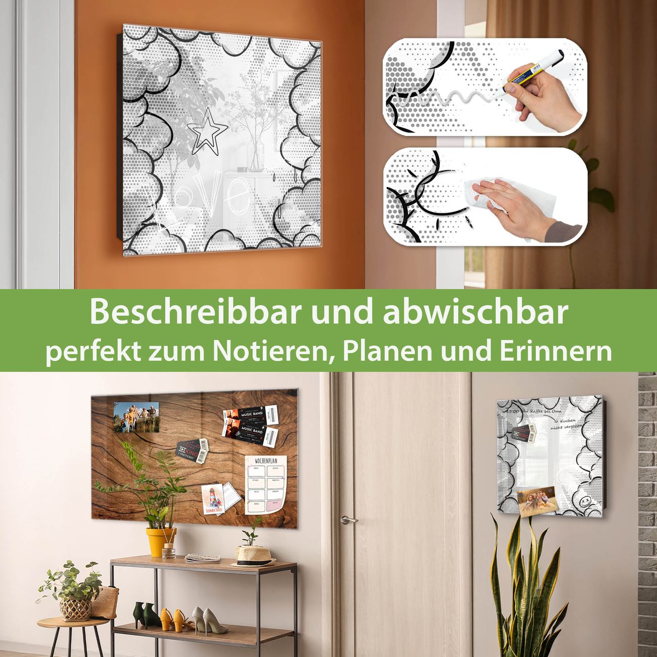 Bringe Ordnung und Eleganz in deinen Eingangsbereich mit dem banjado Schlüsselkasten Motiv Motiv Comic Explosion. Die moderne Schlüsselbox kombiniert funktionales Design mit hochwertiger Verarbeitung und wird so zu einem echten Hingucker in Flur, Büro oder Ferienwohnung. ✅ Stilvolle Schlüsselaufbewahrung mit Glasfront im Motiv Motiv Comic Explosion Der Design-Schlüsselkasten Motiv Motiv Comic Explosion bietet Platz für bis zu 50 Schlüssel, die auf 5 stabilen Reihen mit je 10 Haken übersichtlich verstaut werden. Mit seinen kompakten Maßen von 30 x 30 x 5 cm passt die Schlüsselbox perfekt auch in kleinere Räume. Der schwarz lackierte Stahlkorpus mit rechts angeschlagenem Türscharnier harmoniert mit der Glasfront und fügt sich nahtlos in jedes Wohnambiente ein. Ob als Schlüsselorganizer für Zuhause oder als praktische Lösung für Büros, Praxen und Gewerbe, der banjado Schlüsselkasten sorgt für Ordnung und Übersicht. Dank der magnetischen, mit Kreidestiften beschreibbaren Glasfront kannst du Notizen anheften oder Termine direkt auf der Oberfläche festhalten. Die Schlüsselbox Motiv Motiv Comic Explosion zur Wandmontage wird inklusive Befestigungsmaterial geliefert und ist schnell angebracht. So hast du deine Schlüssel jederzeit griffbereit und zugleich stilvoll verstaut. Mit diesem banjado Schlüsselkasten Motiv Motiv Comic Explosion kombinierst du praktische Aufbewahrung mit stilvollem Wohndesign. Ob privat oder geschäftlich, die Schlüsselbox sorgt für mehr Ordnung, Übersicht und ein wohnliches Ambiente.Vorteile im Überblick