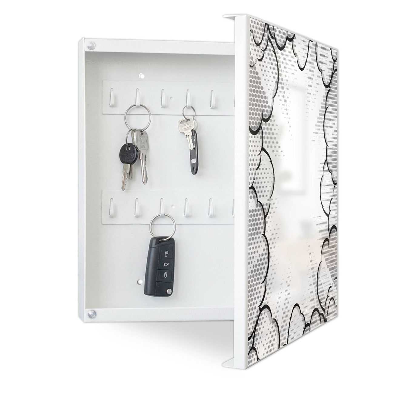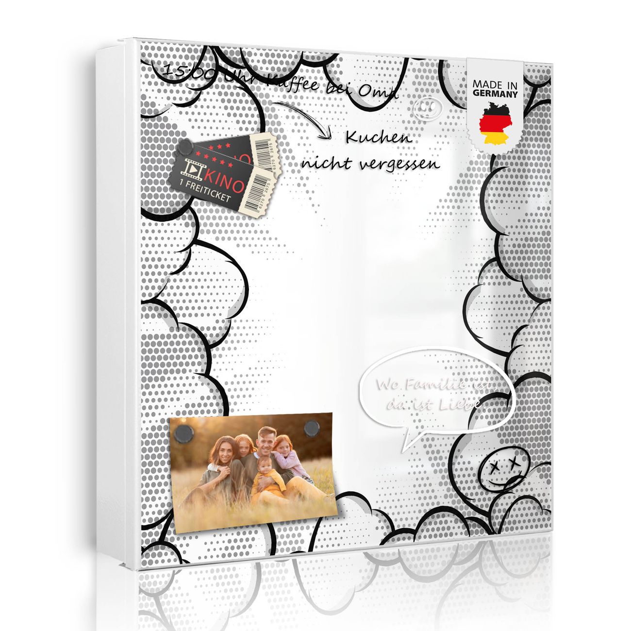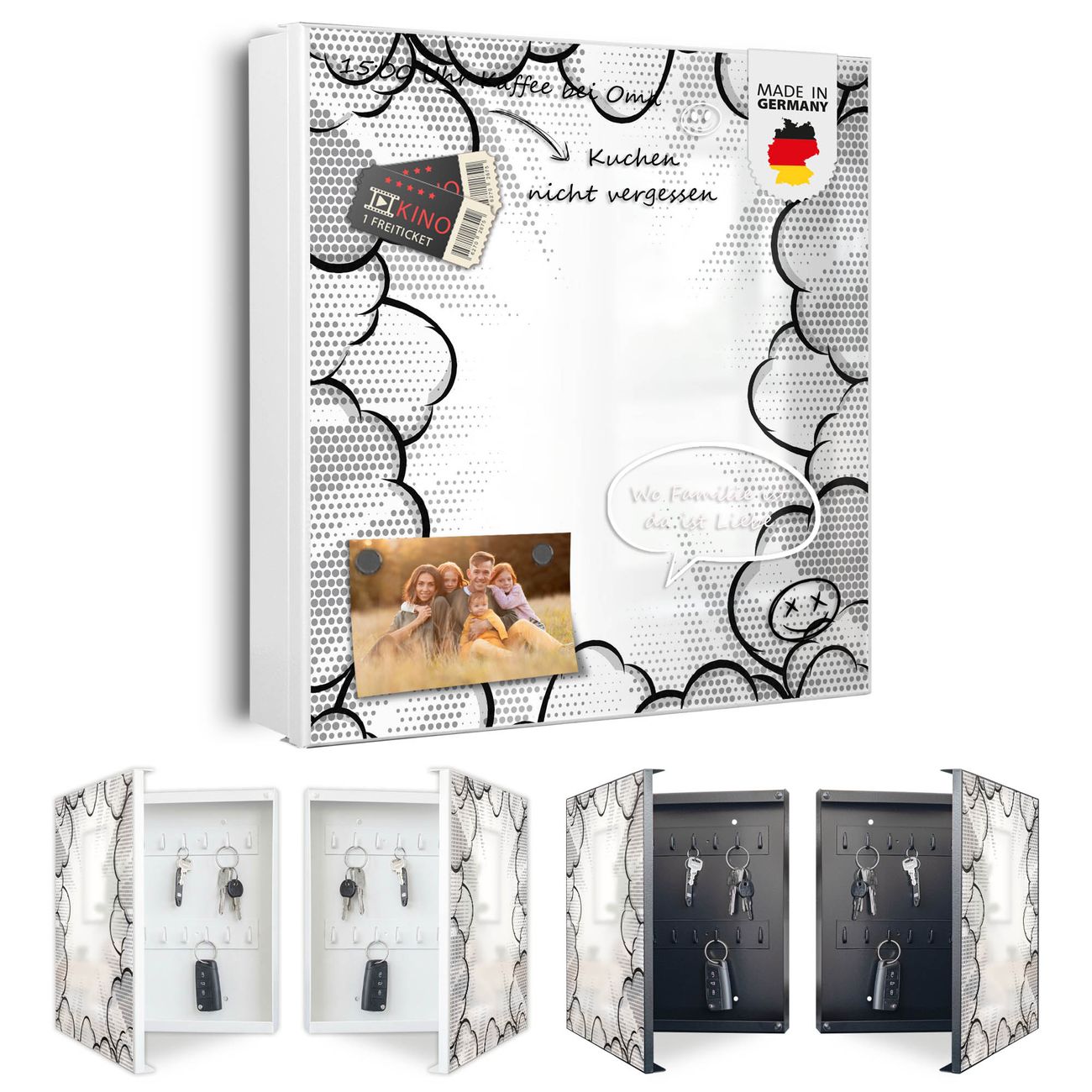 Bringe Ordnung und Eleganz in deinen Eingangsbereich mit dem banjado Schlüsselkasten Motiv Motiv Comic Explosion. Die moderne Schlüsselbox kombiniert funktionales Design mit hochwertiger Verarbeitung und wird so zu einem echten Hingucker in Flur, Büro oder Ferienwohnung. ✅ Stilvolle Schlüsselaufbewahrung mit Motiv Motiv Comic Explosion Der Design-Schlüsselkasten Motiv Motiv Comic Explosion bietet Platz für bis zu 32 Schlüssel, die auf 4 stabilen Reihen mit je 8 Haken übersichtlich verstaut werden. Mit seinen kompakten Maßen von 30 x 30 x 5 cm passt die Schlüsselbox perfekt auch in kleinere Räume. Der weiß lackierte Stahlkorpus mit rechts angeschlagenem Türscharnier harmoniert mit gedruckten Folie auf der Front und fügt sich nahtlos in jedes Wohnambiente ein. Ob als Schlüsselorganizer für Zuhause oder als praktische Lösung für Büros, Praxen und Gewerbe, der banjado Schlüsselkasten sorgt für Ordnung und Übersicht. Dank der magnetischen, mit Kreidestiften beschreibbaren Folie auf der Front kannst du Notizen anheften oder Termine direkt auf der Oberfläche festhalten. Die Schlüsselbox Motiv Motiv Comic Explosion zur Wandmontage wird inklusive Befestigungsmaterial geliefert und ist schnell angebracht. So hast du deine Schlüssel jederzeit griffbereit und zugleich stilvoll verstaut. Mit diesem banjado Schlüsselkasten Motiv Motiv Comic Explosion kombinierst du praktische Aufbewahrung mit stilvollem Wohndesign. Ob privat oder geschäftlich, die Schlüsselbox sorgt für mehr Ordnung, Übersicht und ein wohnliches Ambiente.Vorteile im Überblick