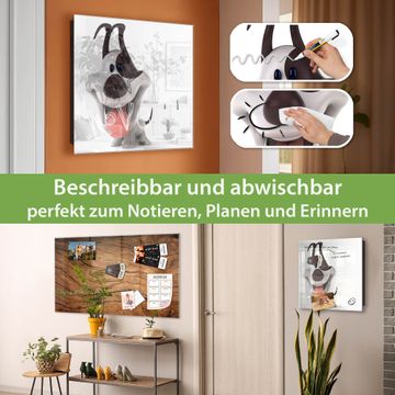 Bringe Ordnung und Eleganz in deinen Eingangsbereich mit dem banjado Schlüsselkasten Motiv Motiv Comic-Hund. Die moderne Schlüsselbox kombiniert funktionales Design mit hochwertiger Verarbeitung und wird so zu einem echten Hingucker in Flur, Büro oder Ferienwohnung. ✅ Stilvolle Schlüsselaufbewahrung mit Glasfront im Motiv Motiv Comic-Hund Der Design-Schlüsselkasten Motiv Motiv Comic-Hund bietet Platz für bis zu 50 Schlüssel, die auf 5 stabilen Reihen mit je 10 Haken übersichtlich verstaut werden. Mit seinen kompakten Maßen von 30 x 30 x 5 cm passt die Schlüsselbox perfekt auch in kleinere Räume. Der schwarz lackierte Stahlkorpus mit rechts angeschlagenem Türscharnier harmoniert mit der Glasfront und fügt sich nahtlos in jedes Wohnambiente ein. Ob als Schlüsselorganizer für Zuhause oder als praktische Lösung für Büros, Praxen und Gewerbe, der banjado Schlüsselkasten sorgt für Ordnung und Übersicht. Dank der magnetischen, mit Kreidestiften beschreibbaren Glasfront kannst du Notizen anheften oder Termine direkt auf der Oberfläche festhalten. Die Schlüsselbox Motiv Motiv Comic-Hund zur Wandmontage wird inklusive Befestigungsmaterial geliefert und ist schnell angebracht. So hast du deine Schlüssel jederzeit griffbereit und zugleich stilvoll verstaut. Mit diesem banjado Schlüsselkasten Motiv Motiv Comic-Hund kombinierst du praktische Aufbewahrung mit stilvollem Wohndesign. Ob privat oder geschäftlich, die Schlüsselbox sorgt für mehr Ordnung, Übersicht und ein wohnliches Ambiente.Vorteile im Überblick