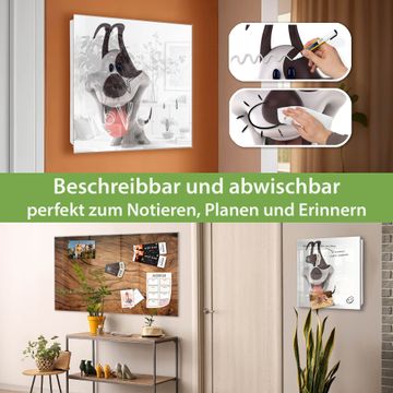 Bringe Ordnung und Eleganz in deinen Eingangsbereich mit dem banjado Schlüsselkasten Motiv Motiv Comic-Hund. Die moderne Schlüsselbox kombiniert funktionales Design mit hochwertiger Verarbeitung und wird so zu einem echten Hingucker in Flur, Büro oder Ferienwohnung. ✅ Stilvolle Schlüsselaufbewahrung mit Glasfront im Motiv Motiv Comic-Hund Der Design-Schlüsselkasten Motiv Motiv Comic-Hund bietet Platz für bis zu 50 Schlüssel, die auf 5 stabilen Reihen mit je 10 Haken übersichtlich verstaut werden. Mit seinen kompakten Maßen von 30 x 30 x 5 cm passt die Schlüsselbox perfekt auch in kleinere Räume. Der weiß lackierte Stahlkorpus mit rechts angeschlagenem Türscharnier harmoniert mit der Glasfront und fügt sich nahtlos in jedes Wohnambiente ein. Ob als Schlüsselorganizer für Zuhause oder als praktische Lösung für Büros, Praxen und Gewerbe, der banjado Schlüsselkasten sorgt für Ordnung und Übersicht. Dank der magnetischen, mit Kreidestiften beschreibbaren Glasfront kannst du Notizen anheften oder Termine direkt auf der Oberfläche festhalten. Die Schlüsselbox Motiv Motiv Comic-Hund zur Wandmontage wird inklusive Befestigungsmaterial geliefert und ist schnell angebracht. So hast du deine Schlüssel jederzeit griffbereit und zugleich stilvoll verstaut. Mit diesem banjado Schlüsselkasten Motiv Motiv Comic-Hund kombinierst du praktische Aufbewahrung mit stilvollem Wohndesign. Ob privat oder geschäftlich, die Schlüsselbox sorgt für mehr Ordnung, Übersicht und ein wohnliches Ambiente.Vorteile im Überblick