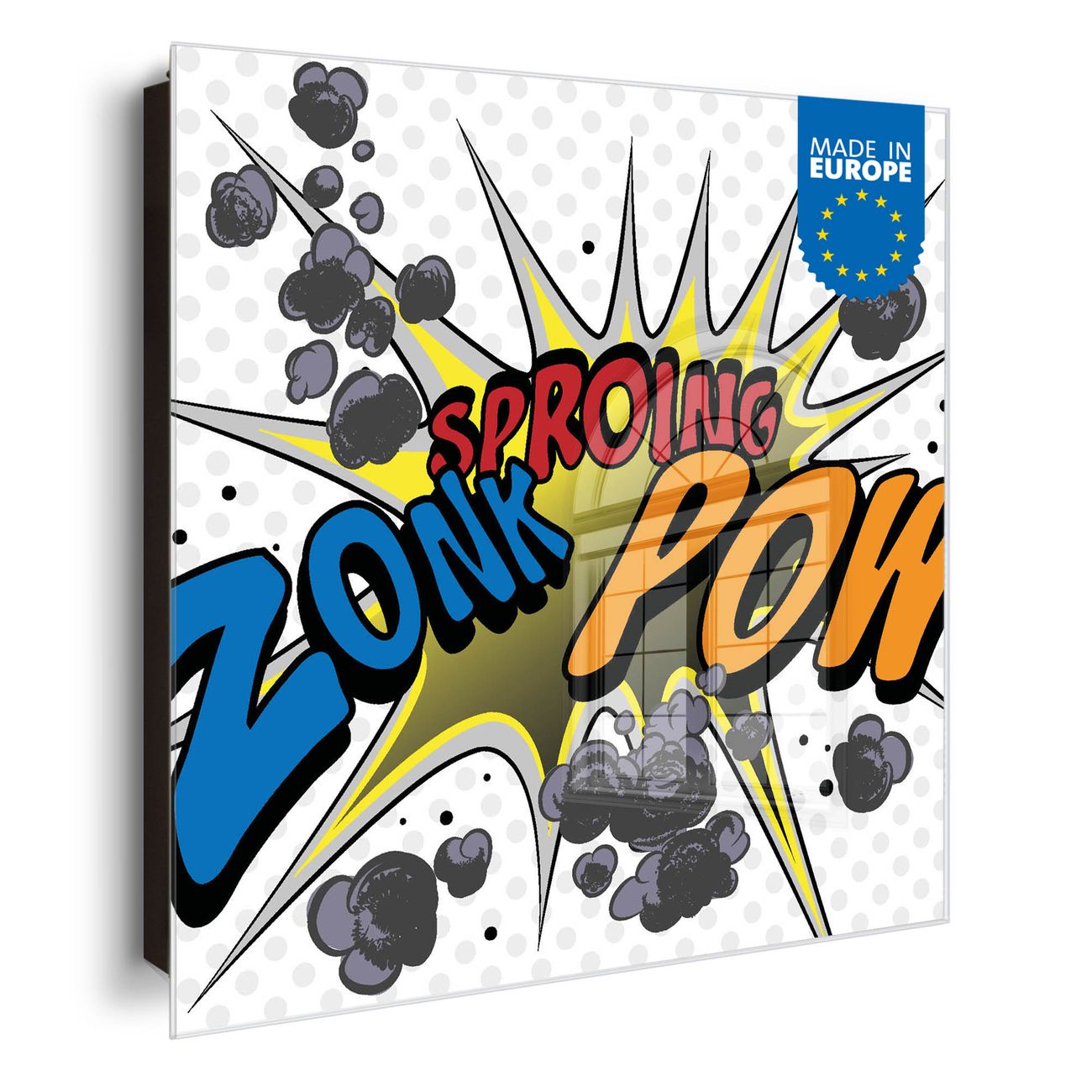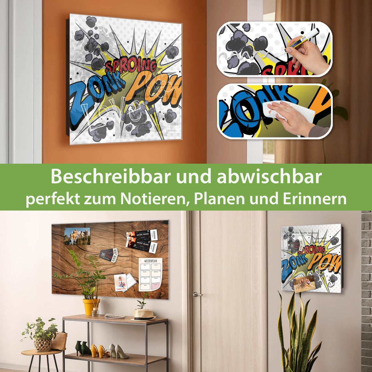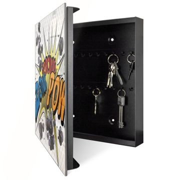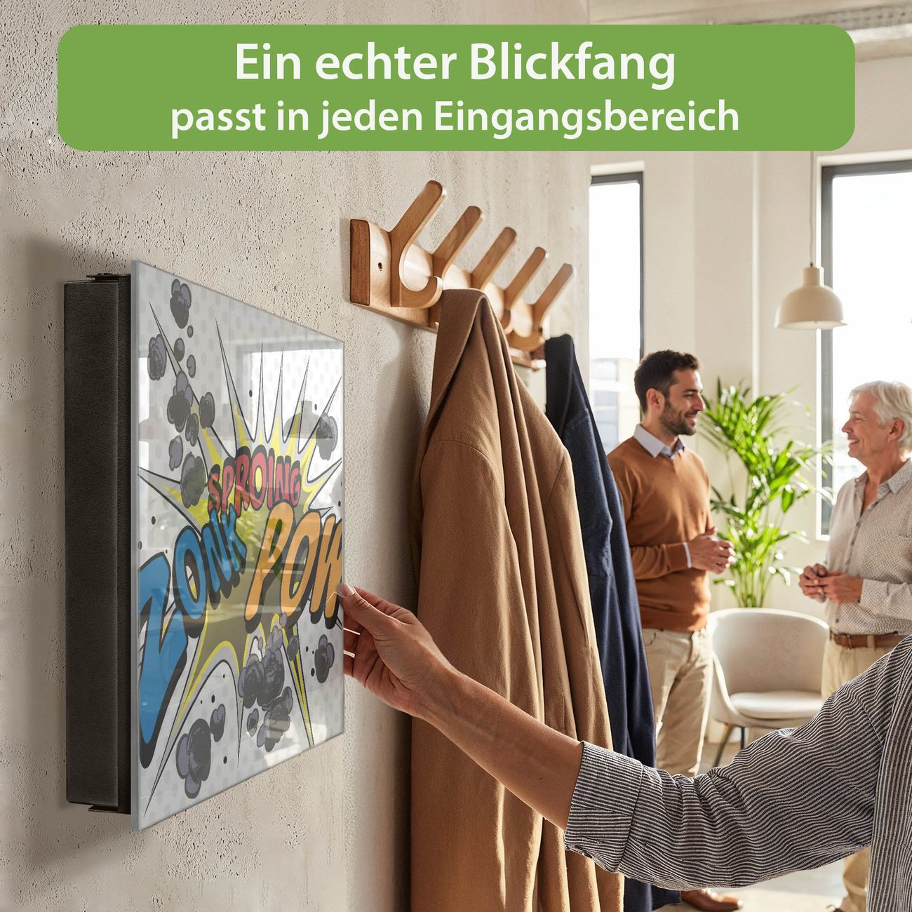 Bringe Ordnung und Eleganz in deinen Eingangsbereich mit dem banjado Schlüsselkasten Motiv Motiv Comic. Die moderne Schlüsselbox kombiniert funktionales Design mit hochwertiger Verarbeitung und wird so zu einem echten Hingucker in Flur, Büro oder Ferienwohnung. ✅ Stilvolle Schlüsselaufbewahrung mit Glasfront im Motiv Motiv Comic Der Design-Schlüsselkasten Motiv Motiv Comic bietet Platz für bis zu 50 Schlüssel, die auf 5 stabilen Reihen mit je 10 Haken übersichtlich verstaut werden. Mit seinen kompakten Maßen von 30 x 30 x 5 cm passt die Schlüsselbox perfekt auch in kleinere Räume. Der schwarz lackierte Stahlkorpus mit rechts angeschlagenem Türscharnier harmoniert mit der Glasfront und fügt sich nahtlos in jedes Wohnambiente ein. Ob als Schlüsselorganizer für Zuhause oder als praktische Lösung für Büros, Praxen und Gewerbe, der banjado Schlüsselkasten sorgt für Ordnung und Übersicht. Dank der magnetischen, mit Kreidestiften beschreibbaren Glasfront kannst du Notizen anheften oder Termine direkt auf der Oberfläche festhalten. Die Schlüsselbox Motiv Motiv Comic zur Wandmontage wird inklusive Befestigungsmaterial geliefert und ist schnell angebracht. So hast du deine Schlüssel jederzeit griffbereit und zugleich stilvoll verstaut. Mit diesem banjado Schlüsselkasten Motiv Motiv Comic kombinierst du praktische Aufbewahrung mit stilvollem Wohndesign. Ob privat oder geschäftlich, die Schlüsselbox sorgt für mehr Ordnung, Übersicht und ein wohnliches Ambiente.Vorteile im Überblick