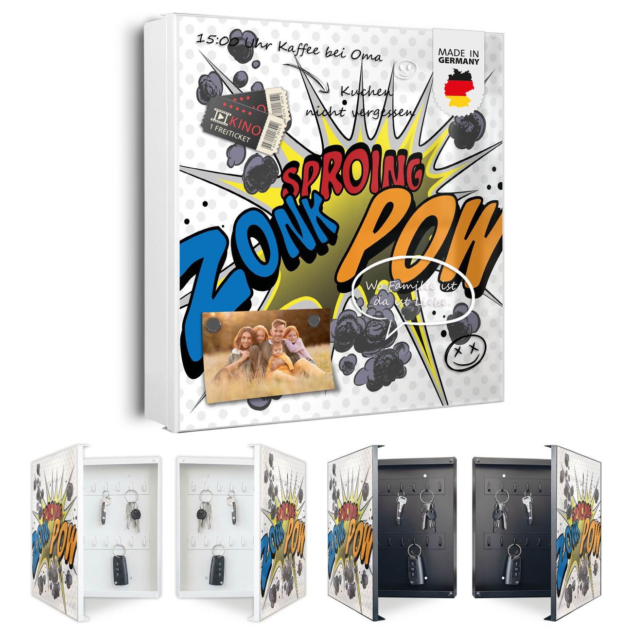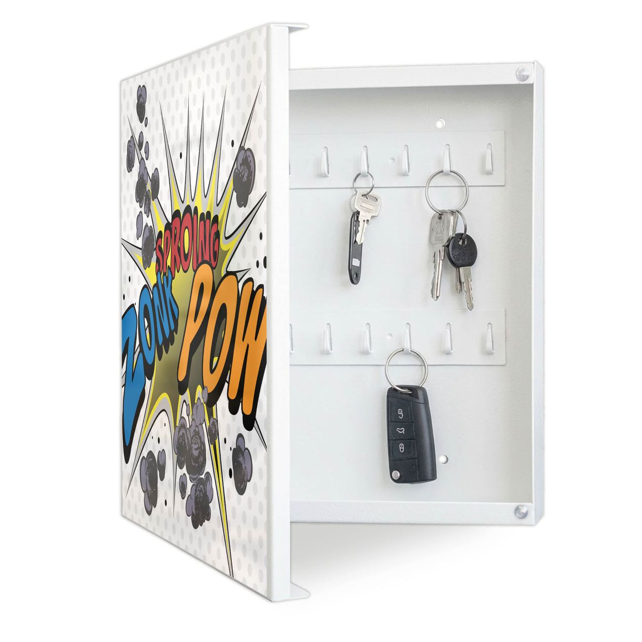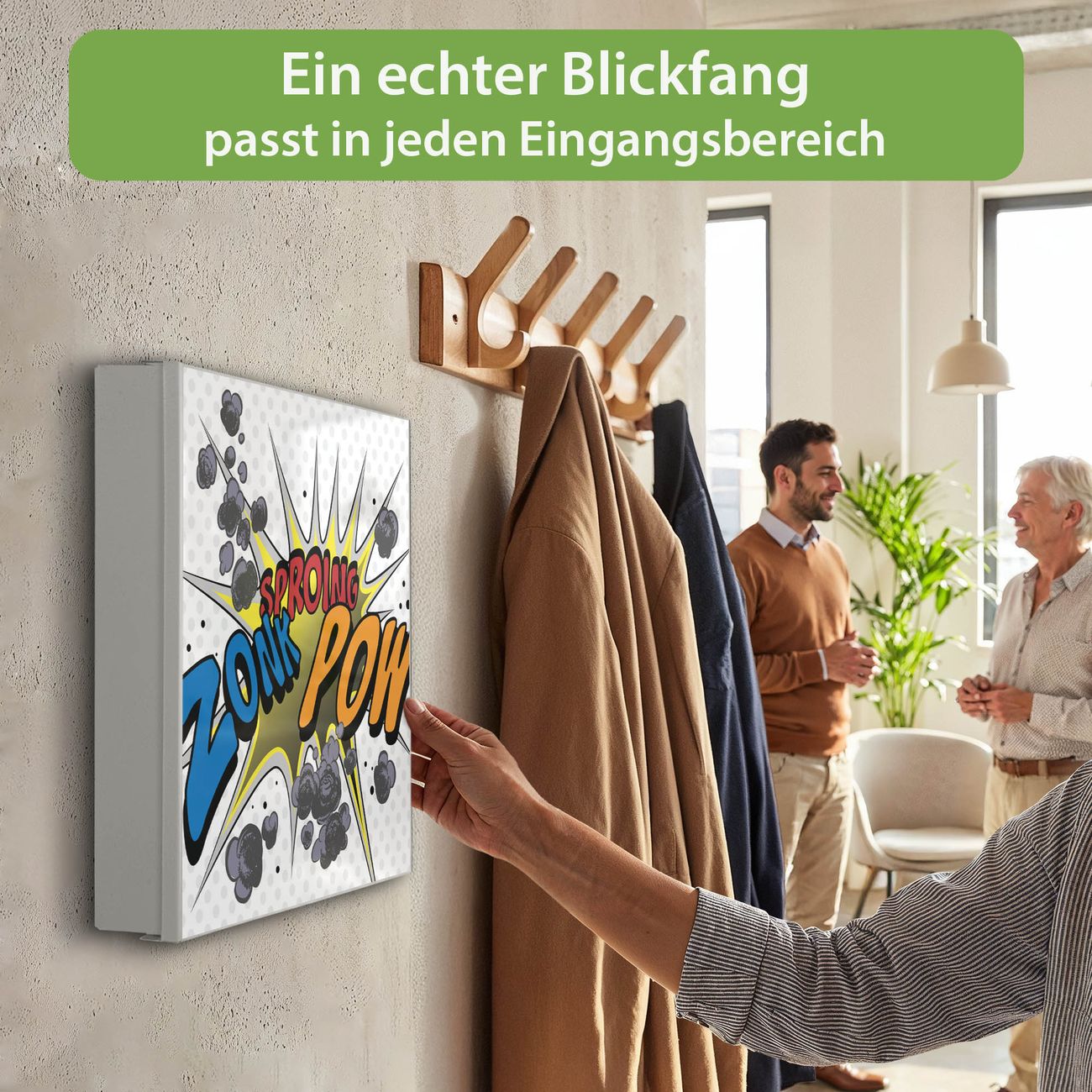 Bringe Ordnung und Eleganz in deinen Eingangsbereich mit dem banjado Schlüsselkasten Motiv Motiv Comic. Die moderne Schlüsselbox kombiniert funktionales Design mit hochwertiger Verarbeitung und wird so zu einem echten Hingucker in Flur, Büro oder Ferienwohnung. ✅ Stilvolle Schlüsselaufbewahrung mit Motiv Motiv Comic Der Design-Schlüsselkasten Motiv Motiv Comic bietet Platz für bis zu 32 Schlüssel, die auf 4 stabilen Reihen mit je 8 Haken übersichtlich verstaut werden. Mit seinen kompakten Maßen von 30 x 30 x 5 cm passt die Schlüsselbox perfekt auch in kleinere Räume. Der weiß lackierte Stahlkorpus mit links angeschlagenem Türscharnier harmoniert mit gedruckten Folie auf der Front und fügt sich nahtlos in jedes Wohnambiente ein. Ob als Schlüsselorganizer für Zuhause oder als praktische Lösung für Büros, Praxen und Gewerbe, der banjado Schlüsselkasten sorgt für Ordnung und Übersicht. Dank der magnetischen, mit Kreidestiften beschreibbaren Folie auf der Front kannst du Notizen anheften oder Termine direkt auf der Oberfläche festhalten. Die Schlüsselbox Motiv Motiv Comic zur Wandmontage wird inklusive Befestigungsmaterial geliefert und ist schnell angebracht. So hast du deine Schlüssel jederzeit griffbereit und zugleich stilvoll verstaut. Mit diesem banjado Schlüsselkasten Motiv Motiv Comic kombinierst du praktische Aufbewahrung mit stilvollem Wohndesign. Ob privat oder geschäftlich, die Schlüsselbox sorgt für mehr Ordnung, Übersicht und ein wohnliches Ambiente.Vorteile im Überblick