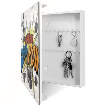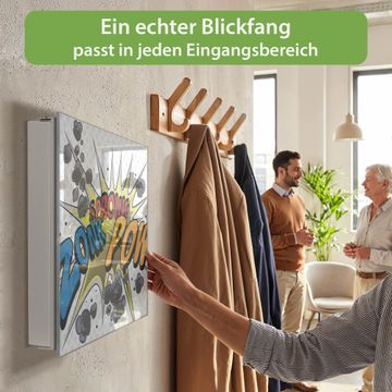Bringe Ordnung und Eleganz in deinen Eingangsbereich mit dem banjado Schlüsselkasten Motiv Motiv Comic. Die moderne Schlüsselbox kombiniert funktionales Design mit hochwertiger Verarbeitung und wird so zu einem echten Hingucker in Flur, Büro oder Ferienwohnung. ✅ Stilvolle Schlüsselaufbewahrung mit Glasfront im Motiv Motiv Comic Der Design-Schlüsselkasten Motiv Motiv Comic bietet Platz für bis zu 50 Schlüssel, die auf 5 stabilen Reihen mit je 10 Haken übersichtlich verstaut werden. Mit seinen kompakten Maßen von 30 x 30 x 5 cm passt die Schlüsselbox perfekt auch in kleinere Räume. Der weiß lackierte Stahlkorpus mit rechts angeschlagenem Türscharnier harmoniert mit der Glasfront und fügt sich nahtlos in jedes Wohnambiente ein. Ob als Schlüsselorganizer für Zuhause oder als praktische Lösung für Büros, Praxen und Gewerbe, der banjado Schlüsselkasten sorgt für Ordnung und Übersicht. Dank der magnetischen, mit Kreidestiften beschreibbaren Glasfront kannst du Notizen anheften oder Termine direkt auf der Oberfläche festhalten. Die Schlüsselbox Motiv Motiv Comic zur Wandmontage wird inklusive Befestigungsmaterial geliefert und ist schnell angebracht. So hast du deine Schlüssel jederzeit griffbereit und zugleich stilvoll verstaut. Mit diesem banjado Schlüsselkasten Motiv Motiv Comic kombinierst du praktische Aufbewahrung mit stilvollem Wohndesign. Ob privat oder geschäftlich, die Schlüsselbox sorgt für mehr Ordnung, Übersicht und ein wohnliches Ambiente.Vorteile im Überblick