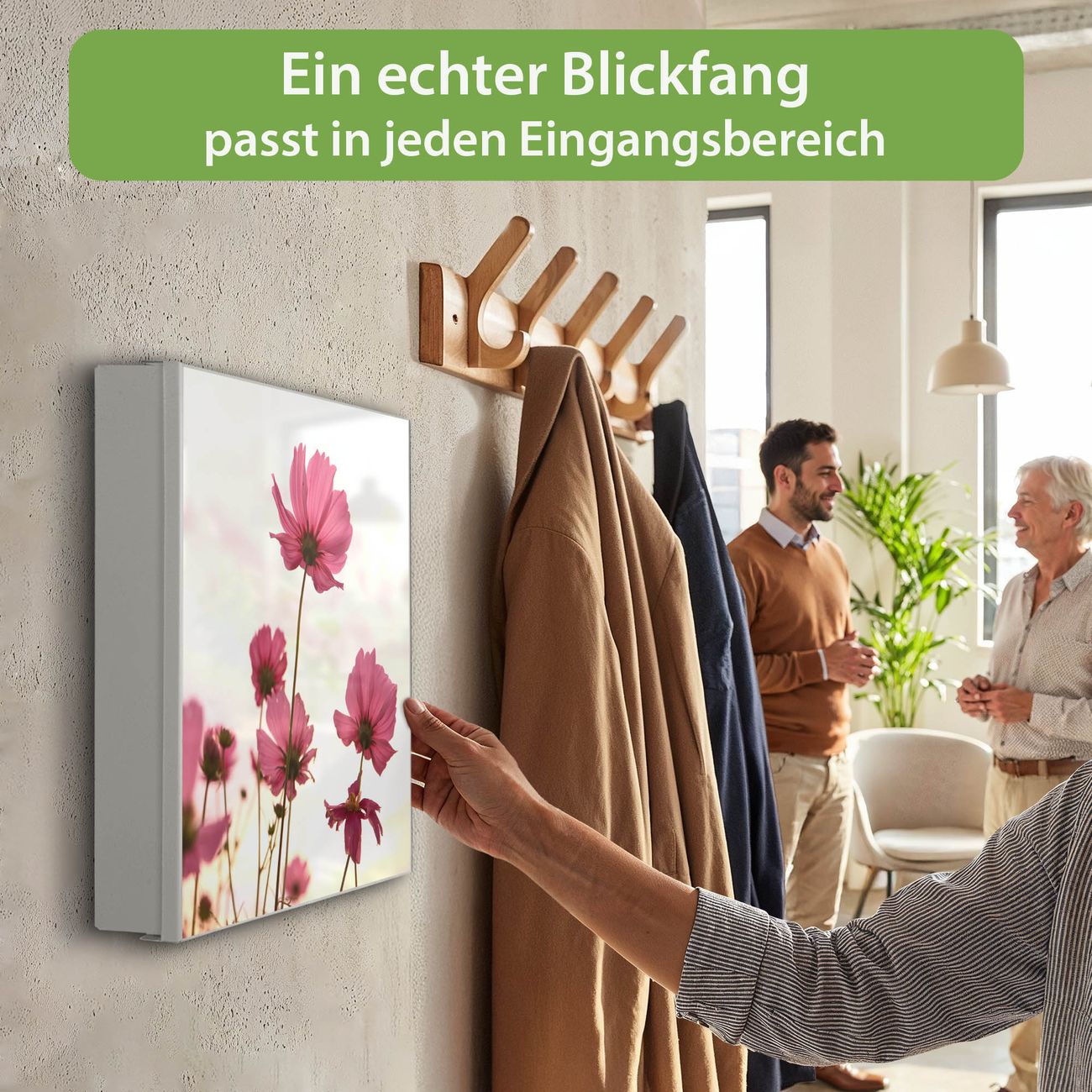 Bringe Ordnung und Eleganz in deinen Eingangsbereich mit dem banjado Schlüsselkasten Motiv Motiv Cosmea. Die moderne Schlüsselbox kombiniert funktionales Design mit hochwertiger Verarbeitung und wird so zu einem echten Hingucker in Flur, Büro oder Ferienwohnung. ✅ Stilvolle Schlüsselaufbewahrung mit Motiv Motiv Cosmea Der Design-Schlüsselkasten Motiv Motiv Cosmea bietet Platz für bis zu 32 Schlüssel, die auf 4 stabilen Reihen mit je 8 Haken übersichtlich verstaut werden. Mit seinen kompakten Maßen von 30 x 30 x 5 cm passt die Schlüsselbox perfekt auch in kleinere Räume. Der weiß lackierte Stahlkorpus mit links angeschlagenem Türscharnier harmoniert mit gedruckten Folie auf der Front und fügt sich nahtlos in jedes Wohnambiente ein. Ob als Schlüsselorganizer für Zuhause oder als praktische Lösung für Büros, Praxen und Gewerbe, der banjado Schlüsselkasten sorgt für Ordnung und Übersicht. Dank der magnetischen, mit Kreidestiften beschreibbaren Folie auf der Front kannst du Notizen anheften oder Termine direkt auf der Oberfläche festhalten. Die Schlüsselbox Motiv Motiv Cosmea zur Wandmontage wird inklusive Befestigungsmaterial geliefert und ist schnell angebracht. So hast du deine Schlüssel jederzeit griffbereit und zugleich stilvoll verstaut. Mit diesem banjado Schlüsselkasten Motiv Motiv Cosmea kombinierst du praktische Aufbewahrung mit stilvollem Wohndesign. Ob privat oder geschäftlich, die Schlüsselbox sorgt für mehr Ordnung, Übersicht und ein wohnliches Ambiente.Vorteile im Überblick