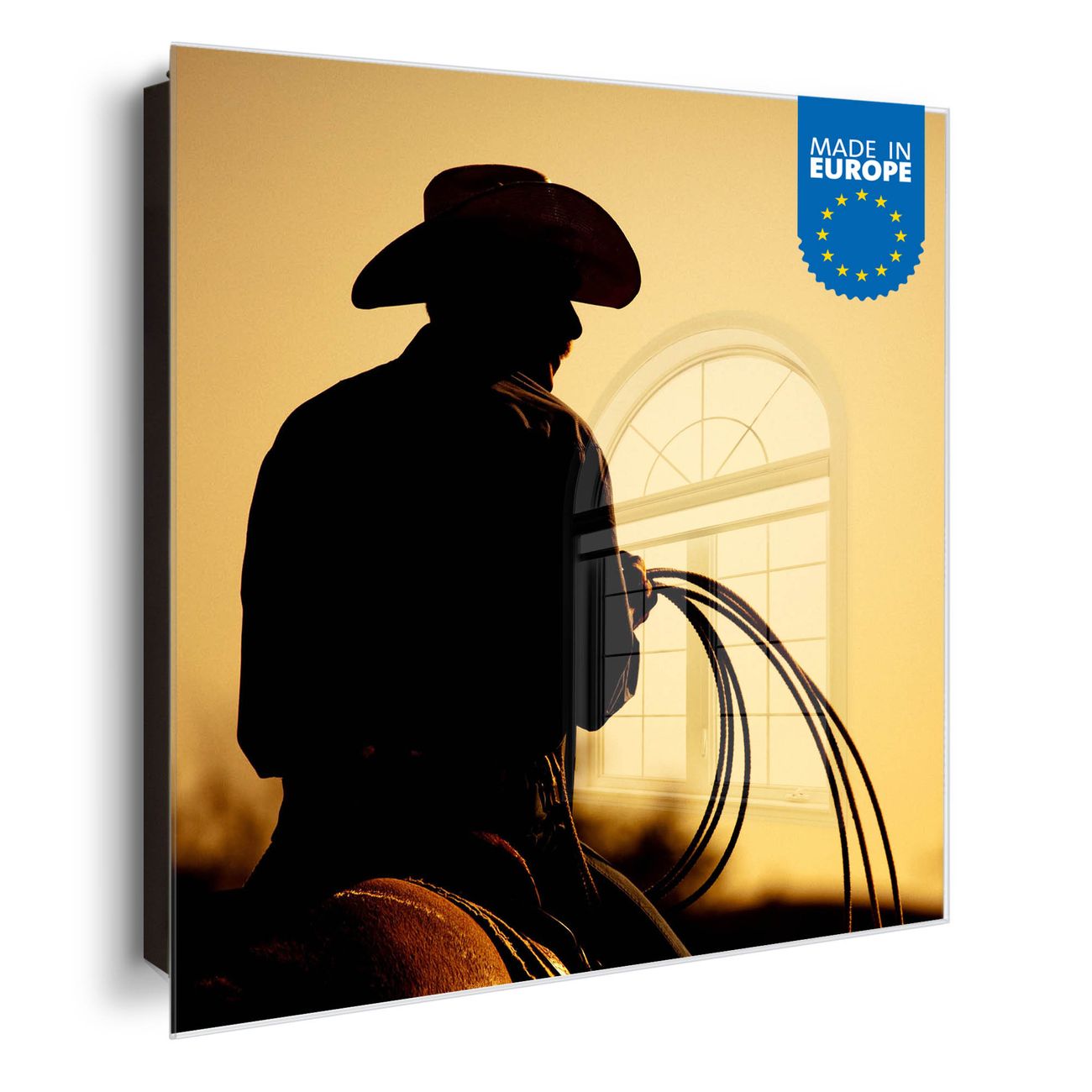 Bringe Ordnung und Eleganz in deinen Eingangsbereich mit dem banjado Schlüsselkasten Motiv Motiv Cowboy. Die moderne Schlüsselbox kombiniert funktionales Design mit hochwertiger Verarbeitung und wird so zu einem echten Hingucker in Flur, Büro oder Ferienwohnung. ✅ Stilvolle Schlüsselaufbewahrung mit Glasfront im Motiv Motiv Cowboy Der Design-Schlüsselkasten Motiv Motiv Cowboy bietet Platz für bis zu 50 Schlüssel, die auf 5 stabilen Reihen mit je 10 Haken übersichtlich verstaut werden. Mit seinen kompakten Maßen von 30 x 30 x 5 cm passt die Schlüsselbox perfekt auch in kleinere Räume. Der schwarz lackierte Stahlkorpus mit rechts angeschlagenem Türscharnier harmoniert mit der Glasfront und fügt sich nahtlos in jedes Wohnambiente ein. Ob als Schlüsselorganizer für Zuhause oder als praktische Lösung für Büros, Praxen und Gewerbe, der banjado Schlüsselkasten sorgt für Ordnung und Übersicht. Dank der magnetischen, mit Kreidestiften beschreibbaren Glasfront kannst du Notizen anheften oder Termine direkt auf der Oberfläche festhalten. Die Schlüsselbox Motiv Motiv Cowboy zur Wandmontage wird inklusive Befestigungsmaterial geliefert und ist schnell angebracht. So hast du deine Schlüssel jederzeit griffbereit und zugleich stilvoll verstaut. Mit diesem banjado Schlüsselkasten Motiv Motiv Cowboy kombinierst du praktische Aufbewahrung mit stilvollem Wohndesign. Ob privat oder geschäftlich, die Schlüsselbox sorgt für mehr Ordnung, Übersicht und ein wohnliches Ambiente.Vorteile im Überblick