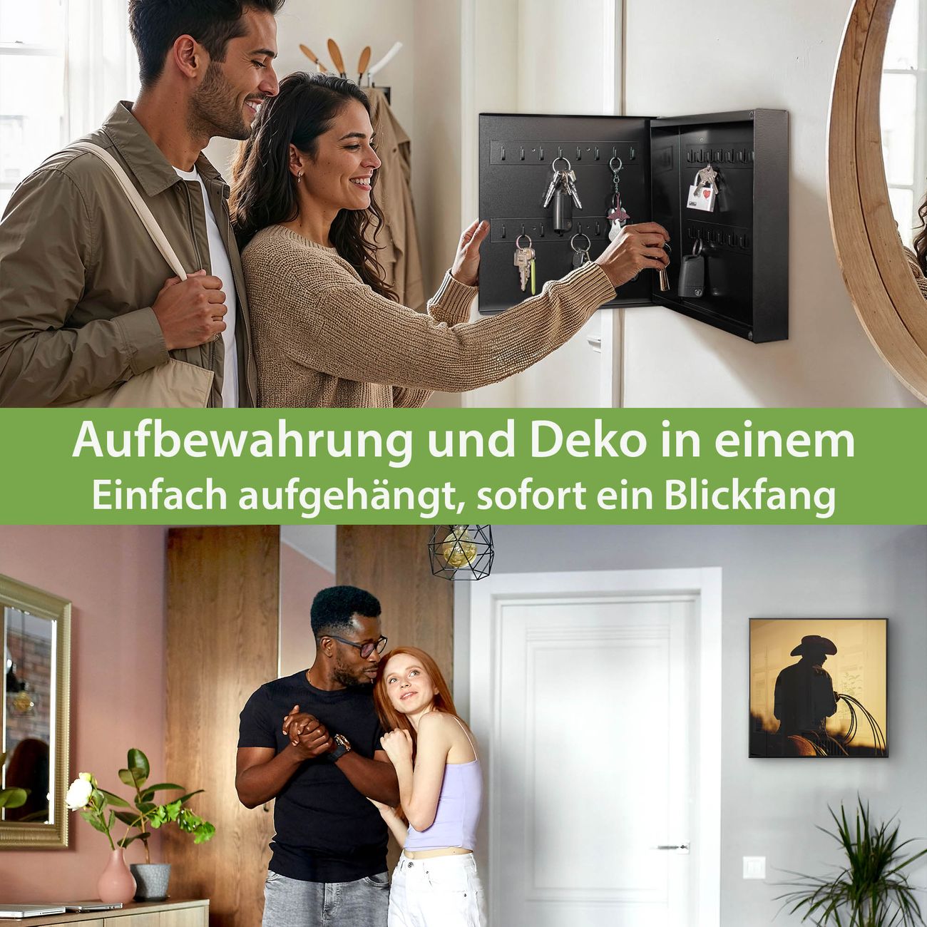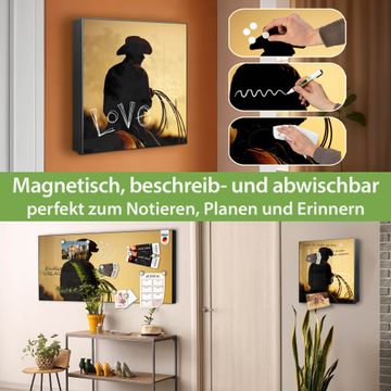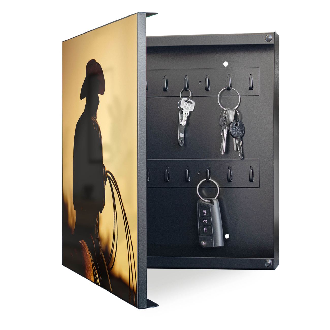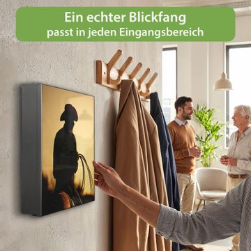 Bringe Ordnung und Eleganz in deinen Eingangsbereich mit dem banjado Schlüsselkasten Motiv Motiv Cowboy. Die moderne Schlüsselbox kombiniert funktionales Design mit hochwertiger Verarbeitung und wird so zu einem echten Hingucker in Flur, Büro oder Ferienwohnung. ✅ Stilvolle Schlüsselaufbewahrung mit Motiv Motiv Cowboy Der Design-Schlüsselkasten Motiv Motiv Cowboy bietet Platz für bis zu 32 Schlüssel, die auf 4 stabilen Reihen mit je 8 Haken übersichtlich verstaut werden. Mit seinen kompakten Maßen von 30 x 30 x 5 cm passt die Schlüsselbox perfekt auch in kleinere Räume. Der schwarz lackierte Stahlkorpus mit links angeschlagenem Türscharnier harmoniert mit gedruckten Folie auf der Front und fügt sich nahtlos in jedes Wohnambiente ein. Ob als Schlüsselorganizer für Zuhause oder als praktische Lösung für Büros, Praxen und Gewerbe, der banjado Schlüsselkasten sorgt für Ordnung und Übersicht. Dank der magnetischen, mit Kreidestiften beschreibbaren Folie auf der Front kannst du Notizen anheften oder Termine direkt auf der Oberfläche festhalten. Die Schlüsselbox Motiv Motiv Cowboy zur Wandmontage wird inklusive Befestigungsmaterial geliefert und ist schnell angebracht. So hast du deine Schlüssel jederzeit griffbereit und zugleich stilvoll verstaut. Mit diesem banjado Schlüsselkasten Motiv Motiv Cowboy kombinierst du praktische Aufbewahrung mit stilvollem Wohndesign. Ob privat oder geschäftlich, die Schlüsselbox sorgt für mehr Ordnung, Übersicht und ein wohnliches Ambiente.Vorteile im Überblick