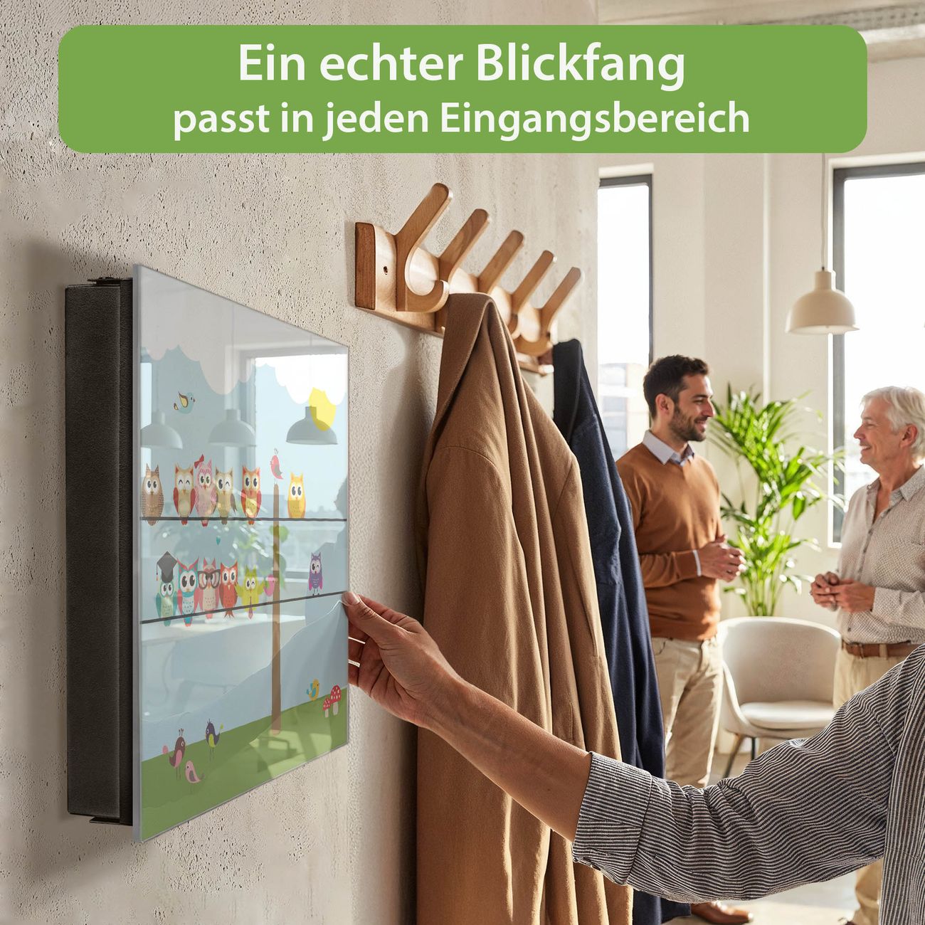 Bringe Ordnung und Eleganz in deinen Eingangsbereich mit dem banjado Schlüsselkasten Motiv Motiv Da Wären Wir. Die moderne Schlüsselbox kombiniert funktionales Design mit hochwertiger Verarbeitung und wird so zu einem echten Hingucker in Flur, Büro oder Ferienwohnung. ✅ Stilvolle Schlüsselaufbewahrung mit Glasfront im Motiv Motiv Da Wären Wir Der Design-Schlüsselkasten Motiv Motiv Da Wären Wir bietet Platz für bis zu 50 Schlüssel, die auf 5 stabilen Reihen mit je 10 Haken übersichtlich verstaut werden. Mit seinen kompakten Maßen von 30 x 30 x 5 cm passt die Schlüsselbox perfekt auch in kleinere Räume. Der schwarz lackierte Stahlkorpus mit rechts angeschlagenem Türscharnier harmoniert mit der Glasfront und fügt sich nahtlos in jedes Wohnambiente ein. Ob als Schlüsselorganizer für Zuhause oder als praktische Lösung für Büros, Praxen und Gewerbe, der banjado Schlüsselkasten sorgt für Ordnung und Übersicht. Dank der magnetischen, mit Kreidestiften beschreibbaren Glasfront kannst du Notizen anheften oder Termine direkt auf der Oberfläche festhalten. Die Schlüsselbox Motiv Motiv Da Wären Wir zur Wandmontage wird inklusive Befestigungsmaterial geliefert und ist schnell angebracht. So hast du deine Schlüssel jederzeit griffbereit und zugleich stilvoll verstaut. Mit diesem banjado Schlüsselkasten Motiv Motiv Da Wären Wir kombinierst du praktische Aufbewahrung mit stilvollem Wohndesign. Ob privat oder geschäftlich, die Schlüsselbox sorgt für mehr Ordnung, Übersicht und ein wohnliches Ambiente.Vorteile im Überblick