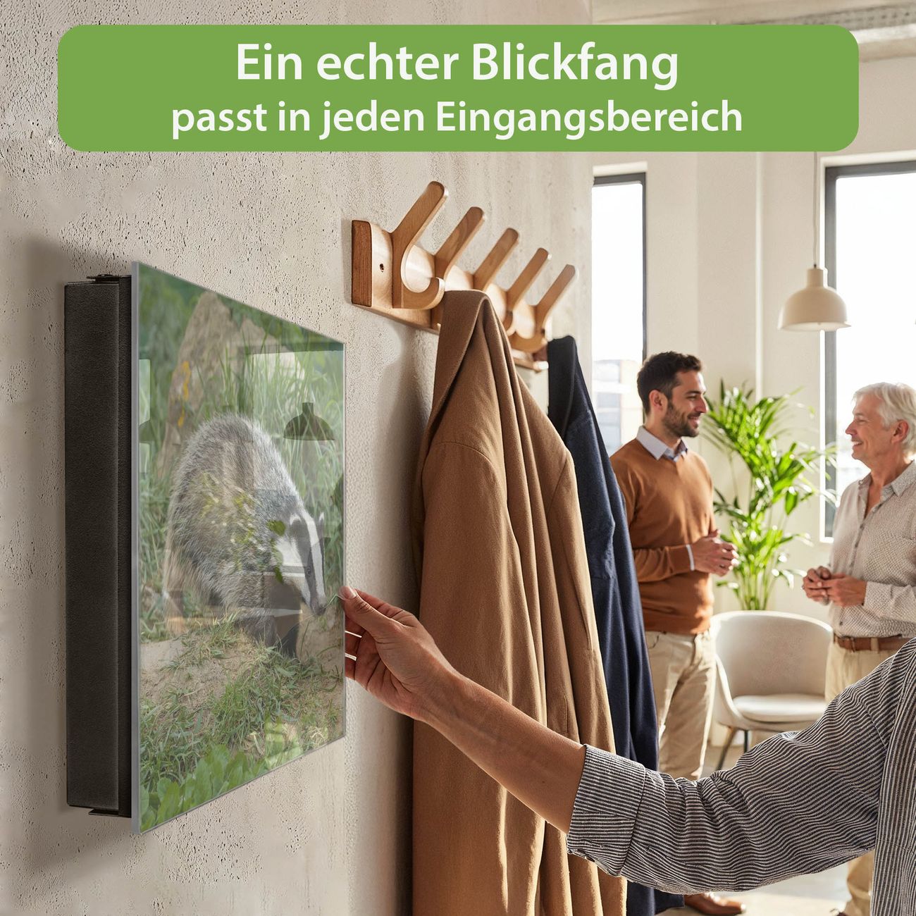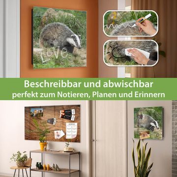 Bringe Ordnung und Eleganz in deinen Eingangsbereich mit dem banjado Schlüsselkasten Motiv Motiv Dachs. Die moderne Schlüsselbox kombiniert funktionales Design mit hochwertiger Verarbeitung und wird so zu einem echten Hingucker in Flur, Büro oder Ferienwohnung. ✅ Stilvolle Schlüsselaufbewahrung mit Glasfront im Motiv Motiv Dachs Der Design-Schlüsselkasten Motiv Motiv Dachs bietet Platz für bis zu 50 Schlüssel, die auf 5 stabilen Reihen mit je 10 Haken übersichtlich verstaut werden. Mit seinen kompakten Maßen von 30 x 30 x 5 cm passt die Schlüsselbox perfekt auch in kleinere Räume. Der schwarz lackierte Stahlkorpus mit rechts angeschlagenem Türscharnier harmoniert mit der Glasfront und fügt sich nahtlos in jedes Wohnambiente ein. Ob als Schlüsselorganizer für Zuhause oder als praktische Lösung für Büros, Praxen und Gewerbe, der banjado Schlüsselkasten sorgt für Ordnung und Übersicht. Dank der magnetischen, mit Kreidestiften beschreibbaren Glasfront kannst du Notizen anheften oder Termine direkt auf der Oberfläche festhalten. Die Schlüsselbox Motiv Motiv Dachs zur Wandmontage wird inklusive Befestigungsmaterial geliefert und ist schnell angebracht. So hast du deine Schlüssel jederzeit griffbereit und zugleich stilvoll verstaut. Mit diesem banjado Schlüsselkasten Motiv Motiv Dachs kombinierst du praktische Aufbewahrung mit stilvollem Wohndesign. Ob privat oder geschäftlich, die Schlüsselbox sorgt für mehr Ordnung, Übersicht und ein wohnliches Ambiente.Vorteile im Überblick