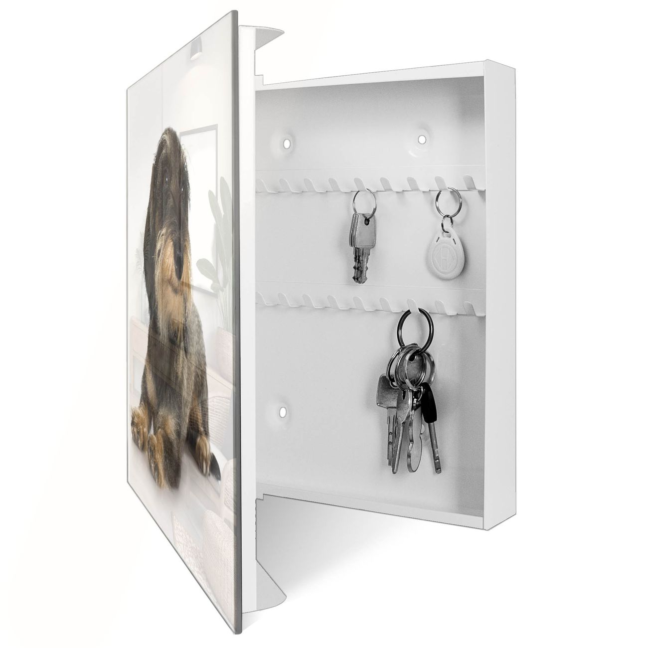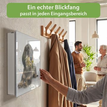 Bringe Ordnung und Eleganz in deinen Eingangsbereich mit dem banjado Schlüsselkasten Motiv Motiv Dackel. Die moderne Schlüsselbox kombiniert funktionales Design mit hochwertiger Verarbeitung und wird so zu einem echten Hingucker in Flur, Büro oder Ferienwohnung. ✅ Stilvolle Schlüsselaufbewahrung mit Glasfront im Motiv Motiv Dackel Der Design-Schlüsselkasten Motiv Motiv Dackel bietet Platz für bis zu 50 Schlüssel, die auf 5 stabilen Reihen mit je 10 Haken übersichtlich verstaut werden. Mit seinen kompakten Maßen von 30 x 30 x 5 cm passt die Schlüsselbox perfekt auch in kleinere Räume. Der weiß lackierte Stahlkorpus mit rechts angeschlagenem Türscharnier harmoniert mit der Glasfront und fügt sich nahtlos in jedes Wohnambiente ein. Ob als Schlüsselorganizer für Zuhause oder als praktische Lösung für Büros, Praxen und Gewerbe, der banjado Schlüsselkasten sorgt für Ordnung und Übersicht. Dank der magnetischen, mit Kreidestiften beschreibbaren Glasfront kannst du Notizen anheften oder Termine direkt auf der Oberfläche festhalten. Die Schlüsselbox Motiv Motiv Dackel zur Wandmontage wird inklusive Befestigungsmaterial geliefert und ist schnell angebracht. So hast du deine Schlüssel jederzeit griffbereit und zugleich stilvoll verstaut. Mit diesem banjado Schlüsselkasten Motiv Motiv Dackel kombinierst du praktische Aufbewahrung mit stilvollem Wohndesign. Ob privat oder geschäftlich, die Schlüsselbox sorgt für mehr Ordnung, Übersicht und ein wohnliches Ambiente.Vorteile im Überblick