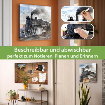 Bringe Ordnung und Eleganz in deinen Eingangsbereich mit dem banjado Schlüsselkasten Motiv Motiv Dampflok. Die moderne Schlüsselbox kombiniert funktionales Design mit hochwertiger Verarbeitung und wird so zu einem echten Hingucker in Flur, Büro oder Ferienwohnung. ✅ Stilvolle Schlüsselaufbewahrung mit Glasfront im Motiv Motiv Dampflok Der Design-Schlüsselkasten Motiv Motiv Dampflok bietet Platz für bis zu 50 Schlüssel, die auf 5 stabilen Reihen mit je 10 Haken übersichtlich verstaut werden. Mit seinen kompakten Maßen von 30 x 30 x 5 cm passt die Schlüsselbox perfekt auch in kleinere Räume. Der schwarz lackierte Stahlkorpus mit rechts angeschlagenem Türscharnier harmoniert mit der Glasfront und fügt sich nahtlos in jedes Wohnambiente ein. Ob als Schlüsselorganizer für Zuhause oder als praktische Lösung für Büros, Praxen und Gewerbe, der banjado Schlüsselkasten sorgt für Ordnung und Übersicht. Dank der magnetischen, mit Kreidestiften beschreibbaren Glasfront kannst du Notizen anheften oder Termine direkt auf der Oberfläche festhalten. Die Schlüsselbox Motiv Motiv Dampflok zur Wandmontage wird inklusive Befestigungsmaterial geliefert und ist schnell angebracht. So hast du deine Schlüssel jederzeit griffbereit und zugleich stilvoll verstaut. Mit diesem banjado Schlüsselkasten Motiv Motiv Dampflok kombinierst du praktische Aufbewahrung mit stilvollem Wohndesign. Ob privat oder geschäftlich, die Schlüsselbox sorgt für mehr Ordnung, Übersicht und ein wohnliches Ambiente.Vorteile im Überblick
