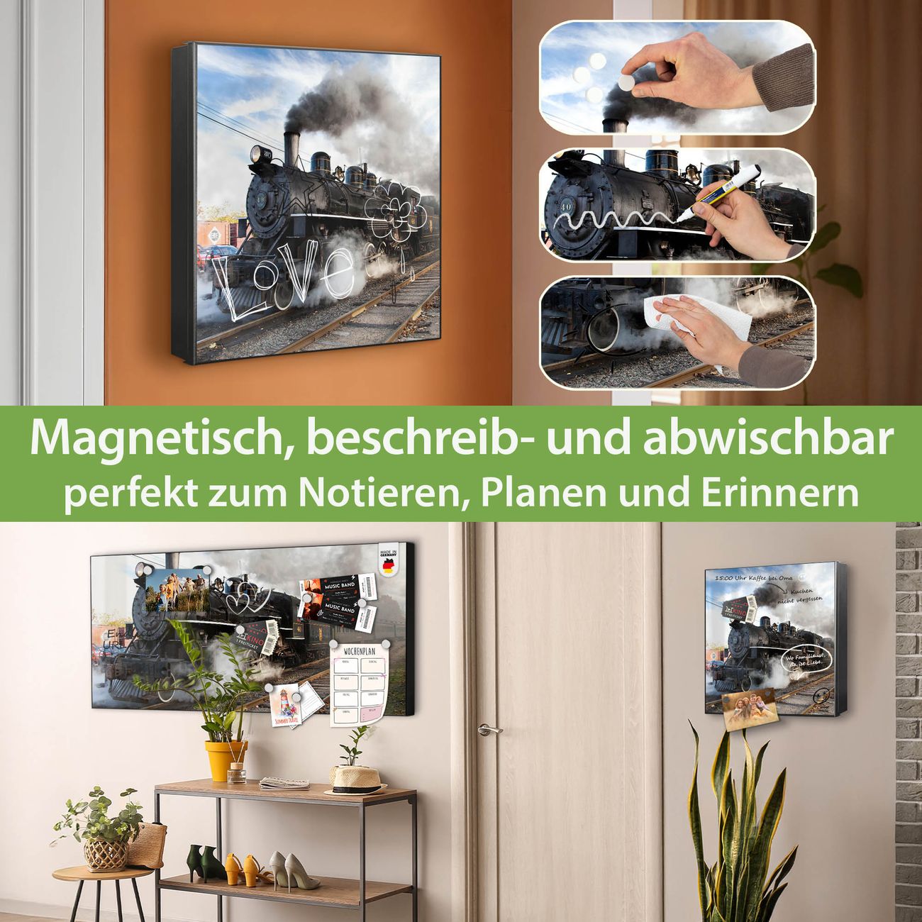 Bringe Ordnung und Eleganz in deinen Eingangsbereich mit dem banjado Schlüsselkasten Motiv Motiv Dampflok. Die moderne Schlüsselbox kombiniert funktionales Design mit hochwertiger Verarbeitung und wird so zu einem echten Hingucker in Flur, Büro oder Ferienwohnung. ✅ Stilvolle Schlüsselaufbewahrung mit Motiv Motiv Dampflok Der Design-Schlüsselkasten Motiv Motiv Dampflok bietet Platz für bis zu 32 Schlüssel, die auf 4 stabilen Reihen mit je 8 Haken übersichtlich verstaut werden. Mit seinen kompakten Maßen von 30 x 30 x 5 cm passt die Schlüsselbox perfekt auch in kleinere Räume. Der schwarz lackierte Stahlkorpus mit links angeschlagenem Türscharnier harmoniert mit gedruckten Folie auf der Front und fügt sich nahtlos in jedes Wohnambiente ein. Ob als Schlüsselorganizer für Zuhause oder als praktische Lösung für Büros, Praxen und Gewerbe, der banjado Schlüsselkasten sorgt für Ordnung und Übersicht. Dank der magnetischen, mit Kreidestiften beschreibbaren Folie auf der Front kannst du Notizen anheften oder Termine direkt auf der Oberfläche festhalten. Die Schlüsselbox Motiv Motiv Dampflok zur Wandmontage wird inklusive Befestigungsmaterial geliefert und ist schnell angebracht. So hast du deine Schlüssel jederzeit griffbereit und zugleich stilvoll verstaut. Mit diesem banjado Schlüsselkasten Motiv Motiv Dampflok kombinierst du praktische Aufbewahrung mit stilvollem Wohndesign. Ob privat oder geschäftlich, die Schlüsselbox sorgt für mehr Ordnung, Übersicht und ein wohnliches Ambiente.Vorteile im Überblick