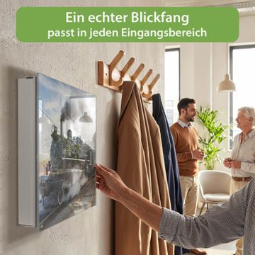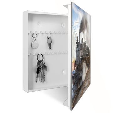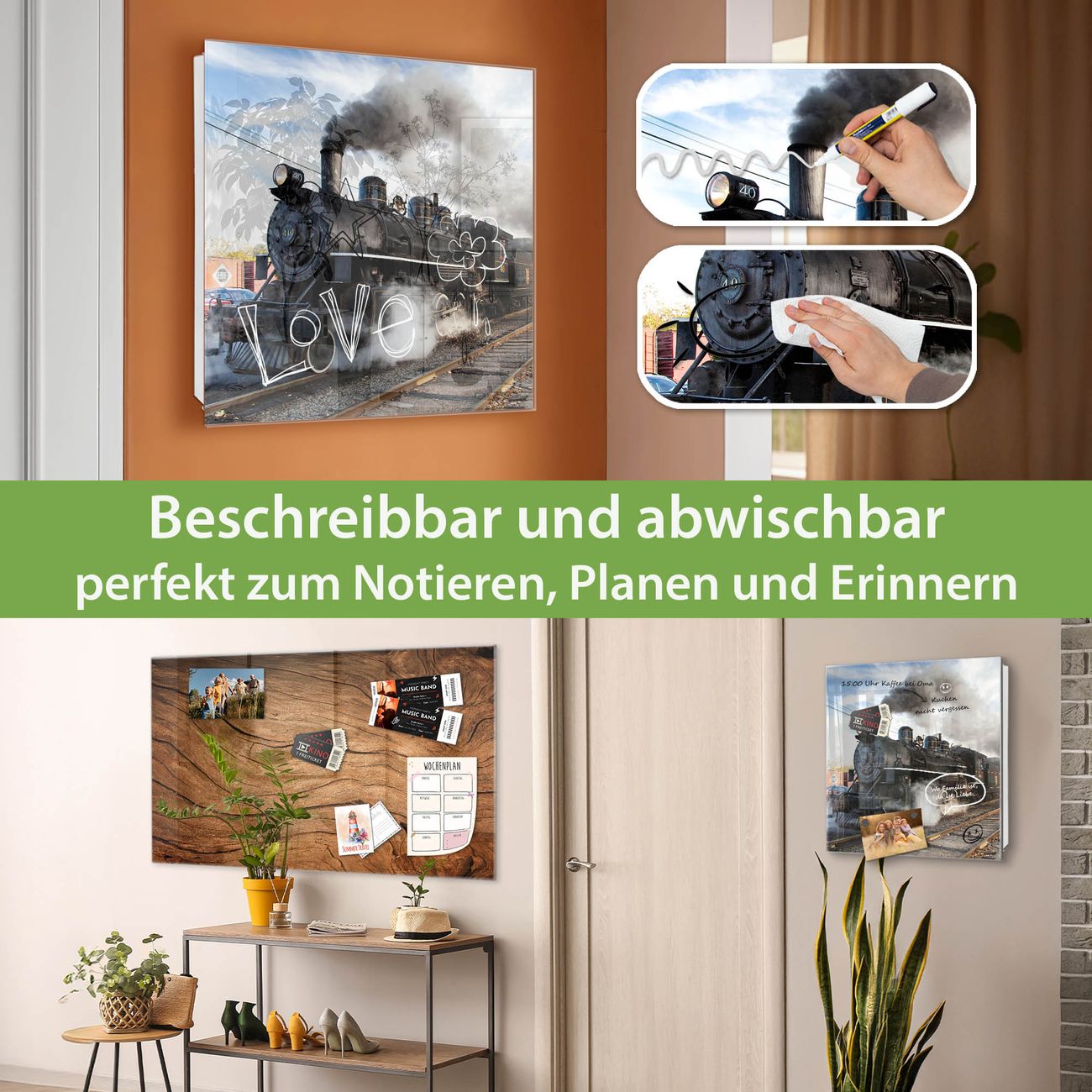 Bringe Ordnung und Eleganz in deinen Eingangsbereich mit dem banjado Schlüsselkasten Motiv Motiv Dampflok. Die moderne Schlüsselbox kombiniert funktionales Design mit hochwertiger Verarbeitung und wird so zu einem echten Hingucker in Flur, Büro oder Ferienwohnung. ✅ Stilvolle Schlüsselaufbewahrung mit Glasfront im Motiv Motiv Dampflok Der Design-Schlüsselkasten Motiv Motiv Dampflok bietet Platz für bis zu 50 Schlüssel, die auf 5 stabilen Reihen mit je 10 Haken übersichtlich verstaut werden. Mit seinen kompakten Maßen von 30 x 30 x 5 cm passt die Schlüsselbox perfekt auch in kleinere Räume. Der weiß lackierte Stahlkorpus mit rechts angeschlagenem Türscharnier harmoniert mit der Glasfront und fügt sich nahtlos in jedes Wohnambiente ein. Ob als Schlüsselorganizer für Zuhause oder als praktische Lösung für Büros, Praxen und Gewerbe, der banjado Schlüsselkasten sorgt für Ordnung und Übersicht. Dank der magnetischen, mit Kreidestiften beschreibbaren Glasfront kannst du Notizen anheften oder Termine direkt auf der Oberfläche festhalten. Die Schlüsselbox Motiv Motiv Dampflok zur Wandmontage wird inklusive Befestigungsmaterial geliefert und ist schnell angebracht. So hast du deine Schlüssel jederzeit griffbereit und zugleich stilvoll verstaut. Mit diesem banjado Schlüsselkasten Motiv Motiv Dampflok kombinierst du praktische Aufbewahrung mit stilvollem Wohndesign. Ob privat oder geschäftlich, die Schlüsselbox sorgt für mehr Ordnung, Übersicht und ein wohnliches Ambiente.Vorteile im Überblick