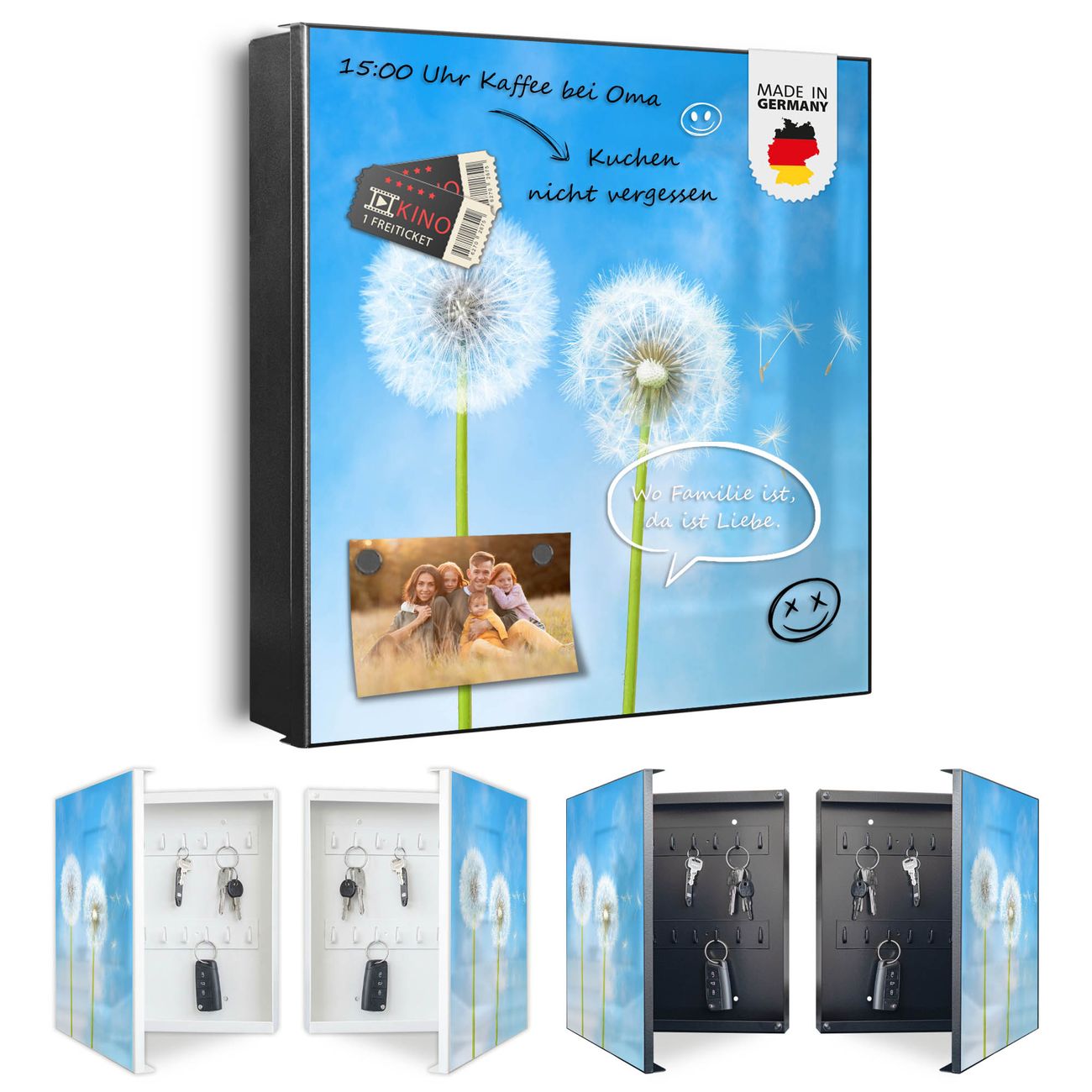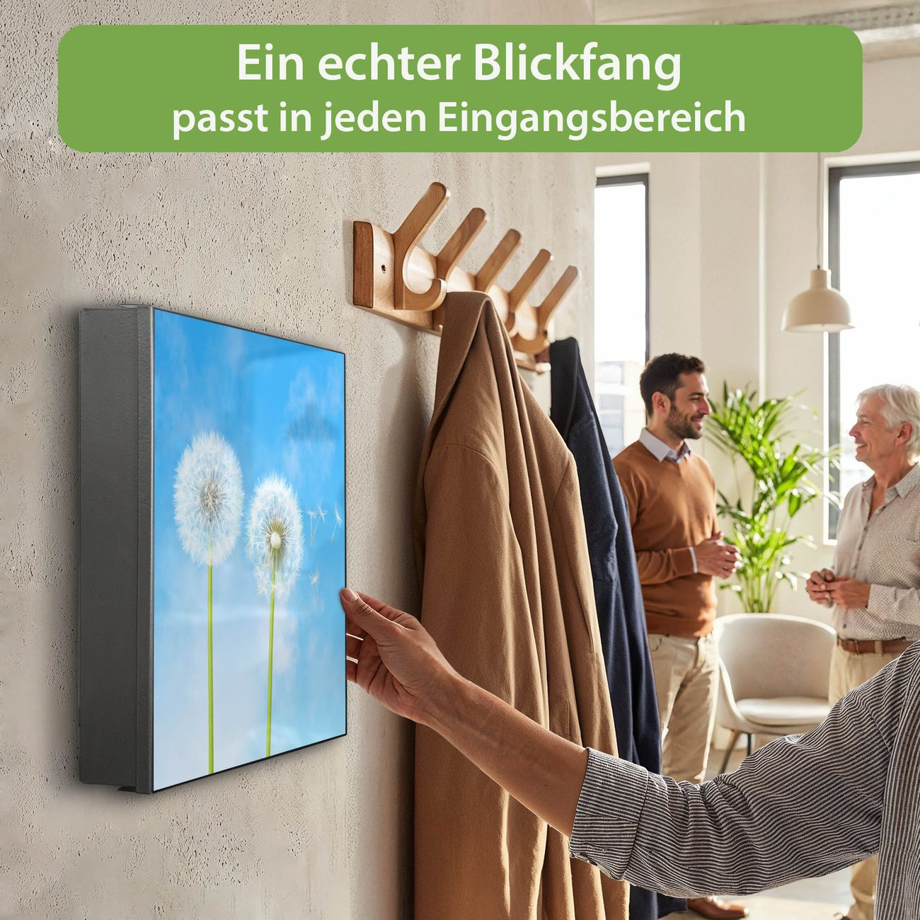 Bringe Ordnung und Eleganz in deinen Eingangsbereich mit dem banjado Schlüsselkasten Motiv Motiv Dandelion. Die moderne Schlüsselbox kombiniert funktionales Design mit hochwertiger Verarbeitung und wird so zu einem echten Hingucker in Flur, Büro oder Ferienwohnung. ✅ Stilvolle Schlüsselaufbewahrung mit Motiv Motiv Dandelion Der Design-Schlüsselkasten Motiv Motiv Dandelion bietet Platz für bis zu 32 Schlüssel, die auf 4 stabilen Reihen mit je 8 Haken übersichtlich verstaut werden. Mit seinen kompakten Maßen von 30 x 30 x 5 cm passt die Schlüsselbox perfekt auch in kleinere Räume. Der schwarz lackierte Stahlkorpus mit links angeschlagenem Türscharnier harmoniert mit gedruckten Folie auf der Front und fügt sich nahtlos in jedes Wohnambiente ein. Ob als Schlüsselorganizer für Zuhause oder als praktische Lösung für Büros, Praxen und Gewerbe, der banjado Schlüsselkasten sorgt für Ordnung und Übersicht. Dank der magnetischen, mit Kreidestiften beschreibbaren Folie auf der Front kannst du Notizen anheften oder Termine direkt auf der Oberfläche festhalten. Die Schlüsselbox Motiv Motiv Dandelion zur Wandmontage wird inklusive Befestigungsmaterial geliefert und ist schnell angebracht. So hast du deine Schlüssel jederzeit griffbereit und zugleich stilvoll verstaut. Mit diesem banjado Schlüsselkasten Motiv Motiv Dandelion kombinierst du praktische Aufbewahrung mit stilvollem Wohndesign. Ob privat oder geschäftlich, die Schlüsselbox sorgt für mehr Ordnung, Übersicht und ein wohnliches Ambiente.Vorteile im Überblick