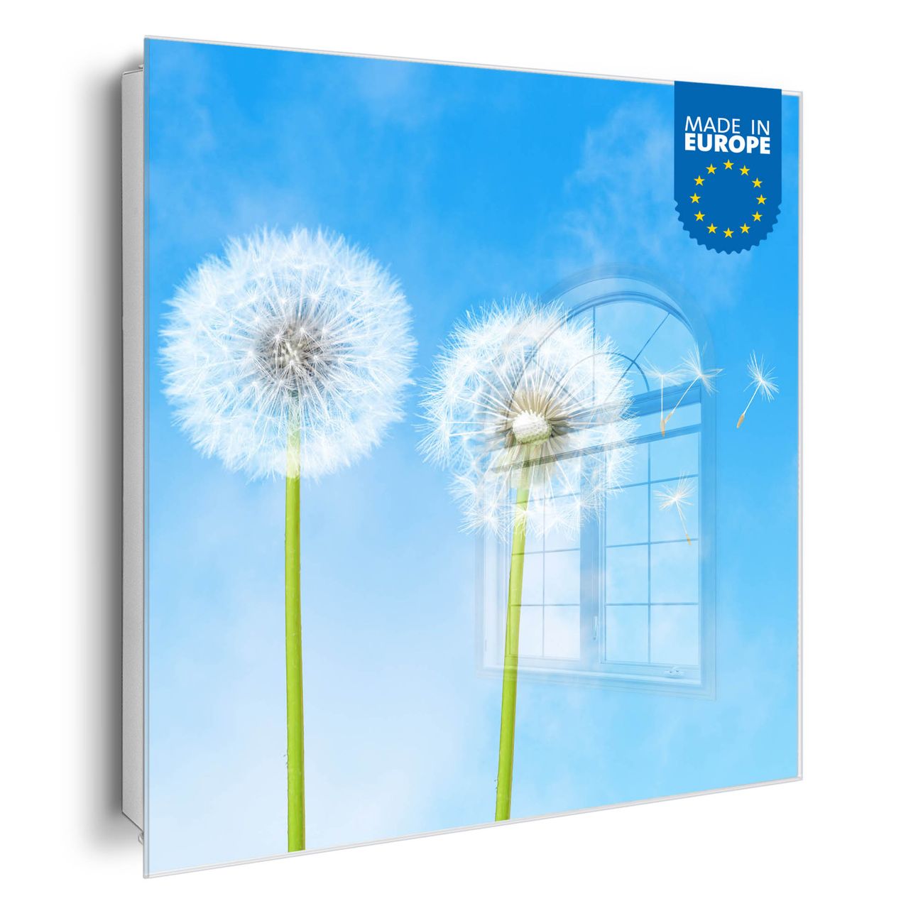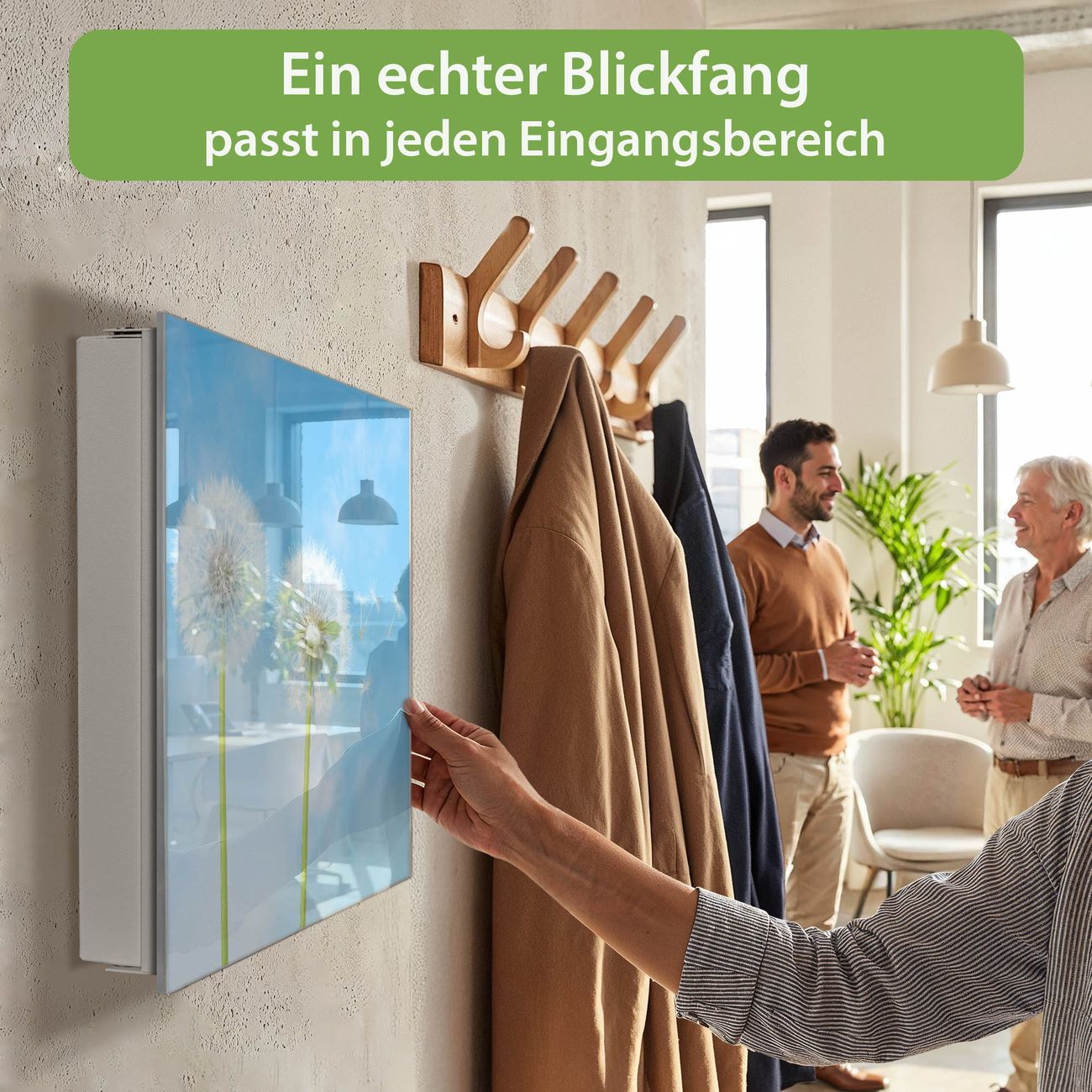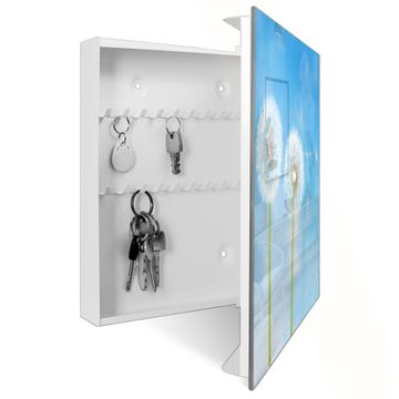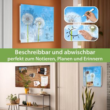 Bringe Ordnung und Eleganz in deinen Eingangsbereich mit dem banjado Schlüsselkasten Motiv Motiv Dandelion. Die moderne Schlüsselbox kombiniert funktionales Design mit hochwertiger Verarbeitung und wird so zu einem echten Hingucker in Flur, Büro oder Ferienwohnung. ✅ Stilvolle Schlüsselaufbewahrung mit Glasfront im Motiv Motiv Dandelion Der Design-Schlüsselkasten Motiv Motiv Dandelion bietet Platz für bis zu 50 Schlüssel, die auf 5 stabilen Reihen mit je 10 Haken übersichtlich verstaut werden. Mit seinen kompakten Maßen von 30 x 30 x 5 cm passt die Schlüsselbox perfekt auch in kleinere Räume. Der weiß lackierte Stahlkorpus mit rechts angeschlagenem Türscharnier harmoniert mit der Glasfront und fügt sich nahtlos in jedes Wohnambiente ein. Ob als Schlüsselorganizer für Zuhause oder als praktische Lösung für Büros, Praxen und Gewerbe, der banjado Schlüsselkasten sorgt für Ordnung und Übersicht. Dank der magnetischen, mit Kreidestiften beschreibbaren Glasfront kannst du Notizen anheften oder Termine direkt auf der Oberfläche festhalten. Die Schlüsselbox Motiv Motiv Dandelion zur Wandmontage wird inklusive Befestigungsmaterial geliefert und ist schnell angebracht. So hast du deine Schlüssel jederzeit griffbereit und zugleich stilvoll verstaut. Mit diesem banjado Schlüsselkasten Motiv Motiv Dandelion kombinierst du praktische Aufbewahrung mit stilvollem Wohndesign. Ob privat oder geschäftlich, die Schlüsselbox sorgt für mehr Ordnung, Übersicht und ein wohnliches Ambiente.Vorteile im Überblick