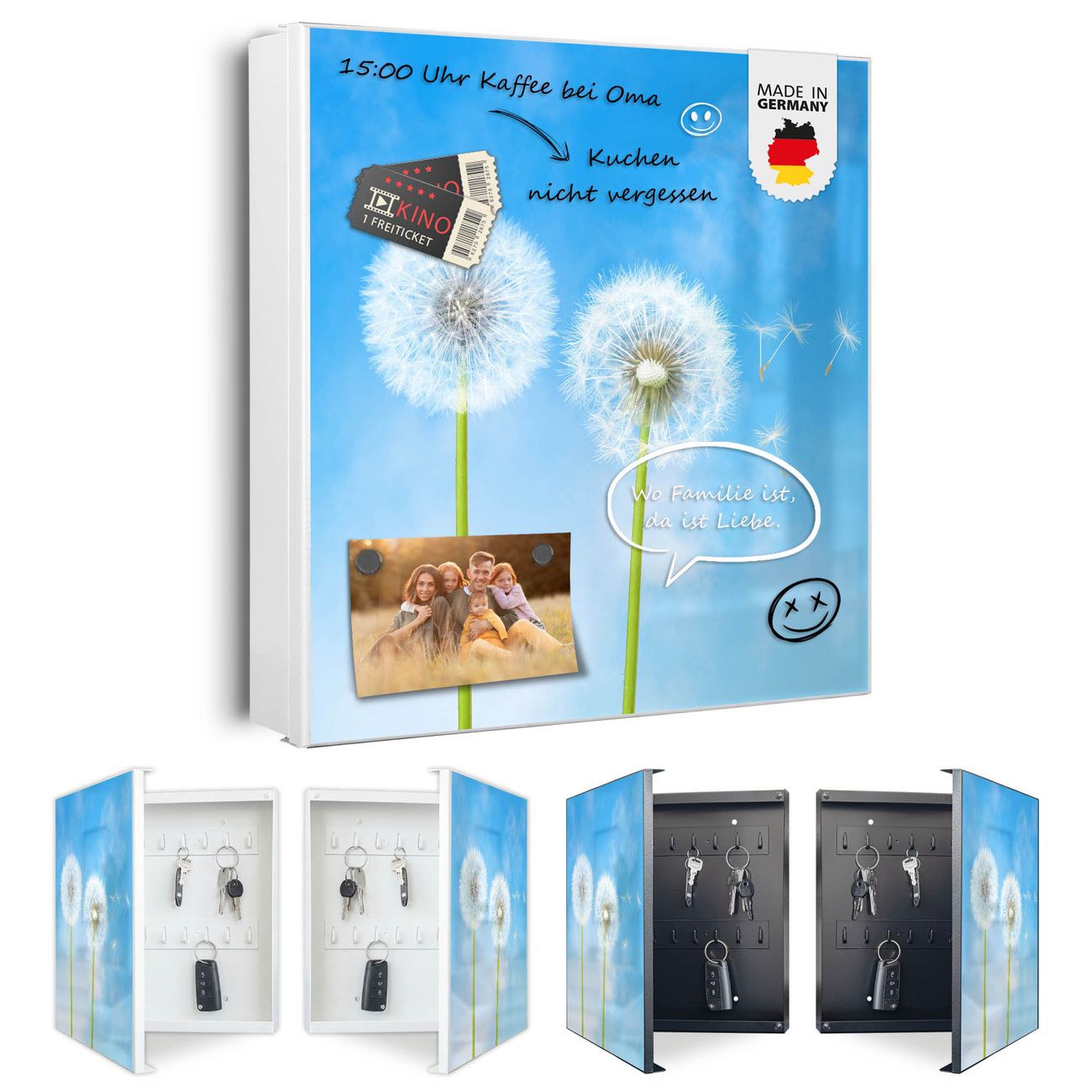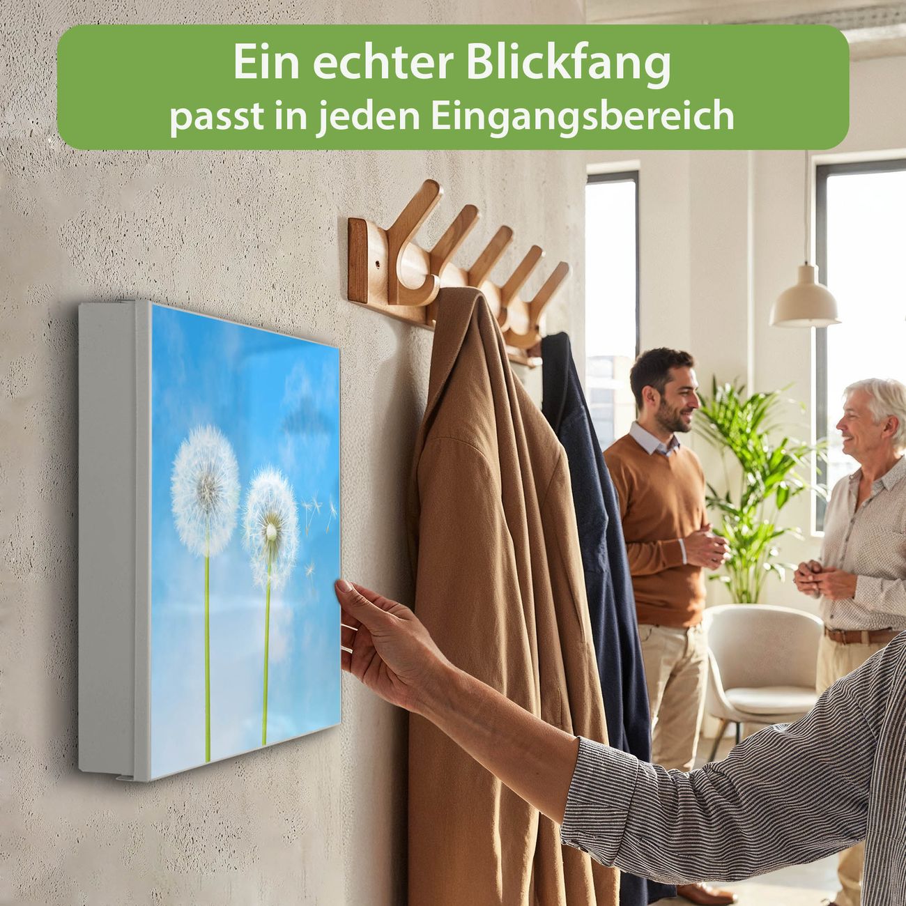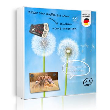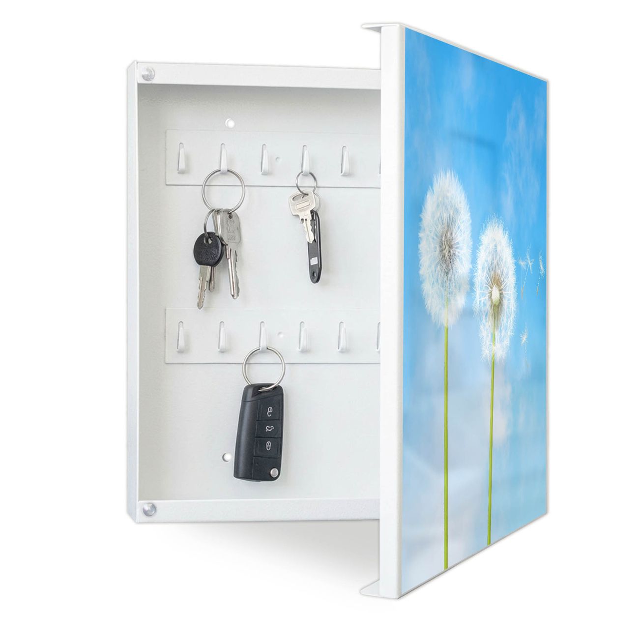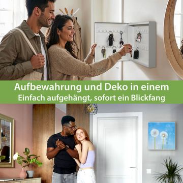Bringe Ordnung und Eleganz in deinen Eingangsbereich mit dem banjado Schlüsselkasten Motiv Motiv Dandelion. Die moderne Schlüsselbox kombiniert funktionales Design mit hochwertiger Verarbeitung und wird so zu einem echten Hingucker in Flur, Büro oder Ferienwohnung. ✅ Stilvolle Schlüsselaufbewahrung mit Motiv Motiv Dandelion Der Design-Schlüsselkasten Motiv Motiv Dandelion bietet Platz für bis zu 32 Schlüssel, die auf 4 stabilen Reihen mit je 8 Haken übersichtlich verstaut werden. Mit seinen kompakten Maßen von 30 x 30 x 5 cm passt die Schlüsselbox perfekt auch in kleinere Räume. Der weiß lackierte Stahlkorpus mit rechts angeschlagenem Türscharnier harmoniert mit gedruckten Folie auf der Front und fügt sich nahtlos in jedes Wohnambiente ein. Ob als Schlüsselorganizer für Zuhause oder als praktische Lösung für Büros, Praxen und Gewerbe, der banjado Schlüsselkasten sorgt für Ordnung und Übersicht. Dank der magnetischen, mit Kreidestiften beschreibbaren Folie auf der Front kannst du Notizen anheften oder Termine direkt auf der Oberfläche festhalten. Die Schlüsselbox Motiv Motiv Dandelion zur Wandmontage wird inklusive Befestigungsmaterial geliefert und ist schnell angebracht. So hast du deine Schlüssel jederzeit griffbereit und zugleich stilvoll verstaut. Mit diesem banjado Schlüsselkasten Motiv Motiv Dandelion kombinierst du praktische Aufbewahrung mit stilvollem Wohndesign. Ob privat oder geschäftlich, die Schlüsselbox sorgt für mehr Ordnung, Übersicht und ein wohnliches Ambiente.Vorteile im Überblick