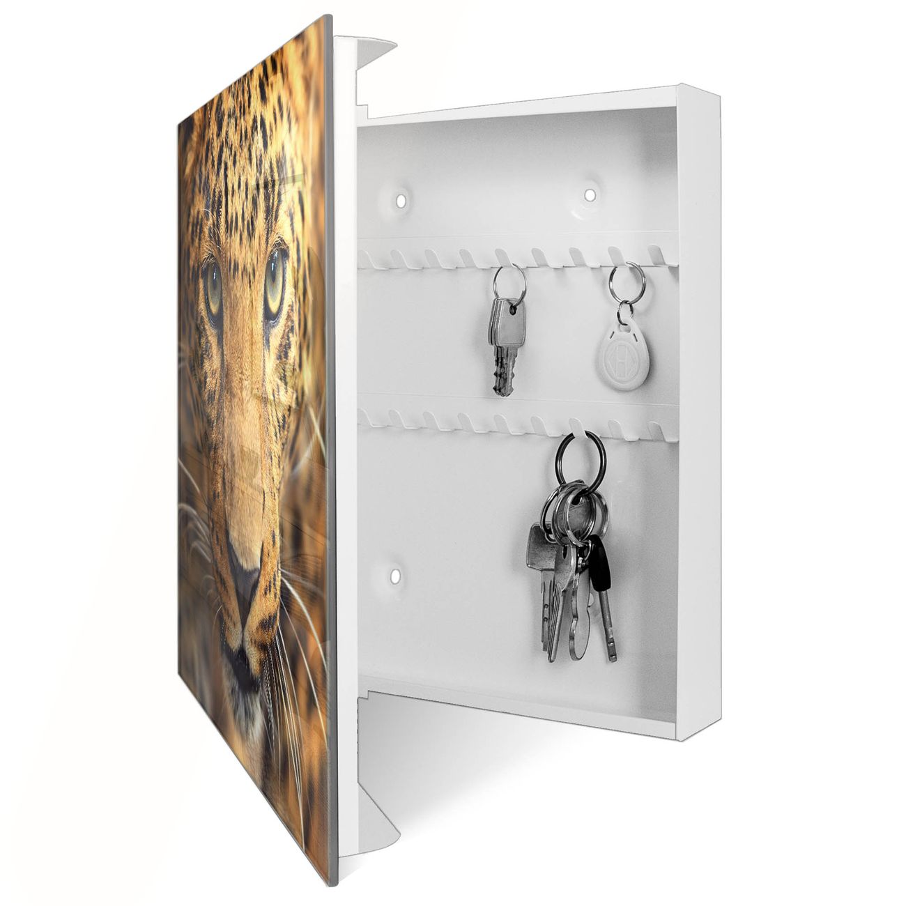 Bringe Ordnung und Eleganz in deinen Eingangsbereich mit dem banjado Schlüsselkasten Motiv Motiv Daphne. Die moderne Schlüsselbox kombiniert funktionales Design mit hochwertiger Verarbeitung und wird so zu einem echten Hingucker in Flur, Büro oder Ferienwohnung. ✅ Stilvolle Schlüsselaufbewahrung mit Glasfront im Motiv Motiv Daphne Der Design-Schlüsselkasten Motiv Motiv Daphne bietet Platz für bis zu 50 Schlüssel, die auf 5 stabilen Reihen mit je 10 Haken übersichtlich verstaut werden. Mit seinen kompakten Maßen von 30 x 30 x 5 cm passt die Schlüsselbox perfekt auch in kleinere Räume. Der weiß lackierte Stahlkorpus mit rechts angeschlagenem Türscharnier harmoniert mit der Glasfront und fügt sich nahtlos in jedes Wohnambiente ein. Ob als Schlüsselorganizer für Zuhause oder als praktische Lösung für Büros, Praxen und Gewerbe, der banjado Schlüsselkasten sorgt für Ordnung und Übersicht. Dank der magnetischen, mit Kreidestiften beschreibbaren Glasfront kannst du Notizen anheften oder Termine direkt auf der Oberfläche festhalten. Die Schlüsselbox Motiv Motiv Daphne zur Wandmontage wird inklusive Befestigungsmaterial geliefert und ist schnell angebracht. So hast du deine Schlüssel jederzeit griffbereit und zugleich stilvoll verstaut. Mit diesem banjado Schlüsselkasten Motiv Motiv Daphne kombinierst du praktische Aufbewahrung mit stilvollem Wohndesign. Ob privat oder geschäftlich, die Schlüsselbox sorgt für mehr Ordnung, Übersicht und ein wohnliches Ambiente.Vorteile im Überblick