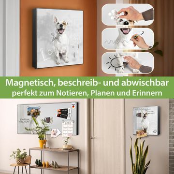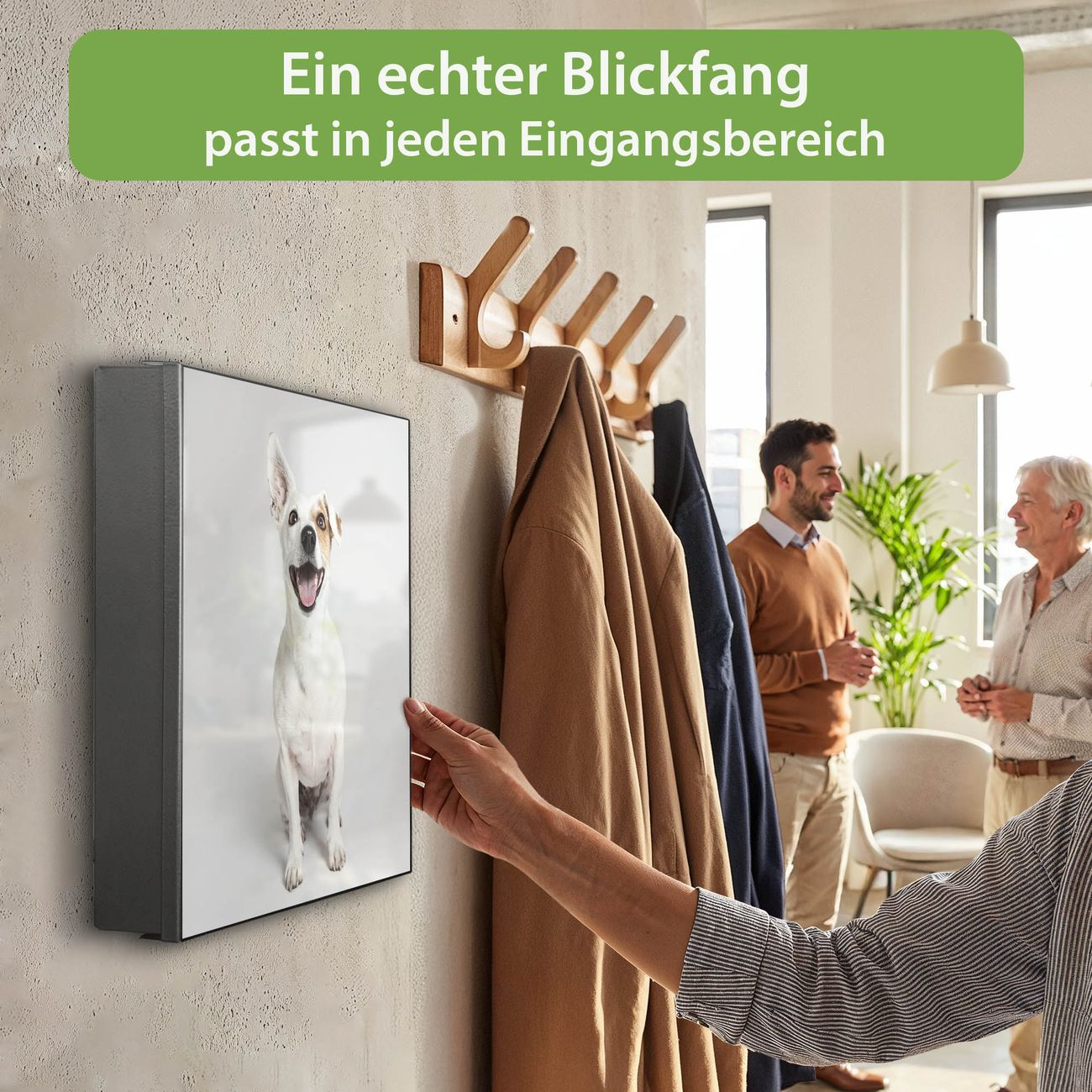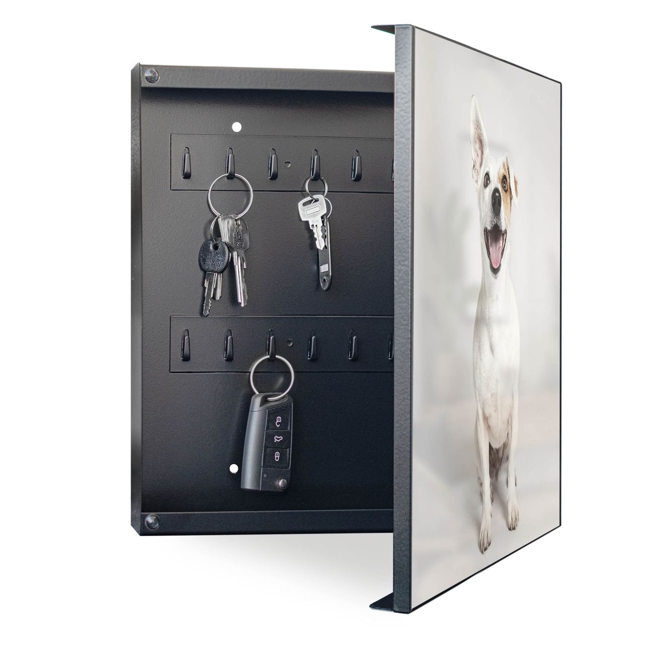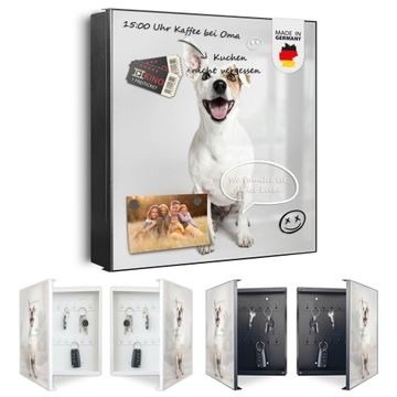 Bringe Ordnung und Eleganz in deinen Eingangsbereich mit dem banjado Schlüsselkasten Motiv Motiv Derek. Die moderne Schlüsselbox kombiniert funktionales Design mit hochwertiger Verarbeitung und wird so zu einem echten Hingucker in Flur, Büro oder Ferienwohnung. ✅ Stilvolle Schlüsselaufbewahrung mit Motiv Motiv Derek Der Design-Schlüsselkasten Motiv Motiv Derek bietet Platz für bis zu 32 Schlüssel, die auf 4 stabilen Reihen mit je 8 Haken übersichtlich verstaut werden. Mit seinen kompakten Maßen von 30 x 30 x 5 cm passt die Schlüsselbox perfekt auch in kleinere Räume. Der schwarz lackierte Stahlkorpus mit rechts angeschlagenem Türscharnier harmoniert mit gedruckten Folie auf der Front und fügt sich nahtlos in jedes Wohnambiente ein. Ob als Schlüsselorganizer für Zuhause oder als praktische Lösung für Büros, Praxen und Gewerbe, der banjado Schlüsselkasten sorgt für Ordnung und Übersicht. Dank der magnetischen, mit Kreidestiften beschreibbaren Folie auf der Front kannst du Notizen anheften oder Termine direkt auf der Oberfläche festhalten. Die Schlüsselbox Motiv Motiv Derek zur Wandmontage wird inklusive Befestigungsmaterial geliefert und ist schnell angebracht. So hast du deine Schlüssel jederzeit griffbereit und zugleich stilvoll verstaut. Mit diesem banjado Schlüsselkasten Motiv Motiv Derek kombinierst du praktische Aufbewahrung mit stilvollem Wohndesign. Ob privat oder geschäftlich, die Schlüsselbox sorgt für mehr Ordnung, Übersicht und ein wohnliches Ambiente.Vorteile im Überblick
