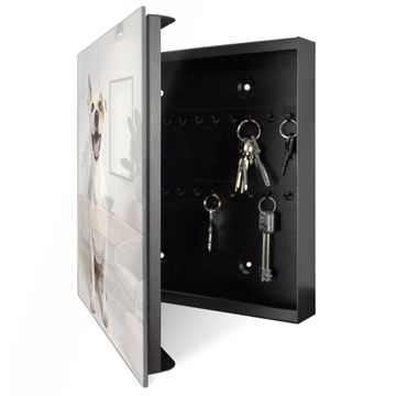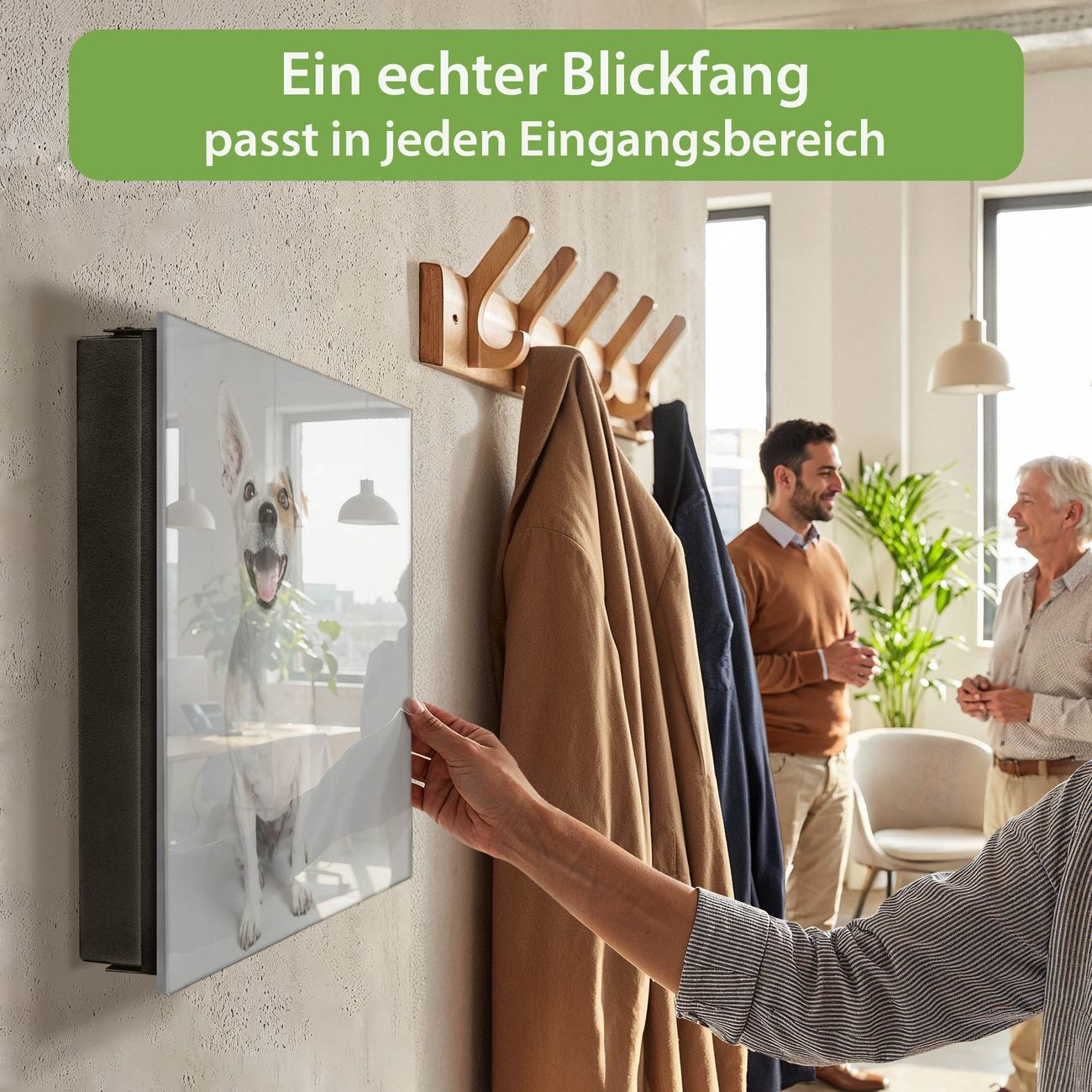 Bringe Ordnung und Eleganz in deinen Eingangsbereich mit dem banjado Schlüsselkasten Motiv Motiv Derek. Die moderne Schlüsselbox kombiniert funktionales Design mit hochwertiger Verarbeitung und wird so zu einem echten Hingucker in Flur, Büro oder Ferienwohnung. ✅ Stilvolle Schlüsselaufbewahrung mit Glasfront im Motiv Motiv Derek Der Design-Schlüsselkasten Motiv Motiv Derek bietet Platz für bis zu 50 Schlüssel, die auf 5 stabilen Reihen mit je 10 Haken übersichtlich verstaut werden. Mit seinen kompakten Maßen von 30 x 30 x 5 cm passt die Schlüsselbox perfekt auch in kleinere Räume. Der schwarz lackierte Stahlkorpus mit rechts angeschlagenem Türscharnier harmoniert mit der Glasfront und fügt sich nahtlos in jedes Wohnambiente ein. Ob als Schlüsselorganizer für Zuhause oder als praktische Lösung für Büros, Praxen und Gewerbe, der banjado Schlüsselkasten sorgt für Ordnung und Übersicht. Dank der magnetischen, mit Kreidestiften beschreibbaren Glasfront kannst du Notizen anheften oder Termine direkt auf der Oberfläche festhalten. Die Schlüsselbox Motiv Motiv Derek zur Wandmontage wird inklusive Befestigungsmaterial geliefert und ist schnell angebracht. So hast du deine Schlüssel jederzeit griffbereit und zugleich stilvoll verstaut. Mit diesem banjado Schlüsselkasten Motiv Motiv Derek kombinierst du praktische Aufbewahrung mit stilvollem Wohndesign. Ob privat oder geschäftlich, die Schlüsselbox sorgt für mehr Ordnung, Übersicht und ein wohnliches Ambiente.Vorteile im Überblick