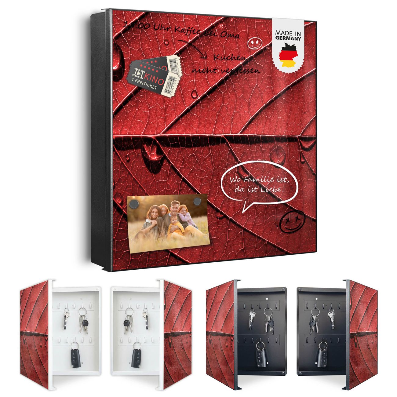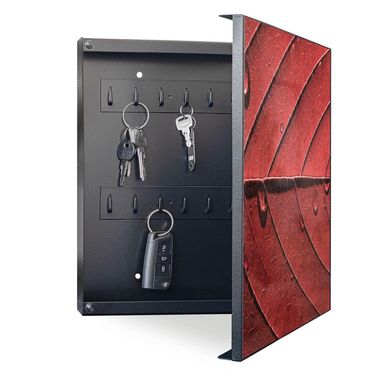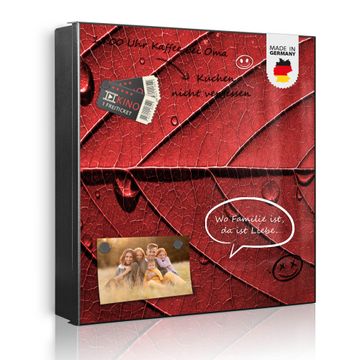 Bringe Ordnung und Eleganz in deinen Eingangsbereich mit dem banjado Schlüsselkasten Motiv Motiv Detail Blatt. Die moderne Schlüsselbox kombiniert funktionales Design mit hochwertiger Verarbeitung und wird so zu einem echten Hingucker in Flur, Büro oder Ferienwohnung. ✅ Stilvolle Schlüsselaufbewahrung mit Motiv Motiv Detail Blatt Der Design-Schlüsselkasten Motiv Motiv Detail Blatt bietet Platz für bis zu 32 Schlüssel, die auf 4 stabilen Reihen mit je 8 Haken übersichtlich verstaut werden. Mit seinen kompakten Maßen von 30 x 30 x 5 cm passt die Schlüsselbox perfekt auch in kleinere Räume. Der weiß lackierte Stahlkorpus mit links angeschlagenem Türscharnier harmoniert mit gedruckten Folie auf der Front und fügt sich nahtlos in jedes Wohnambiente ein. Ob als Schlüsselorganizer für Zuhause oder als praktische Lösung für Büros, Praxen und Gewerbe, der banjado Schlüsselkasten sorgt für Ordnung und Übersicht. Dank der magnetischen, mit Kreidestiften beschreibbaren Folie auf der Front kannst du Notizen anheften oder Termine direkt auf der Oberfläche festhalten. Die Schlüsselbox Motiv Motiv Detail Blatt zur Wandmontage wird inklusive Befestigungsmaterial geliefert und ist schnell angebracht. So hast du deine Schlüssel jederzeit griffbereit und zugleich stilvoll verstaut. Mit diesem banjado Schlüsselkasten Motiv Motiv Detail Blatt kombinierst du praktische Aufbewahrung mit stilvollem Wohndesign. Ob privat oder geschäftlich, die Schlüsselbox sorgt für mehr Ordnung, Übersicht und ein wohnliches Ambiente.Vorteile im Überblick