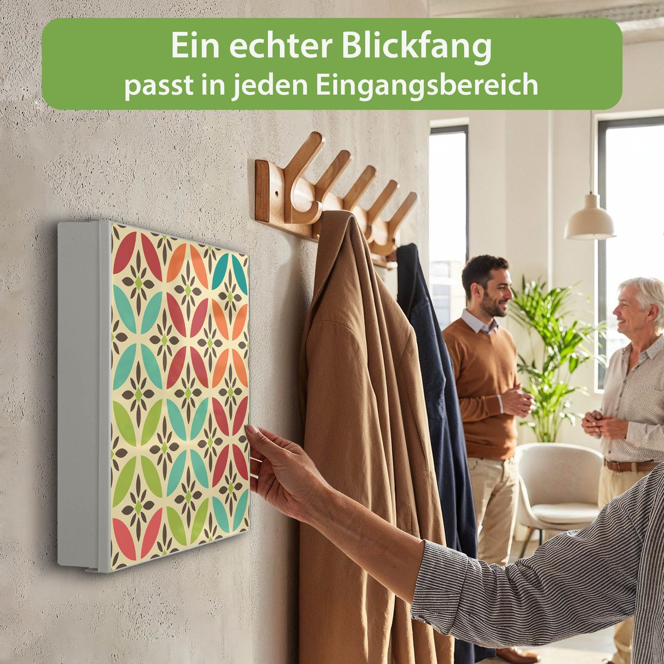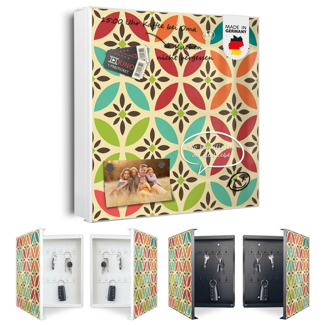 Bringe Ordnung und Eleganz in deinen Eingangsbereich mit dem banjado Schlüsselkasten Motiv Motiv Diamant Muster. Die moderne Schlüsselbox kombiniert funktionales Design mit hochwertiger Verarbeitung und wird so zu einem echten Hingucker in Flur, Büro oder Ferienwohnung. ✅ Stilvolle Schlüsselaufbewahrung mit Motiv Motiv Diamant Muster Der Design-Schlüsselkasten Motiv Motiv Diamant Muster bietet Platz für bis zu 32 Schlüssel, die auf 4 stabilen Reihen mit je 8 Haken übersichtlich verstaut werden. Mit seinen kompakten Maßen von 30 x 30 x 5 cm passt die Schlüsselbox perfekt auch in kleinere Räume. Der weiß lackierte Stahlkorpus mit links angeschlagenem Türscharnier harmoniert mit gedruckten Folie auf der Front und fügt sich nahtlos in jedes Wohnambiente ein. Ob als Schlüsselorganizer für Zuhause oder als praktische Lösung für Büros, Praxen und Gewerbe, der banjado Schlüsselkasten sorgt für Ordnung und Übersicht. Dank der magnetischen, mit Kreidestiften beschreibbaren Folie auf der Front kannst du Notizen anheften oder Termine direkt auf der Oberfläche festhalten. Die Schlüsselbox Motiv Motiv Diamant Muster zur Wandmontage wird inklusive Befestigungsmaterial geliefert und ist schnell angebracht. So hast du deine Schlüssel jederzeit griffbereit und zugleich stilvoll verstaut. Mit diesem banjado Schlüsselkasten Motiv Motiv Diamant Muster kombinierst du praktische Aufbewahrung mit stilvollem Wohndesign. Ob privat oder geschäftlich, die Schlüsselbox sorgt für mehr Ordnung, Übersicht und ein wohnliches Ambiente.Vorteile im Überblick