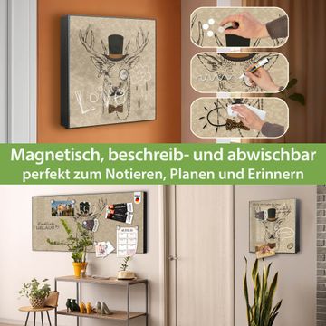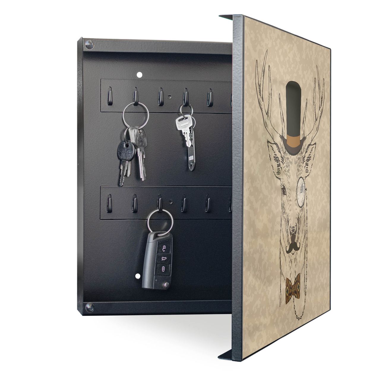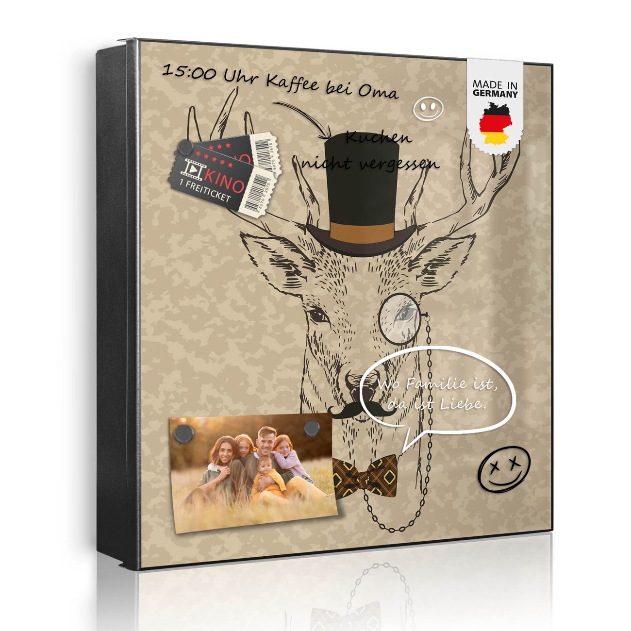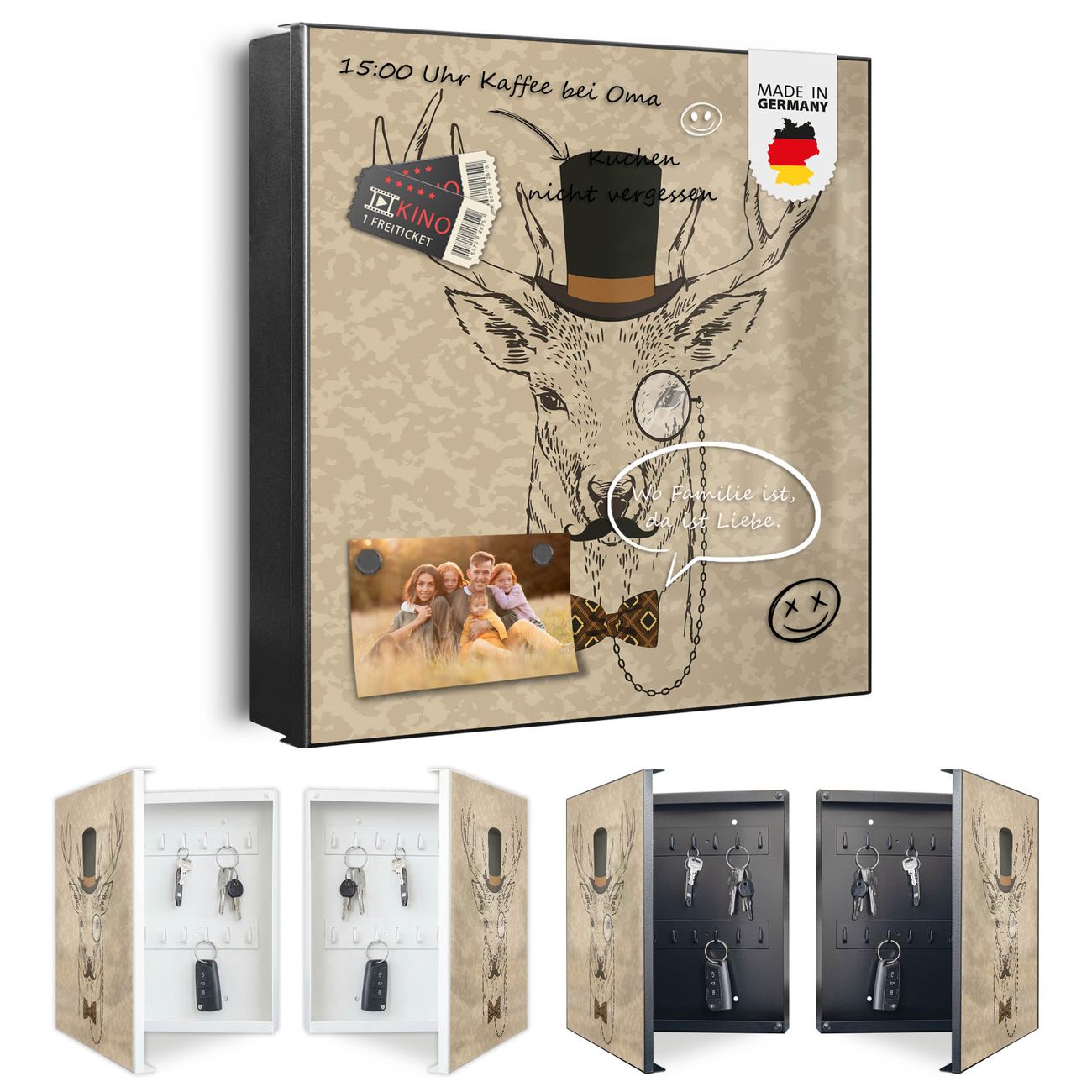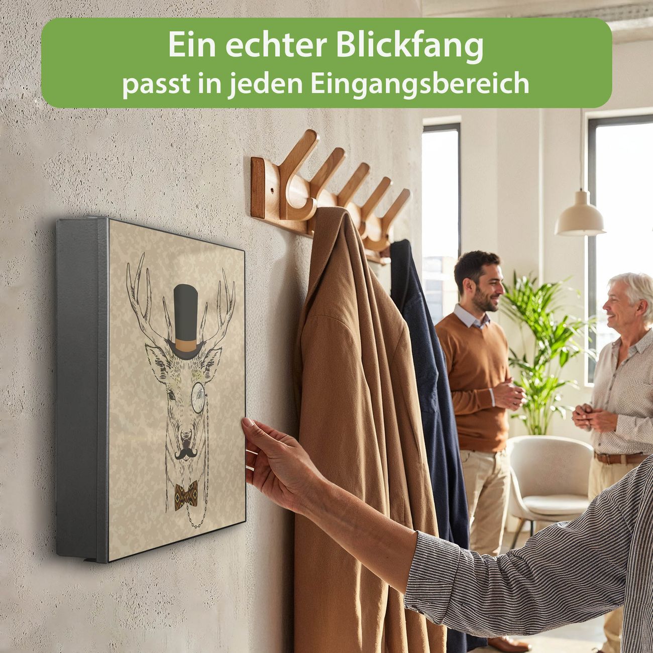 Bringe Ordnung und Eleganz in deinen Eingangsbereich mit dem banjado Schlüsselkasten Motiv Motiv Direktor Hirsch. Die moderne Schlüsselbox kombiniert funktionales Design mit hochwertiger Verarbeitung und wird so zu einem echten Hingucker in Flur, Büro oder Ferienwohnung. ✅ Stilvolle Schlüsselaufbewahrung mit Motiv Motiv Direktor Hirsch Der Design-Schlüsselkasten Motiv Motiv Direktor Hirsch bietet Platz für bis zu 32 Schlüssel, die auf 4 stabilen Reihen mit je 8 Haken übersichtlich verstaut werden. Mit seinen kompakten Maßen von 30 x 30 x 5 cm passt die Schlüsselbox perfekt auch in kleinere Räume. Der schwarz lackierte Stahlkorpus mit rechts angeschlagenem Türscharnier harmoniert mit gedruckten Folie auf der Front und fügt sich nahtlos in jedes Wohnambiente ein. Ob als Schlüsselorganizer für Zuhause oder als praktische Lösung für Büros, Praxen und Gewerbe, der banjado Schlüsselkasten sorgt für Ordnung und Übersicht. Dank der magnetischen, mit Kreidestiften beschreibbaren Folie auf der Front kannst du Notizen anheften oder Termine direkt auf der Oberfläche festhalten. Die Schlüsselbox Motiv Motiv Direktor Hirsch zur Wandmontage wird inklusive Befestigungsmaterial geliefert und ist schnell angebracht. So hast du deine Schlüssel jederzeit griffbereit und zugleich stilvoll verstaut. Mit diesem banjado Schlüsselkasten Motiv Motiv Direktor Hirsch kombinierst du praktische Aufbewahrung mit stilvollem Wohndesign. Ob privat oder geschäftlich, die Schlüsselbox sorgt für mehr Ordnung, Übersicht und ein wohnliches Ambiente.Vorteile im Überblick