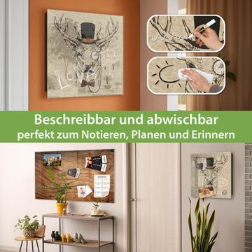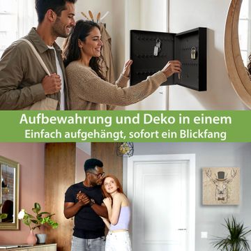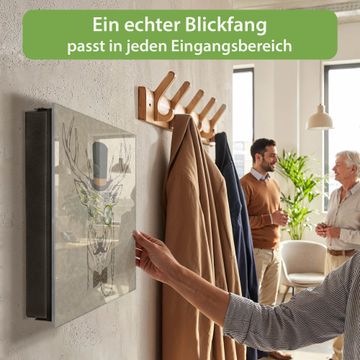 Bringe Ordnung und Eleganz in deinen Eingangsbereich mit dem banjado Schlüsselkasten Motiv Motiv Direktor Hirsch. Die moderne Schlüsselbox kombiniert funktionales Design mit hochwertiger Verarbeitung und wird so zu einem echten Hingucker in Flur, Büro oder Ferienwohnung. ✅ Stilvolle Schlüsselaufbewahrung mit Glasfront im Motiv Motiv Direktor Hirsch Der Design-Schlüsselkasten Motiv Motiv Direktor Hirsch bietet Platz für bis zu 50 Schlüssel, die auf 5 stabilen Reihen mit je 10 Haken übersichtlich verstaut werden. Mit seinen kompakten Maßen von 30 x 30 x 5 cm passt die Schlüsselbox perfekt auch in kleinere Räume. Der schwarz lackierte Stahlkorpus mit rechts angeschlagenem Türscharnier harmoniert mit der Glasfront und fügt sich nahtlos in jedes Wohnambiente ein. Ob als Schlüsselorganizer für Zuhause oder als praktische Lösung für Büros, Praxen und Gewerbe, der banjado Schlüsselkasten sorgt für Ordnung und Übersicht. Dank der magnetischen, mit Kreidestiften beschreibbaren Glasfront kannst du Notizen anheften oder Termine direkt auf der Oberfläche festhalten. Die Schlüsselbox Motiv Motiv Direktor Hirsch zur Wandmontage wird inklusive Befestigungsmaterial geliefert und ist schnell angebracht. So hast du deine Schlüssel jederzeit griffbereit und zugleich stilvoll verstaut. Mit diesem banjado Schlüsselkasten Motiv Motiv Direktor Hirsch kombinierst du praktische Aufbewahrung mit stilvollem Wohndesign. Ob privat oder geschäftlich, die Schlüsselbox sorgt für mehr Ordnung, Übersicht und ein wohnliches Ambiente.Vorteile im Überblick