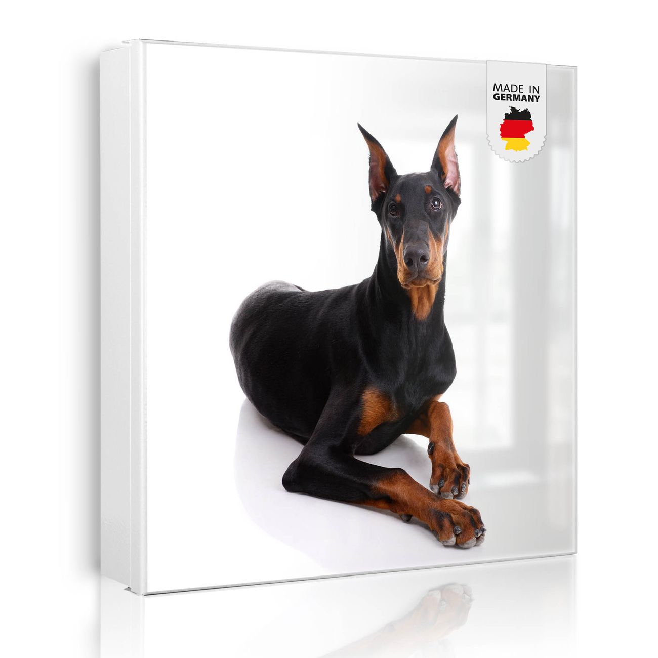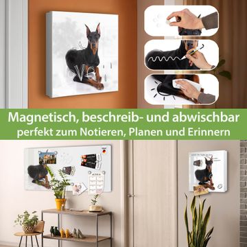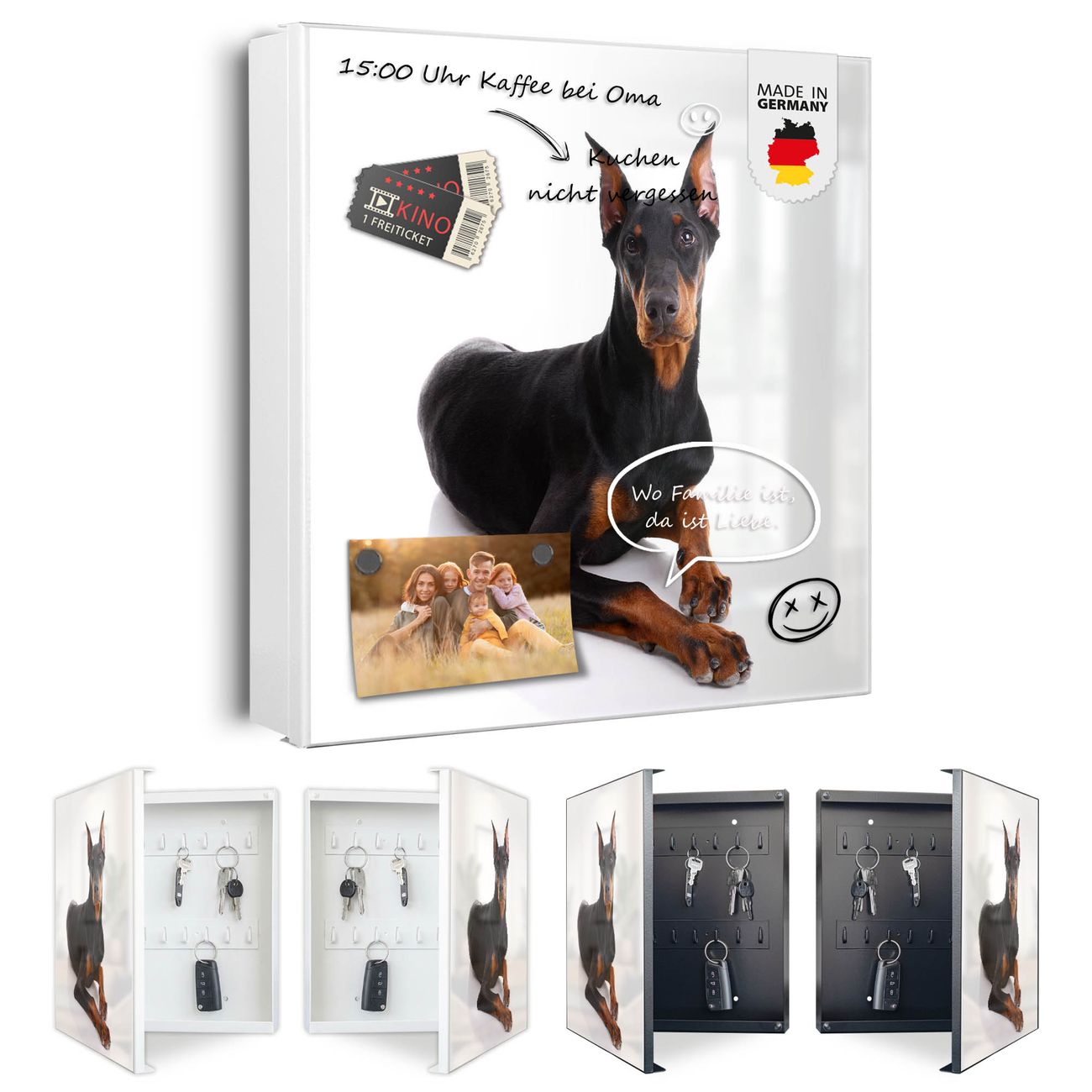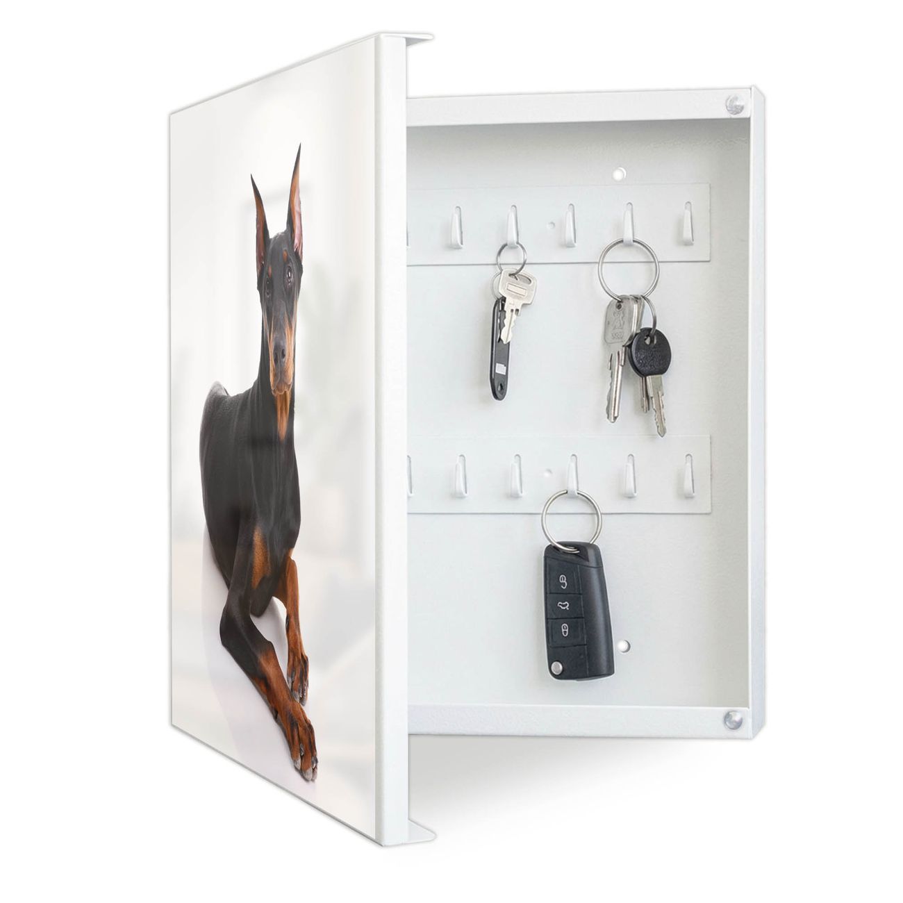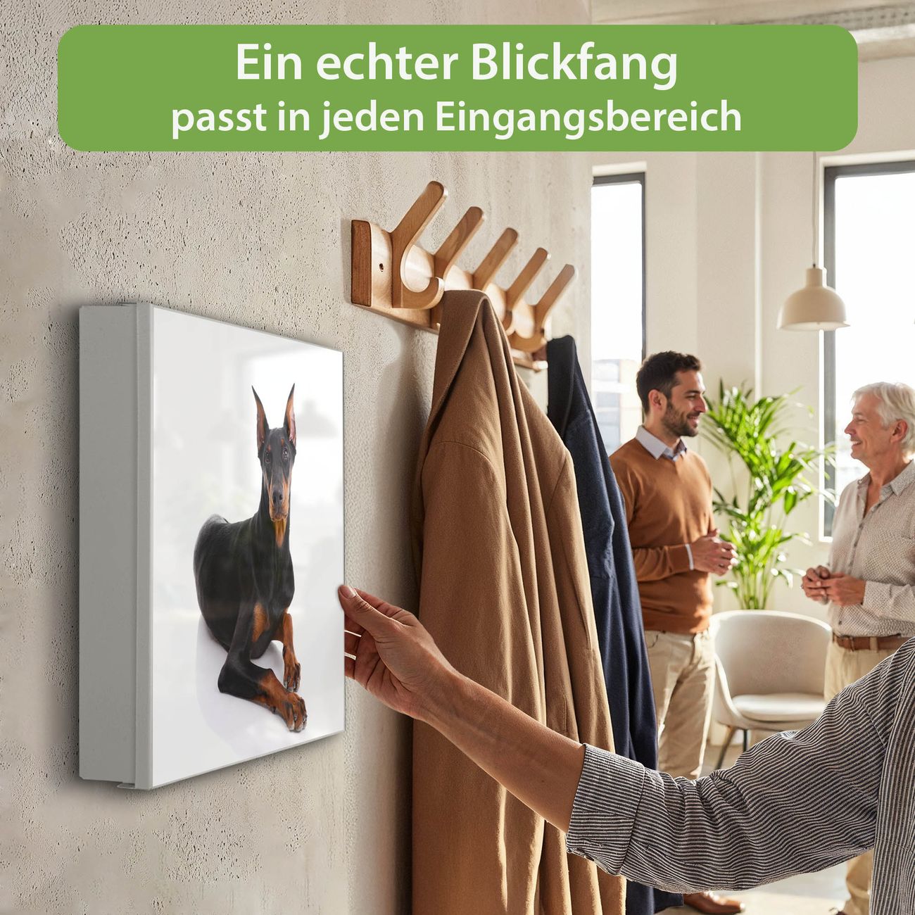Bringe Ordnung und Eleganz in deinen Eingangsbereich mit dem banjado Schlüsselkasten Motiv Motiv Dobermann. Die moderne Schlüsselbox kombiniert funktionales Design mit hochwertiger Verarbeitung und wird so zu einem echten Hingucker in Flur, Büro oder Ferienwohnung. ✅ Stilvolle Schlüsselaufbewahrung mit Motiv Motiv Dobermann Der Design-Schlüsselkasten Motiv Motiv Dobermann bietet Platz für bis zu 32 Schlüssel, die auf 4 stabilen Reihen mit je 8 Haken übersichtlich verstaut werden. Mit seinen kompakten Maßen von 30 x 30 x 5 cm passt die Schlüsselbox perfekt auch in kleinere Räume. Der weiß lackierte Stahlkorpus mit links angeschlagenem Türscharnier harmoniert mit gedruckten Folie auf der Front und fügt sich nahtlos in jedes Wohnambiente ein. Ob als Schlüsselorganizer für Zuhause oder als praktische Lösung für Büros, Praxen und Gewerbe, der banjado Schlüsselkasten sorgt für Ordnung und Übersicht. Dank der magnetischen, mit Kreidestiften beschreibbaren Folie auf der Front kannst du Notizen anheften oder Termine direkt auf der Oberfläche festhalten. Die Schlüsselbox Motiv Motiv Dobermann zur Wandmontage wird inklusive Befestigungsmaterial geliefert und ist schnell angebracht. So hast du deine Schlüssel jederzeit griffbereit und zugleich stilvoll verstaut. Mit diesem banjado Schlüsselkasten Motiv Motiv Dobermann kombinierst du praktische Aufbewahrung mit stilvollem Wohndesign. Ob privat oder geschäftlich, die Schlüsselbox sorgt für mehr Ordnung, Übersicht und ein wohnliches Ambiente.Vorteile im Überblick