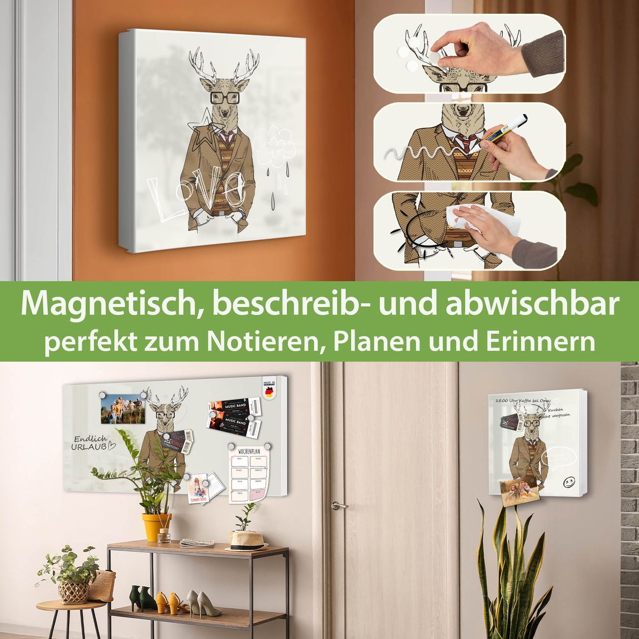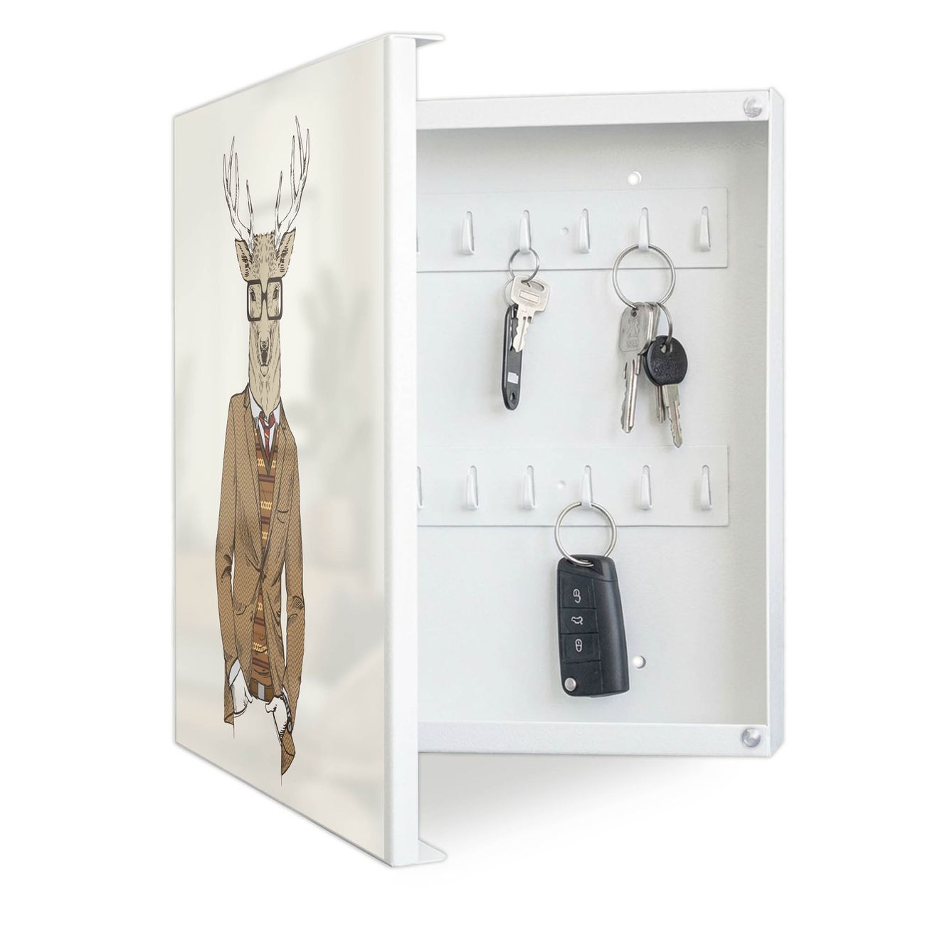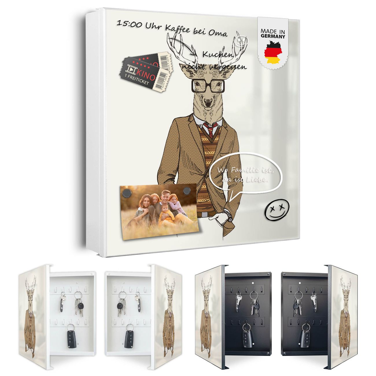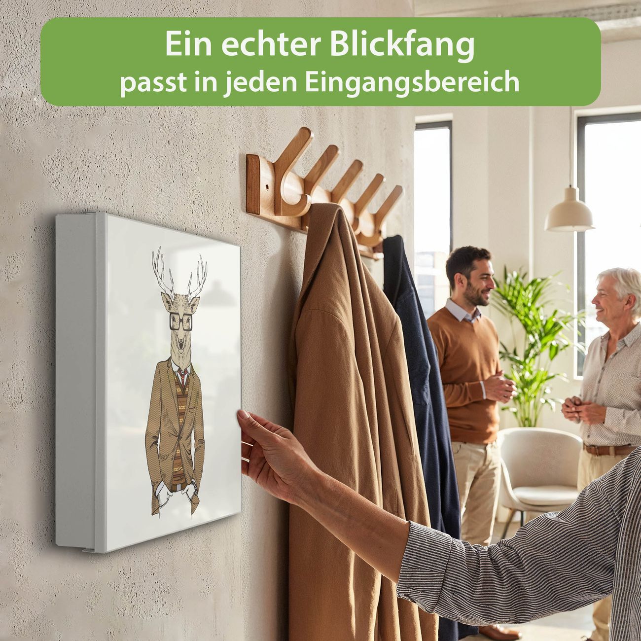 Bringe Ordnung und Eleganz in deinen Eingangsbereich mit dem banjado Schlüsselkasten Motiv Motiv Doktor Hirsch. Die moderne Schlüsselbox kombiniert funktionales Design mit hochwertiger Verarbeitung und wird so zu einem echten Hingucker in Flur, Büro oder Ferienwohnung. ✅ Stilvolle Schlüsselaufbewahrung mit Motiv Motiv Doktor Hirsch Der Design-Schlüsselkasten Motiv Motiv Doktor Hirsch bietet Platz für bis zu 32 Schlüssel, die auf 4 stabilen Reihen mit je 8 Haken übersichtlich verstaut werden. Mit seinen kompakten Maßen von 30 x 30 x 5 cm passt die Schlüsselbox perfekt auch in kleinere Räume. Der weiß lackierte Stahlkorpus mit links angeschlagenem Türscharnier harmoniert mit gedruckten Folie auf der Front und fügt sich nahtlos in jedes Wohnambiente ein. Ob als Schlüsselorganizer für Zuhause oder als praktische Lösung für Büros, Praxen und Gewerbe, der banjado Schlüsselkasten sorgt für Ordnung und Übersicht. Dank der magnetischen, mit Kreidestiften beschreibbaren Folie auf der Front kannst du Notizen anheften oder Termine direkt auf der Oberfläche festhalten. Die Schlüsselbox Motiv Motiv Doktor Hirsch zur Wandmontage wird inklusive Befestigungsmaterial geliefert und ist schnell angebracht. So hast du deine Schlüssel jederzeit griffbereit und zugleich stilvoll verstaut. Mit diesem banjado Schlüsselkasten Motiv Motiv Doktor Hirsch kombinierst du praktische Aufbewahrung mit stilvollem Wohndesign. Ob privat oder geschäftlich, die Schlüsselbox sorgt für mehr Ordnung, Übersicht und ein wohnliches Ambiente.Vorteile im Überblick