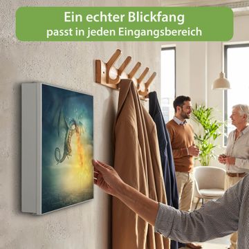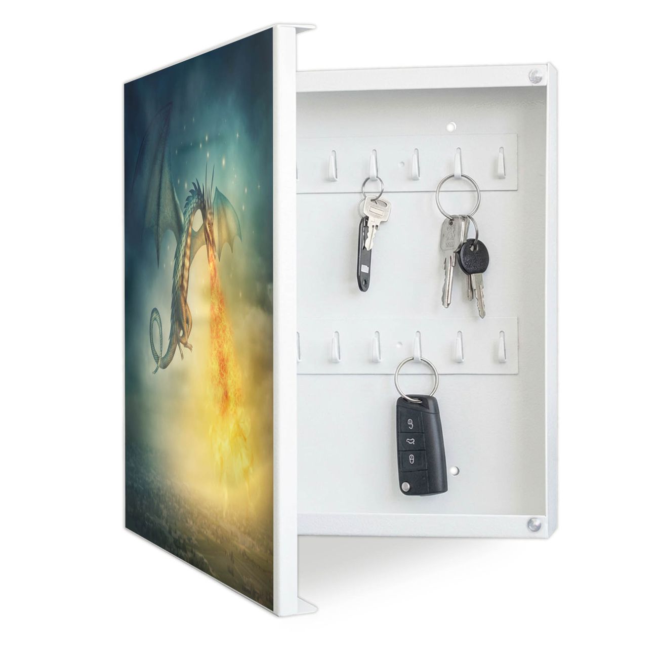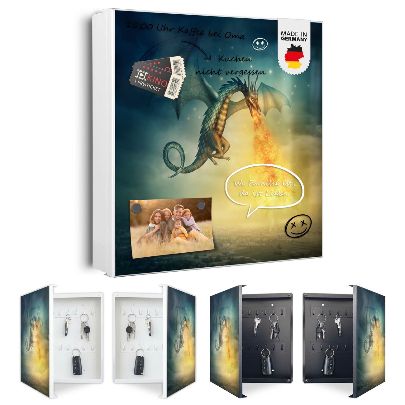 Bringe Ordnung und Eleganz in deinen Eingangsbereich mit dem banjado Schlüsselkasten Motiv Motiv Drachen. Die moderne Schlüsselbox kombiniert funktionales Design mit hochwertiger Verarbeitung und wird so zu einem echten Hingucker in Flur, Büro oder Ferienwohnung. ✅ Stilvolle Schlüsselaufbewahrung mit Motiv Motiv Drachen Der Design-Schlüsselkasten Motiv Motiv Drachen bietet Platz für bis zu 32 Schlüssel, die auf 4 stabilen Reihen mit je 8 Haken übersichtlich verstaut werden. Mit seinen kompakten Maßen von 30 x 30 x 5 cm passt die Schlüsselbox perfekt auch in kleinere Räume. Der weiß lackierte Stahlkorpus mit links angeschlagenem Türscharnier harmoniert mit gedruckten Folie auf der Front und fügt sich nahtlos in jedes Wohnambiente ein. Ob als Schlüsselorganizer für Zuhause oder als praktische Lösung für Büros, Praxen und Gewerbe, der banjado Schlüsselkasten sorgt für Ordnung und Übersicht. Dank der magnetischen, mit Kreidestiften beschreibbaren Folie auf der Front kannst du Notizen anheften oder Termine direkt auf der Oberfläche festhalten. Die Schlüsselbox Motiv Motiv Drachen zur Wandmontage wird inklusive Befestigungsmaterial geliefert und ist schnell angebracht. So hast du deine Schlüssel jederzeit griffbereit und zugleich stilvoll verstaut. Mit diesem banjado Schlüsselkasten Motiv Motiv Drachen kombinierst du praktische Aufbewahrung mit stilvollem Wohndesign. Ob privat oder geschäftlich, die Schlüsselbox sorgt für mehr Ordnung, Übersicht und ein wohnliches Ambiente.Vorteile im Überblick