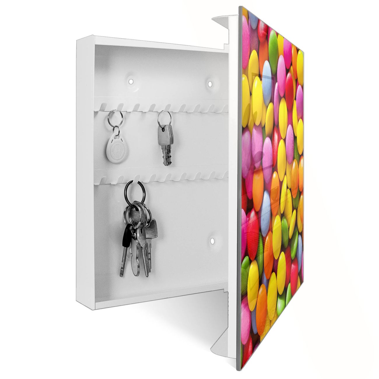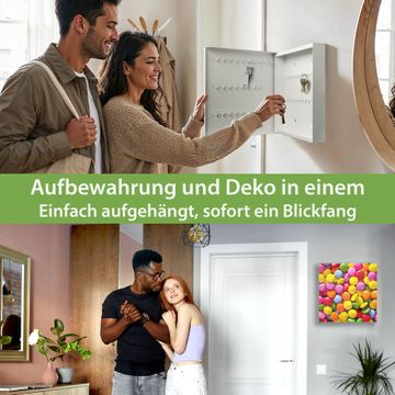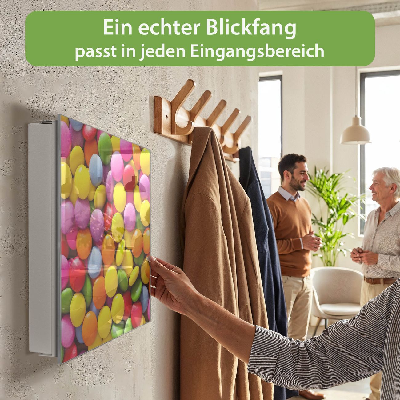 Bringe Ordnung und Eleganz in deinen Eingangsbereich mit dem banjado Schlüsselkasten Motiv Motiv Dragees. Die moderne Schlüsselbox kombiniert funktionales Design mit hochwertiger Verarbeitung und wird so zu einem echten Hingucker in Flur, Büro oder Ferienwohnung. ✅ Stilvolle Schlüsselaufbewahrung mit Glasfront im Motiv Motiv Dragees Der Design-Schlüsselkasten Motiv Motiv Dragees bietet Platz für bis zu 50 Schlüssel, die auf 5 stabilen Reihen mit je 10 Haken übersichtlich verstaut werden. Mit seinen kompakten Maßen von 30 x 30 x 5 cm passt die Schlüsselbox perfekt auch in kleinere Räume. Der weiß lackierte Stahlkorpus mit rechts angeschlagenem Türscharnier harmoniert mit der Glasfront und fügt sich nahtlos in jedes Wohnambiente ein. Ob als Schlüsselorganizer für Zuhause oder als praktische Lösung für Büros, Praxen und Gewerbe, der banjado Schlüsselkasten sorgt für Ordnung und Übersicht. Dank der magnetischen, mit Kreidestiften beschreibbaren Glasfront kannst du Notizen anheften oder Termine direkt auf der Oberfläche festhalten. Die Schlüsselbox Motiv Motiv Dragees zur Wandmontage wird inklusive Befestigungsmaterial geliefert und ist schnell angebracht. So hast du deine Schlüssel jederzeit griffbereit und zugleich stilvoll verstaut. Mit diesem banjado Schlüsselkasten Motiv Motiv Dragees kombinierst du praktische Aufbewahrung mit stilvollem Wohndesign. Ob privat oder geschäftlich, die Schlüsselbox sorgt für mehr Ordnung, Übersicht und ein wohnliches Ambiente.Vorteile im Überblick
