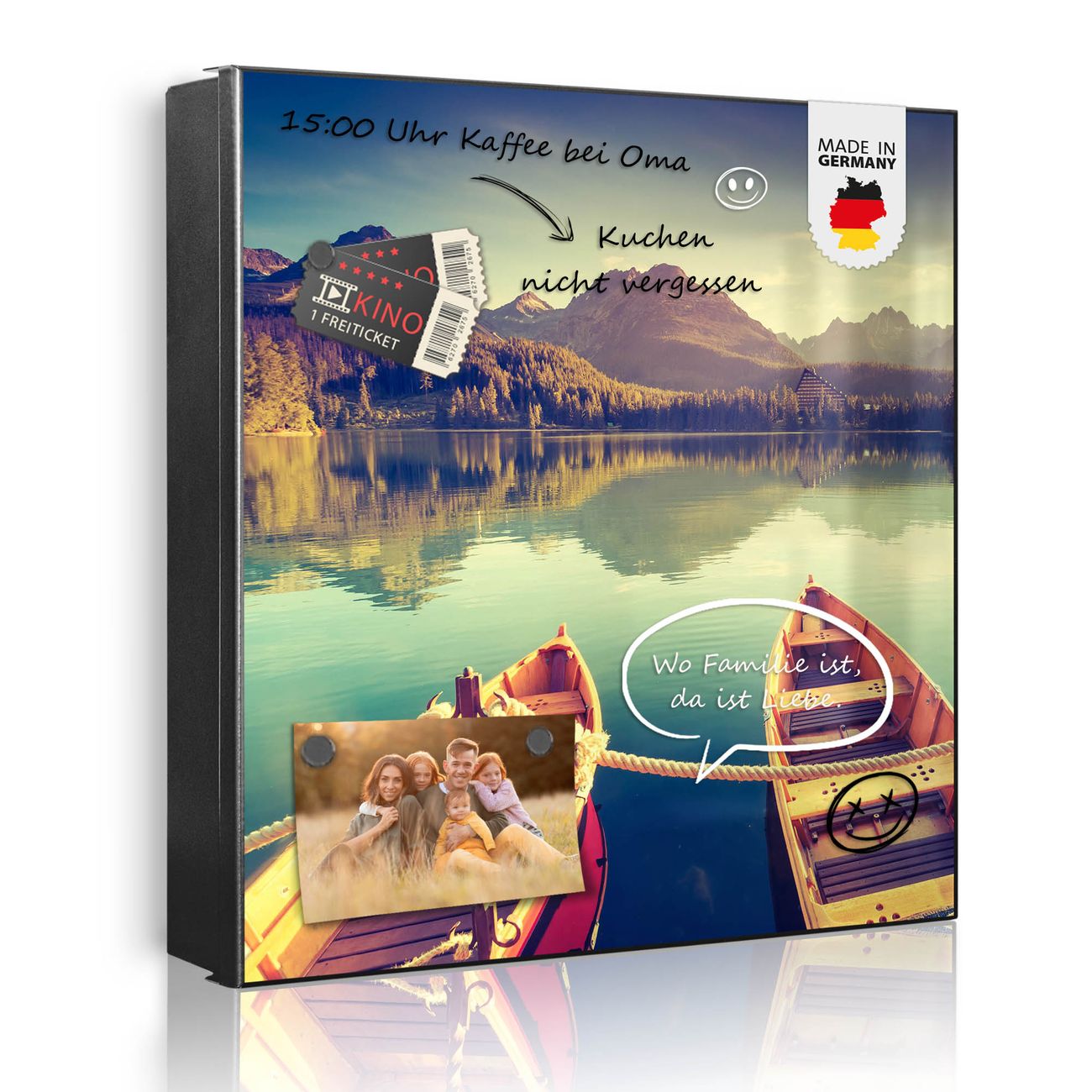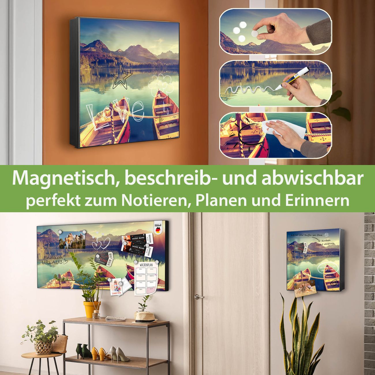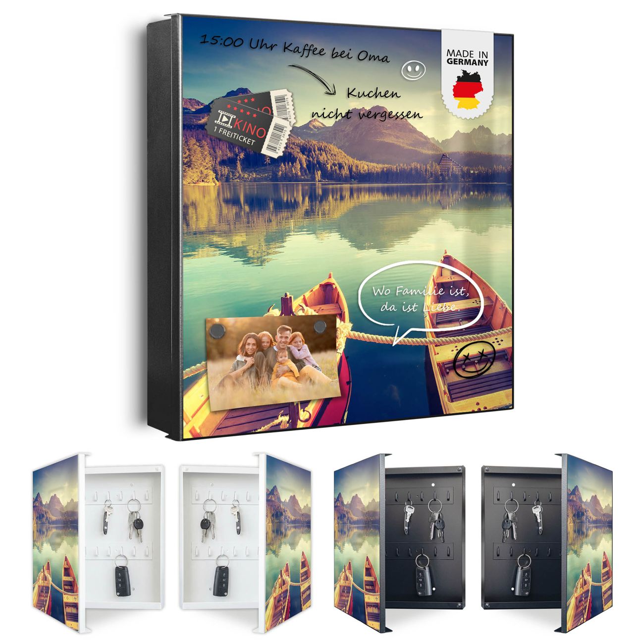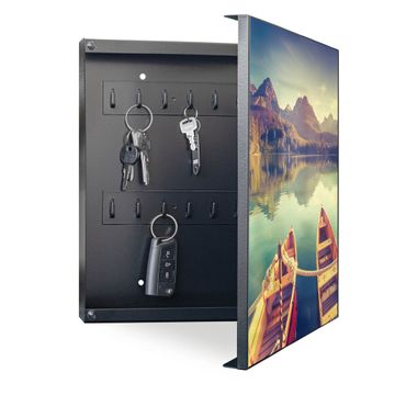 Bringe Ordnung und Eleganz in deinen Eingangsbereich mit dem banjado Schlüsselkasten Motiv Motiv Drei Boote Am Steg. Die moderne Schlüsselbox kombiniert funktionales Design mit hochwertiger Verarbeitung und wird so zu einem echten Hingucker in Flur, Büro oder Ferienwohnung. ✅ Stilvolle Schlüsselaufbewahrung mit Motiv Motiv Drei Boote Am Steg Der Design-Schlüsselkasten Motiv Motiv Drei Boote Am Steg bietet Platz für bis zu 32 Schlüssel, die auf 4 stabilen Reihen mit je 8 Haken übersichtlich verstaut werden. Mit seinen kompakten Maßen von 30 x 30 x 5 cm passt die Schlüsselbox perfekt auch in kleinere Räume. Der schwarz lackierte Stahlkorpus mit rechts angeschlagenem Türscharnier harmoniert mit gedruckten Folie auf der Front und fügt sich nahtlos in jedes Wohnambiente ein. Ob als Schlüsselorganizer für Zuhause oder als praktische Lösung für Büros, Praxen und Gewerbe, der banjado Schlüsselkasten sorgt für Ordnung und Übersicht. Dank der magnetischen, mit Kreidestiften beschreibbaren Folie auf der Front kannst du Notizen anheften oder Termine direkt auf der Oberfläche festhalten. Die Schlüsselbox Motiv Motiv Drei Boote Am Steg zur Wandmontage wird inklusive Befestigungsmaterial geliefert und ist schnell angebracht. So hast du deine Schlüssel jederzeit griffbereit und zugleich stilvoll verstaut. Mit diesem banjado Schlüsselkasten Motiv Motiv Drei Boote Am Steg kombinierst du praktische Aufbewahrung mit stilvollem Wohndesign. Ob privat oder geschäftlich, die Schlüsselbox sorgt für mehr Ordnung, Übersicht und ein wohnliches Ambiente.Vorteile im Überblick