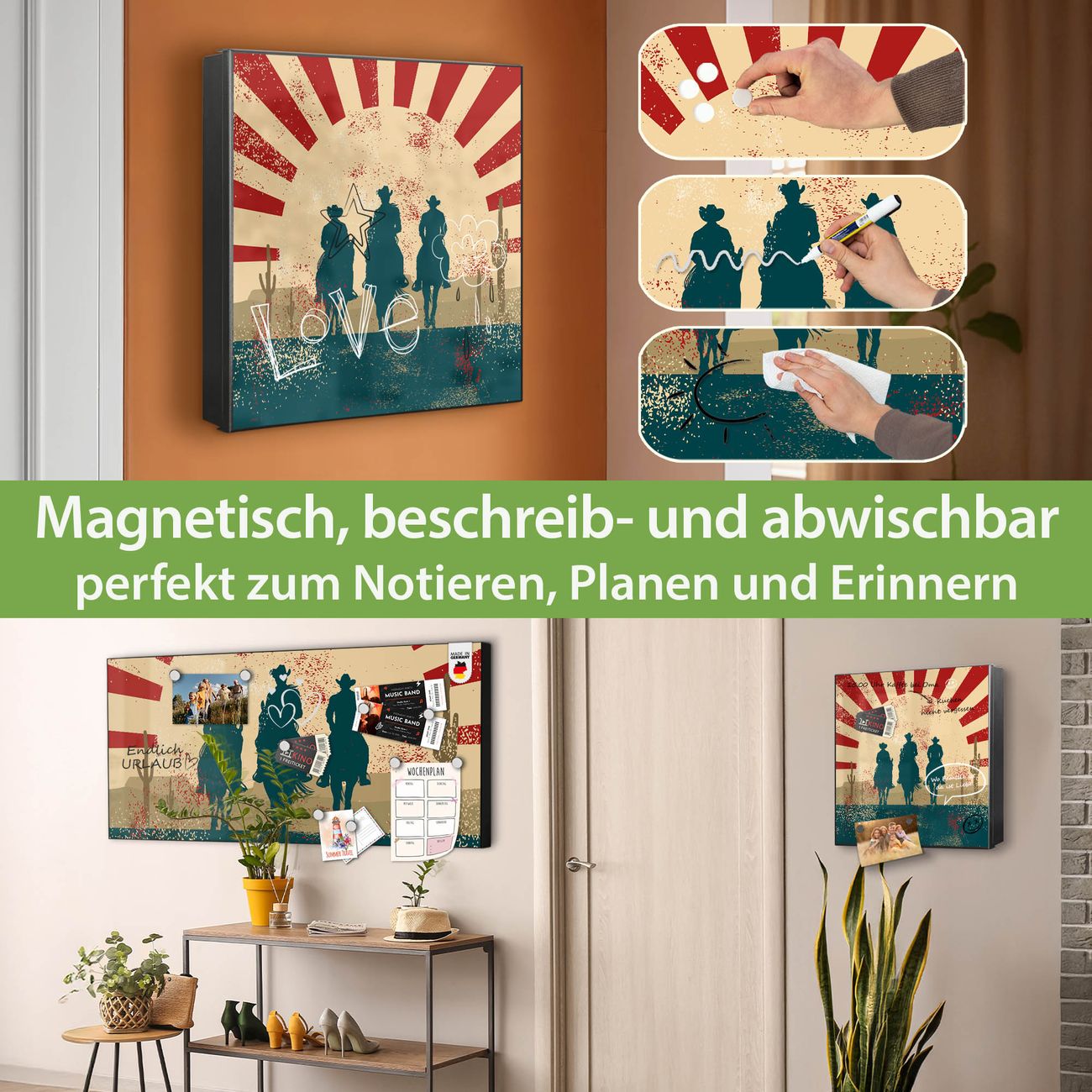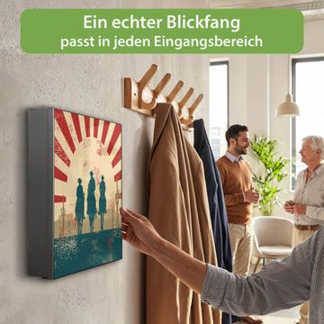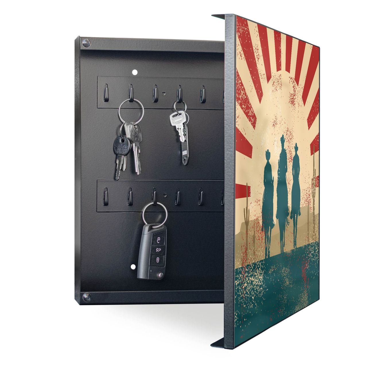 Bringe Ordnung und Eleganz in deinen Eingangsbereich mit dem banjado Schlüsselkasten Motiv Motiv Drei Cowboys. Die moderne Schlüsselbox kombiniert funktionales Design mit hochwertiger Verarbeitung und wird so zu einem echten Hingucker in Flur, Büro oder Ferienwohnung. ✅ Stilvolle Schlüsselaufbewahrung mit Motiv Motiv Drei Cowboys Der Design-Schlüsselkasten Motiv Motiv Drei Cowboys bietet Platz für bis zu 32 Schlüssel, die auf 4 stabilen Reihen mit je 8 Haken übersichtlich verstaut werden. Mit seinen kompakten Maßen von 30 x 30 x 5 cm passt die Schlüsselbox perfekt auch in kleinere Räume. Der schwarz lackierte Stahlkorpus mit rechts angeschlagenem Türscharnier harmoniert mit gedruckten Folie auf der Front und fügt sich nahtlos in jedes Wohnambiente ein. Ob als Schlüsselorganizer für Zuhause oder als praktische Lösung für Büros, Praxen und Gewerbe, der banjado Schlüsselkasten sorgt für Ordnung und Übersicht. Dank der magnetischen, mit Kreidestiften beschreibbaren Folie auf der Front kannst du Notizen anheften oder Termine direkt auf der Oberfläche festhalten. Die Schlüsselbox Motiv Motiv Drei Cowboys zur Wandmontage wird inklusive Befestigungsmaterial geliefert und ist schnell angebracht. So hast du deine Schlüssel jederzeit griffbereit und zugleich stilvoll verstaut. Mit diesem banjado Schlüsselkasten Motiv Motiv Drei Cowboys kombinierst du praktische Aufbewahrung mit stilvollem Wohndesign. Ob privat oder geschäftlich, die Schlüsselbox sorgt für mehr Ordnung, Übersicht und ein wohnliches Ambiente.Vorteile im Überblick