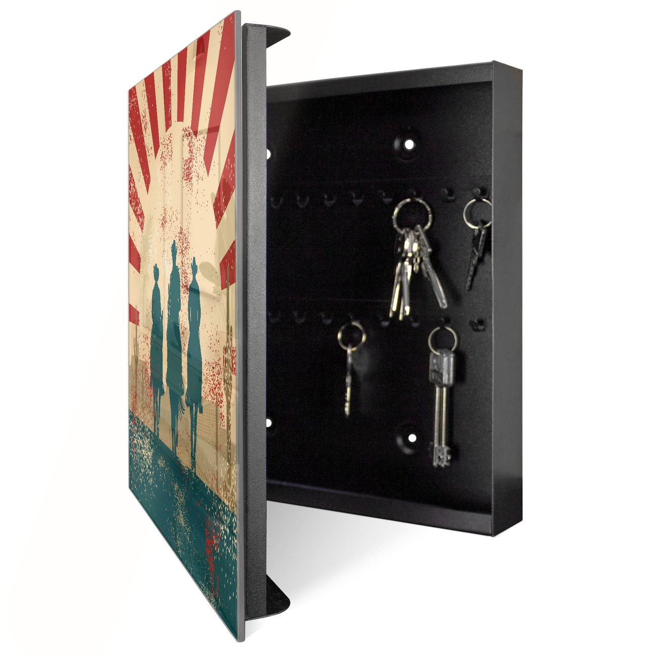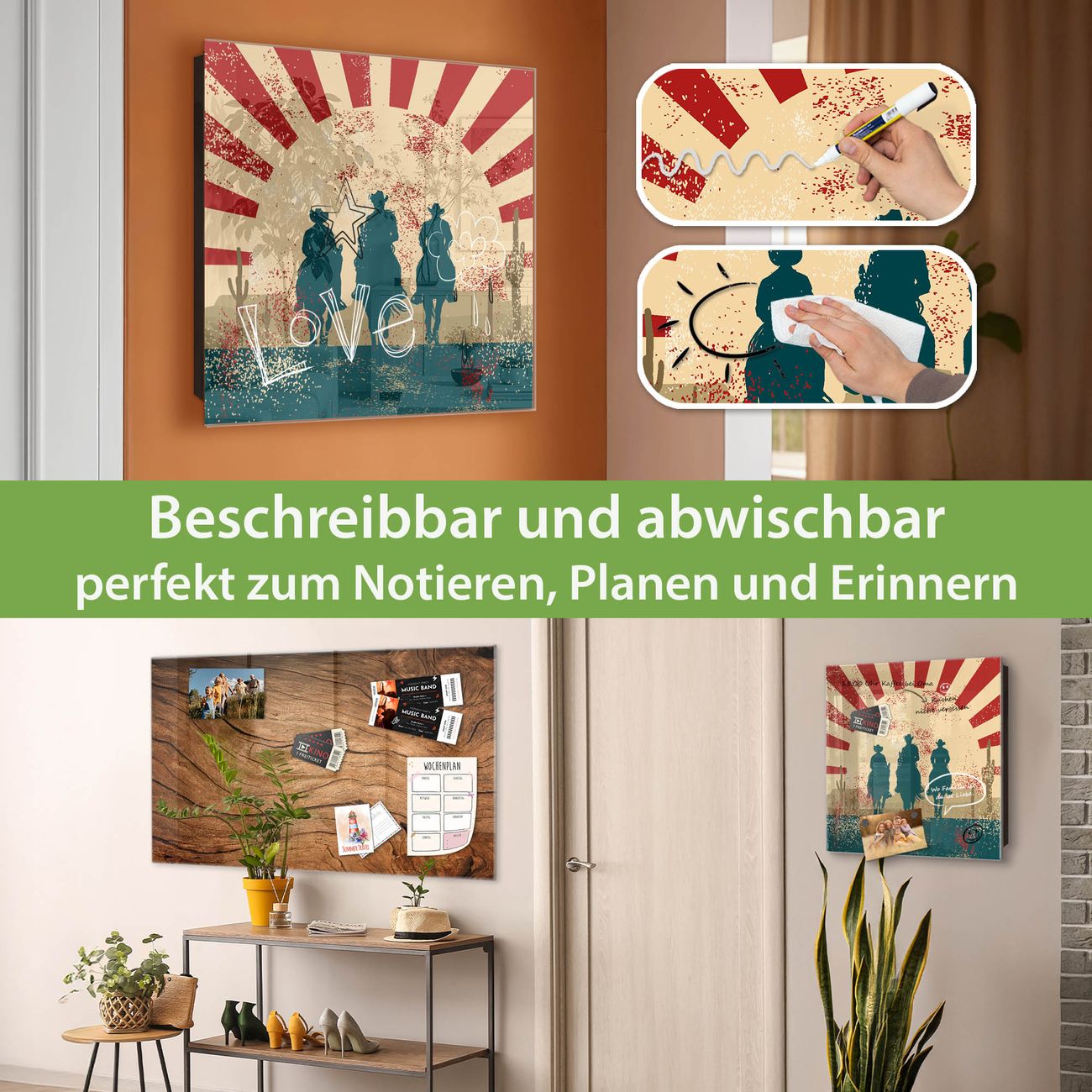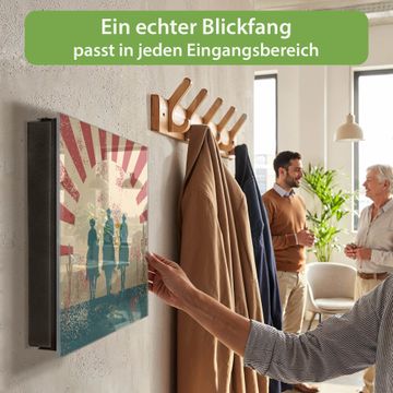 Bringe Ordnung und Eleganz in deinen Eingangsbereich mit dem banjado Schlüsselkasten Motiv Motiv Drei Cowboys. Die moderne Schlüsselbox kombiniert funktionales Design mit hochwertiger Verarbeitung und wird so zu einem echten Hingucker in Flur, Büro oder Ferienwohnung. ✅ Stilvolle Schlüsselaufbewahrung mit Glasfront im Motiv Motiv Drei Cowboys Der Design-Schlüsselkasten Motiv Motiv Drei Cowboys bietet Platz für bis zu 50 Schlüssel, die auf 5 stabilen Reihen mit je 10 Haken übersichtlich verstaut werden. Mit seinen kompakten Maßen von 30 x 30 x 5 cm passt die Schlüsselbox perfekt auch in kleinere Räume. Der schwarz lackierte Stahlkorpus mit rechts angeschlagenem Türscharnier harmoniert mit der Glasfront und fügt sich nahtlos in jedes Wohnambiente ein. Ob als Schlüsselorganizer für Zuhause oder als praktische Lösung für Büros, Praxen und Gewerbe, der banjado Schlüsselkasten sorgt für Ordnung und Übersicht. Dank der magnetischen, mit Kreidestiften beschreibbaren Glasfront kannst du Notizen anheften oder Termine direkt auf der Oberfläche festhalten. Die Schlüsselbox Motiv Motiv Drei Cowboys zur Wandmontage wird inklusive Befestigungsmaterial geliefert und ist schnell angebracht. So hast du deine Schlüssel jederzeit griffbereit und zugleich stilvoll verstaut. Mit diesem banjado Schlüsselkasten Motiv Motiv Drei Cowboys kombinierst du praktische Aufbewahrung mit stilvollem Wohndesign. Ob privat oder geschäftlich, die Schlüsselbox sorgt für mehr Ordnung, Übersicht und ein wohnliches Ambiente.Vorteile im Überblick