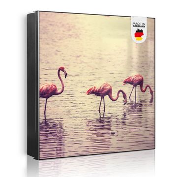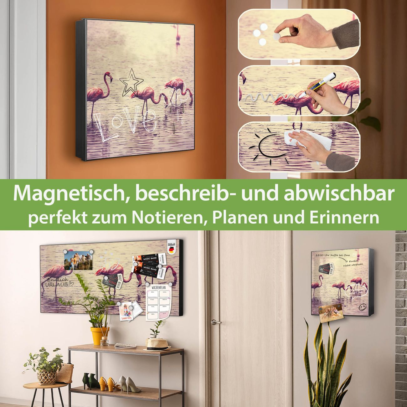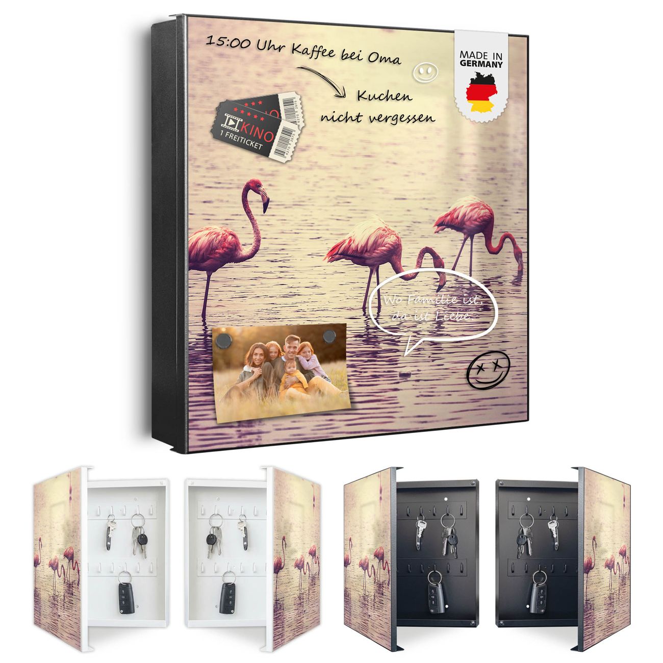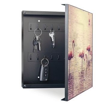Bringe Ordnung und Eleganz in deinen Eingangsbereich mit dem banjado Schlüsselkasten Motiv Motiv Drei Flamnigos . Die moderne Schlüsselbox kombiniert funktionales Design mit hochwertiger Verarbeitung und wird so zu einem echten Hingucker in Flur, Büro oder Ferienwohnung. ✅ Stilvolle Schlüsselaufbewahrung mit Motiv Motiv Drei Flamnigos Der Design-Schlüsselkasten Motiv Motiv Drei Flamnigos bietet Platz für bis zu 32 Schlüssel, die auf 4 stabilen Reihen mit je 8 Haken übersichtlich verstaut werden. Mit seinen kompakten Maßen von 30 x 30 x 5 cm passt die Schlüsselbox perfekt auch in kleinere Räume. Der schwarz lackierte Stahlkorpus mit rechts angeschlagenem Türscharnier harmoniert mit gedruckten Folie auf der Front und fügt sich nahtlos in jedes Wohnambiente ein. Ob als Schlüsselorganizer für Zuhause oder als praktische Lösung für Büros, Praxen und Gewerbe, der banjado Schlüsselkasten sorgt für Ordnung und Übersicht. Dank der magnetischen, mit Kreidestiften beschreibbaren Folie auf der Front kannst du Notizen anheften oder Termine direkt auf der Oberfläche festhalten. Die Schlüsselbox Motiv Motiv Drei Flamnigos zur Wandmontage wird inklusive Befestigungsmaterial geliefert und ist schnell angebracht. So hast du deine Schlüssel jederzeit griffbereit und zugleich stilvoll verstaut. Mit diesem banjado Schlüsselkasten Motiv Motiv Drei Flamnigos kombinierst du praktische Aufbewahrung mit stilvollem Wohndesign. Ob privat oder geschäftlich, die Schlüsselbox sorgt für mehr Ordnung, Übersicht und ein wohnliches Ambiente.Vorteile im Überblick