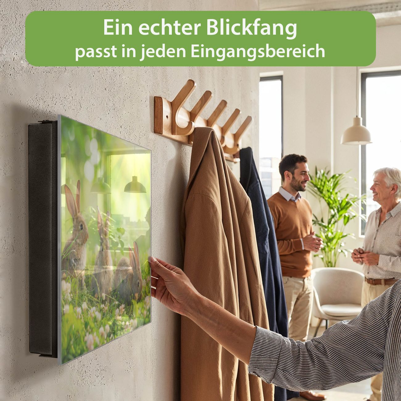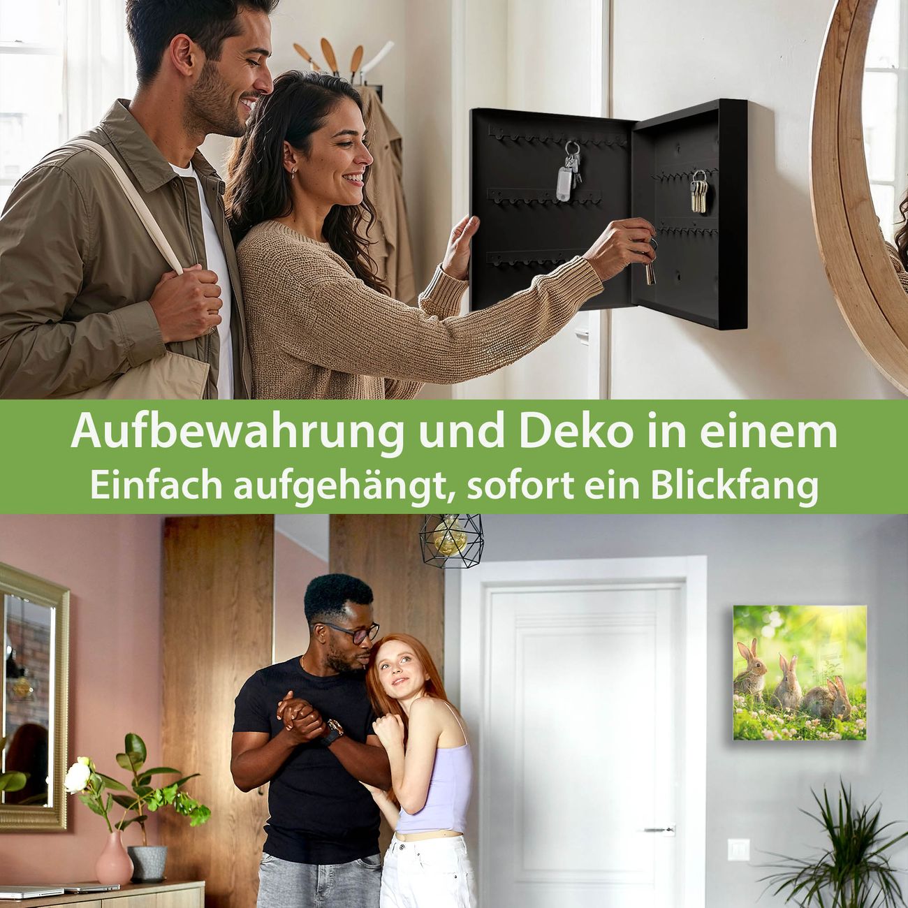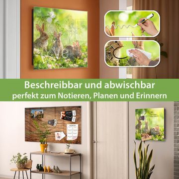 Bringe Ordnung und Eleganz in deinen Eingangsbereich mit dem banjado Schlüsselkasten Motiv Motiv Drei Hasen. Die moderne Schlüsselbox kombiniert funktionales Design mit hochwertiger Verarbeitung und wird so zu einem echten Hingucker in Flur, Büro oder Ferienwohnung. ✅ Stilvolle Schlüsselaufbewahrung mit Glasfront im Motiv Motiv Drei Hasen Der Design-Schlüsselkasten Motiv Motiv Drei Hasen bietet Platz für bis zu 50 Schlüssel, die auf 5 stabilen Reihen mit je 10 Haken übersichtlich verstaut werden. Mit seinen kompakten Maßen von 30 x 30 x 5 cm passt die Schlüsselbox perfekt auch in kleinere Räume. Der schwarz lackierte Stahlkorpus mit rechts angeschlagenem Türscharnier harmoniert mit der Glasfront und fügt sich nahtlos in jedes Wohnambiente ein. Ob als Schlüsselorganizer für Zuhause oder als praktische Lösung für Büros, Praxen und Gewerbe, der banjado Schlüsselkasten sorgt für Ordnung und Übersicht. Dank der magnetischen, mit Kreidestiften beschreibbaren Glasfront kannst du Notizen anheften oder Termine direkt auf der Oberfläche festhalten. Die Schlüsselbox Motiv Motiv Drei Hasen zur Wandmontage wird inklusive Befestigungsmaterial geliefert und ist schnell angebracht. So hast du deine Schlüssel jederzeit griffbereit und zugleich stilvoll verstaut. Mit diesem banjado Schlüsselkasten Motiv Motiv Drei Hasen kombinierst du praktische Aufbewahrung mit stilvollem Wohndesign. Ob privat oder geschäftlich, die Schlüsselbox sorgt für mehr Ordnung, Übersicht und ein wohnliches Ambiente.Vorteile im Überblick