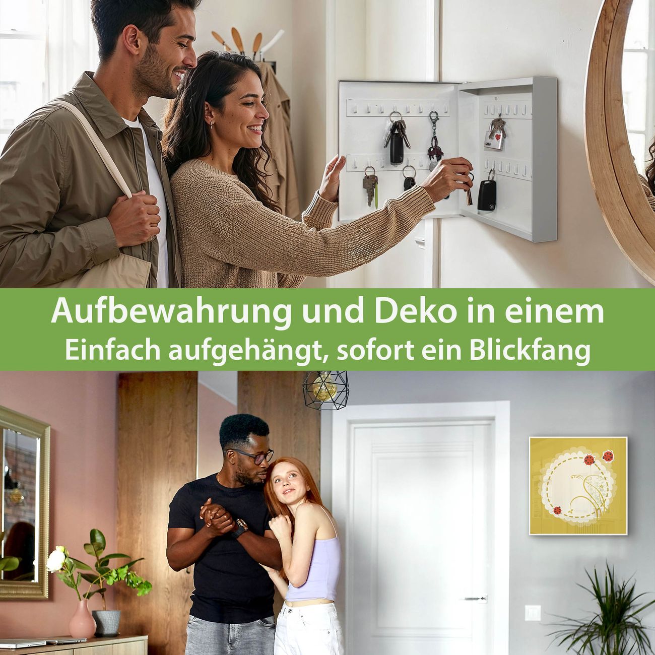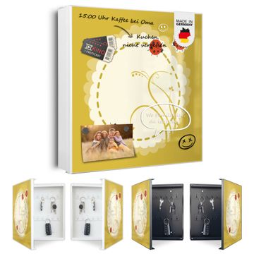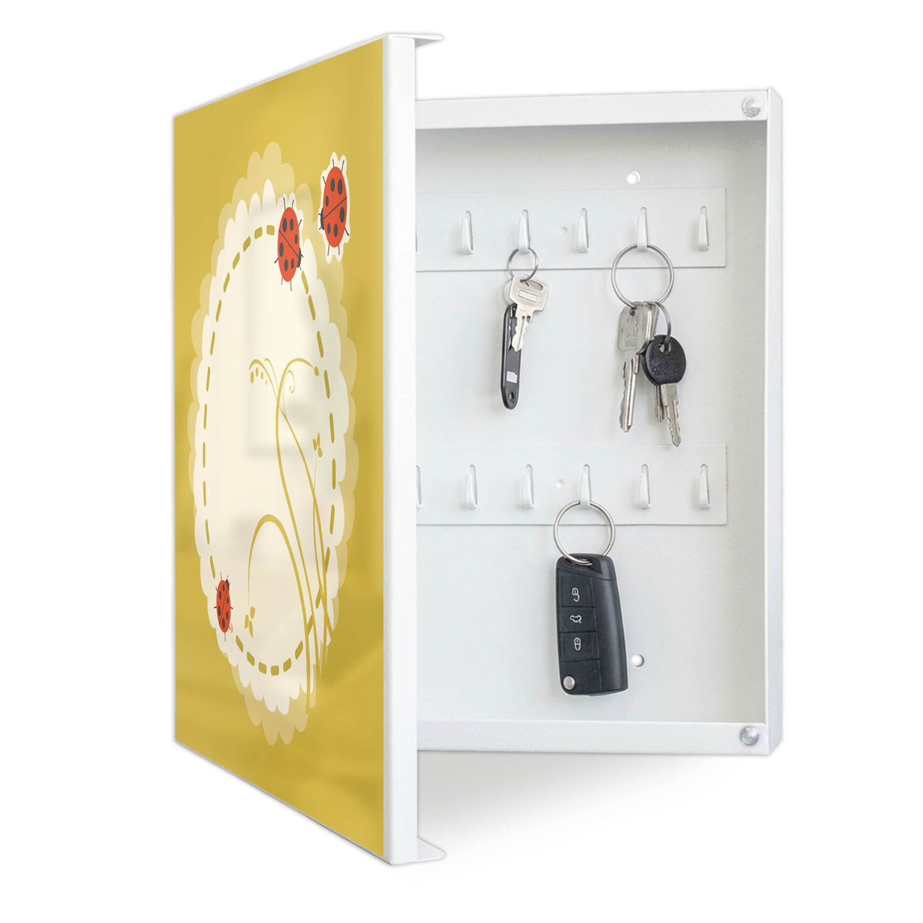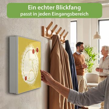 Bringe Ordnung und Eleganz in deinen Eingangsbereich mit dem banjado Schlüsselkasten Motiv Motiv Drei Marienkäfer. Die moderne Schlüsselbox kombiniert funktionales Design mit hochwertiger Verarbeitung und wird so zu einem echten Hingucker in Flur, Büro oder Ferienwohnung. ✅ Stilvolle Schlüsselaufbewahrung mit Motiv Motiv Drei Marienkäfer Der Design-Schlüsselkasten Motiv Motiv Drei Marienkäfer bietet Platz für bis zu 32 Schlüssel, die auf 4 stabilen Reihen mit je 8 Haken übersichtlich verstaut werden. Mit seinen kompakten Maßen von 30 x 30 x 5 cm passt die Schlüsselbox perfekt auch in kleinere Räume. Der weiß lackierte Stahlkorpus mit links angeschlagenem Türscharnier harmoniert mit gedruckten Folie auf der Front und fügt sich nahtlos in jedes Wohnambiente ein. Ob als Schlüsselorganizer für Zuhause oder als praktische Lösung für Büros, Praxen und Gewerbe, der banjado Schlüsselkasten sorgt für Ordnung und Übersicht. Dank der magnetischen, mit Kreidestiften beschreibbaren Folie auf der Front kannst du Notizen anheften oder Termine direkt auf der Oberfläche festhalten. Die Schlüsselbox Motiv Motiv Drei Marienkäfer zur Wandmontage wird inklusive Befestigungsmaterial geliefert und ist schnell angebracht. So hast du deine Schlüssel jederzeit griffbereit und zugleich stilvoll verstaut. Mit diesem banjado Schlüsselkasten Motiv Motiv Drei Marienkäfer kombinierst du praktische Aufbewahrung mit stilvollem Wohndesign. Ob privat oder geschäftlich, die Schlüsselbox sorgt für mehr Ordnung, Übersicht und ein wohnliches Ambiente.Vorteile im Überblick
