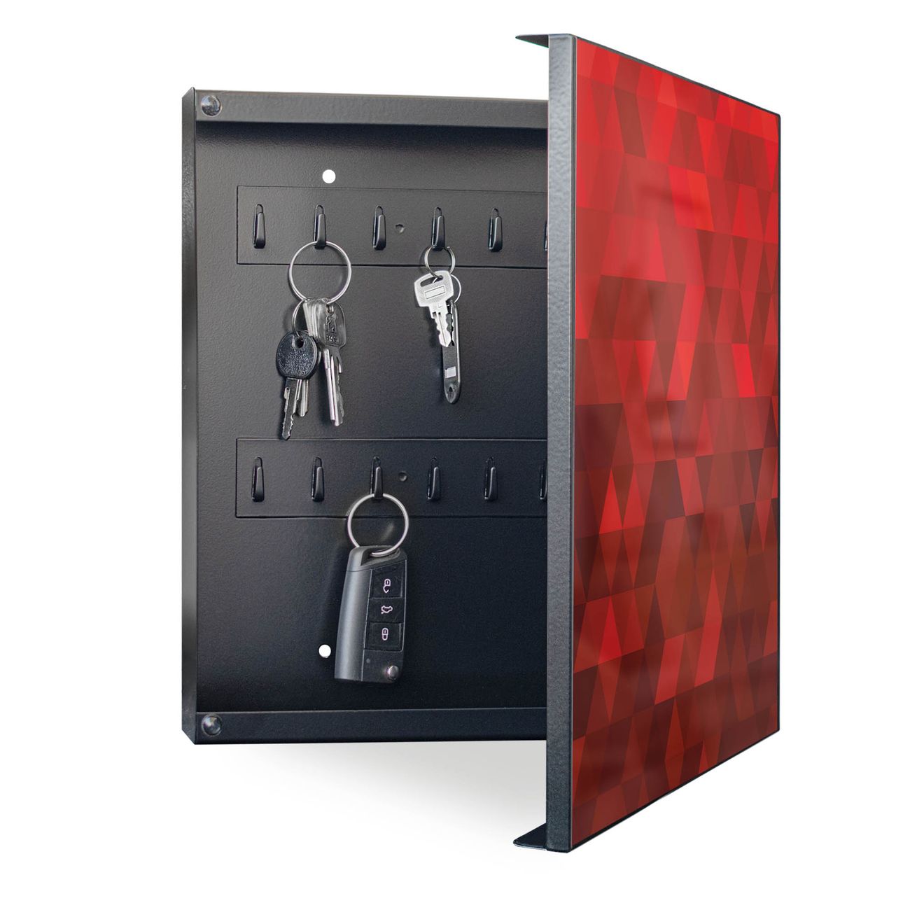 Bringe Ordnung und Eleganz in deinen Eingangsbereich mit dem banjado Schlüsselkasten Motiv Motiv Dreiecke Rot. Die moderne Schlüsselbox kombiniert funktionales Design mit hochwertiger Verarbeitung und wird so zu einem echten Hingucker in Flur, Büro oder Ferienwohnung. ✅ Stilvolle Schlüsselaufbewahrung mit Motiv Motiv Dreiecke Rot Der Design-Schlüsselkasten Motiv Motiv Dreiecke Rot bietet Platz für bis zu 32 Schlüssel, die auf 4 stabilen Reihen mit je 8 Haken übersichtlich verstaut werden. Mit seinen kompakten Maßen von 30 x 30 x 5 cm passt die Schlüsselbox perfekt auch in kleinere Räume. Der schwarz lackierte Stahlkorpus mit rechts angeschlagenem Türscharnier harmoniert mit gedruckten Folie auf der Front und fügt sich nahtlos in jedes Wohnambiente ein. Ob als Schlüsselorganizer für Zuhause oder als praktische Lösung für Büros, Praxen und Gewerbe, der banjado Schlüsselkasten sorgt für Ordnung und Übersicht. Dank der magnetischen, mit Kreidestiften beschreibbaren Folie auf der Front kannst du Notizen anheften oder Termine direkt auf der Oberfläche festhalten. Die Schlüsselbox Motiv Motiv Dreiecke Rot zur Wandmontage wird inklusive Befestigungsmaterial geliefert und ist schnell angebracht. So hast du deine Schlüssel jederzeit griffbereit und zugleich stilvoll verstaut. Mit diesem banjado Schlüsselkasten Motiv Motiv Dreiecke Rot kombinierst du praktische Aufbewahrung mit stilvollem Wohndesign. Ob privat oder geschäftlich, die Schlüsselbox sorgt für mehr Ordnung, Übersicht und ein wohnliches Ambiente.Vorteile im Überblick