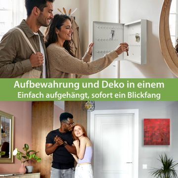 Bringe Ordnung und Eleganz in deinen Eingangsbereich mit dem banjado Schlüsselkasten Motiv Motiv Dreiecke Rot. Die moderne Schlüsselbox kombiniert funktionales Design mit hochwertiger Verarbeitung und wird so zu einem echten Hingucker in Flur, Büro oder Ferienwohnung. ✅ Stilvolle Schlüsselaufbewahrung mit Glasfront im Motiv Motiv Dreiecke Rot Der Design-Schlüsselkasten Motiv Motiv Dreiecke Rot bietet Platz für bis zu 50 Schlüssel, die auf 5 stabilen Reihen mit je 10 Haken übersichtlich verstaut werden. Mit seinen kompakten Maßen von 30 x 30 x 5 cm passt die Schlüsselbox perfekt auch in kleinere Räume. Der weiß lackierte Stahlkorpus mit rechts angeschlagenem Türscharnier harmoniert mit der Glasfront und fügt sich nahtlos in jedes Wohnambiente ein. Ob als Schlüsselorganizer für Zuhause oder als praktische Lösung für Büros, Praxen und Gewerbe, der banjado Schlüsselkasten sorgt für Ordnung und Übersicht. Dank der magnetischen, mit Kreidestiften beschreibbaren Glasfront kannst du Notizen anheften oder Termine direkt auf der Oberfläche festhalten. Die Schlüsselbox Motiv Motiv Dreiecke Rot zur Wandmontage wird inklusive Befestigungsmaterial geliefert und ist schnell angebracht. So hast du deine Schlüssel jederzeit griffbereit und zugleich stilvoll verstaut. Mit diesem banjado Schlüsselkasten Motiv Motiv Dreiecke Rot kombinierst du praktische Aufbewahrung mit stilvollem Wohndesign. Ob privat oder geschäftlich, die Schlüsselbox sorgt für mehr Ordnung, Übersicht und ein wohnliches Ambiente.Vorteile im Überblick