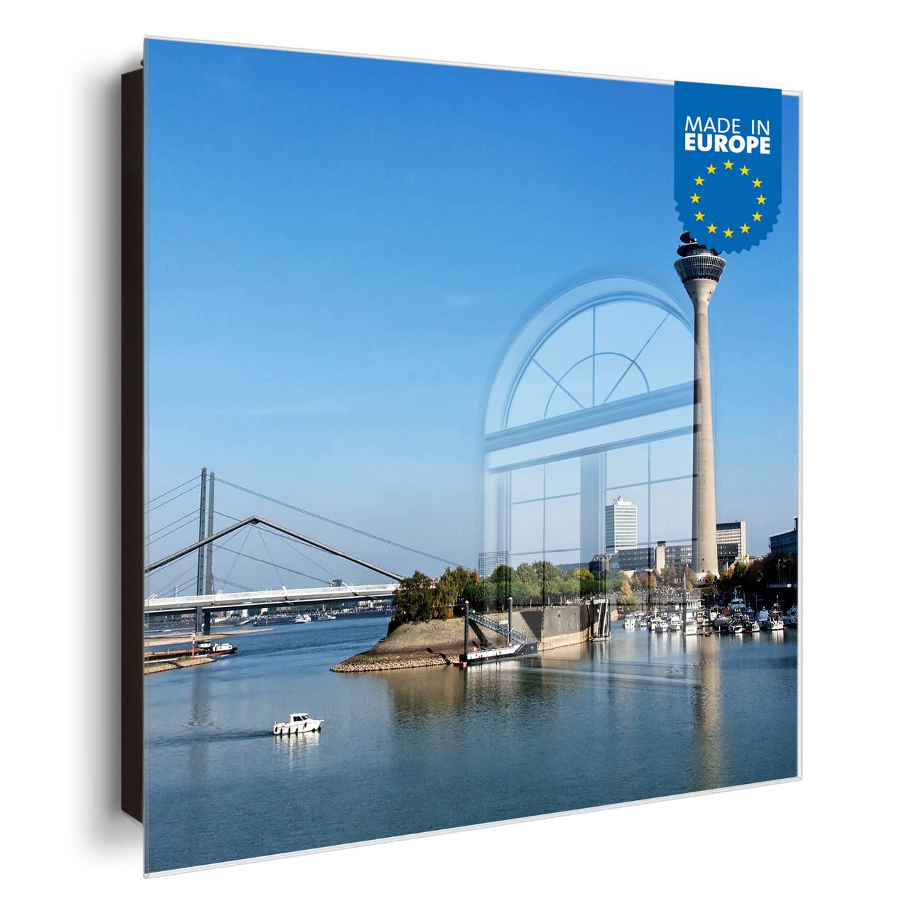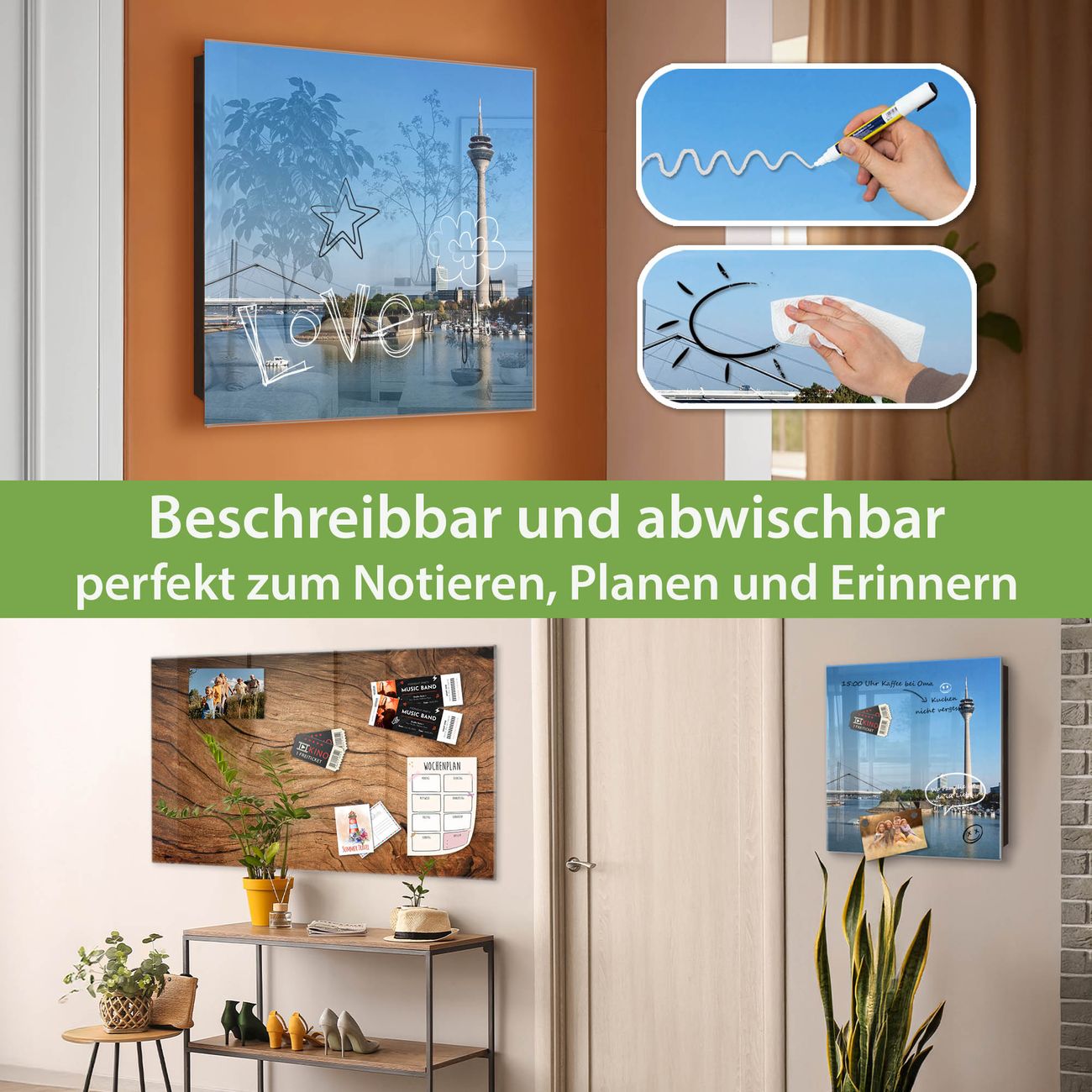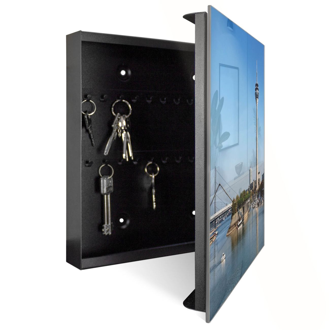 Bringe Ordnung und Eleganz in deinen Eingangsbereich mit dem banjado Schlüsselkasten Motiv Motiv Düsseldorf. Die moderne Schlüsselbox kombiniert funktionales Design mit hochwertiger Verarbeitung und wird so zu einem echten Hingucker in Flur, Büro oder Ferienwohnung. ✅ Stilvolle Schlüsselaufbewahrung mit Glasfront im Motiv Motiv Düsseldorf Der Design-Schlüsselkasten Motiv Motiv Düsseldorf bietet Platz für bis zu 50 Schlüssel, die auf 5 stabilen Reihen mit je 10 Haken übersichtlich verstaut werden. Mit seinen kompakten Maßen von 30 x 30 x 5 cm passt die Schlüsselbox perfekt auch in kleinere Räume. Der schwarz lackierte Stahlkorpus mit rechts angeschlagenem Türscharnier harmoniert mit der Glasfront und fügt sich nahtlos in jedes Wohnambiente ein. Ob als Schlüsselorganizer für Zuhause oder als praktische Lösung für Büros, Praxen und Gewerbe, der banjado Schlüsselkasten sorgt für Ordnung und Übersicht. Dank der magnetischen, mit Kreidestiften beschreibbaren Glasfront kannst du Notizen anheften oder Termine direkt auf der Oberfläche festhalten. Die Schlüsselbox Motiv Motiv Düsseldorf zur Wandmontage wird inklusive Befestigungsmaterial geliefert und ist schnell angebracht. So hast du deine Schlüssel jederzeit griffbereit und zugleich stilvoll verstaut. Mit diesem banjado Schlüsselkasten Motiv Motiv Düsseldorf kombinierst du praktische Aufbewahrung mit stilvollem Wohndesign. Ob privat oder geschäftlich, die Schlüsselbox sorgt für mehr Ordnung, Übersicht und ein wohnliches Ambiente.Vorteile im Überblick