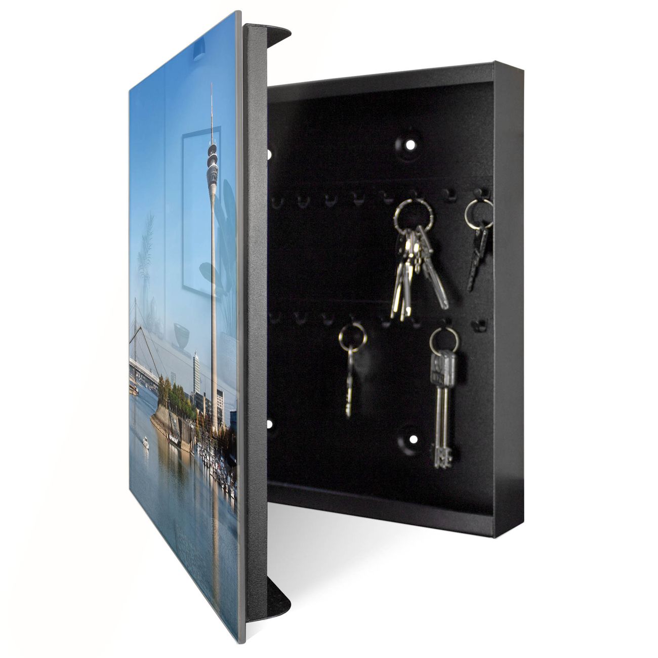 Bringe Ordnung und Eleganz in deinen Eingangsbereich mit dem banjado Schlüsselkasten Motiv Motiv Düsseldorf. Die moderne Schlüsselbox kombiniert funktionales Design mit hochwertiger Verarbeitung und wird so zu einem echten Hingucker in Flur, Büro oder Ferienwohnung. ✅ Stilvolle Schlüsselaufbewahrung mit Glasfront im Motiv Motiv Düsseldorf Der Design-Schlüsselkasten Motiv Motiv Düsseldorf bietet Platz für bis zu 50 Schlüssel, die auf 5 stabilen Reihen mit je 10 Haken übersichtlich verstaut werden. Mit seinen kompakten Maßen von 30 x 30 x 5 cm passt die Schlüsselbox perfekt auch in kleinere Räume. Der schwarz lackierte Stahlkorpus mit rechts angeschlagenem Türscharnier harmoniert mit der Glasfront und fügt sich nahtlos in jedes Wohnambiente ein. Ob als Schlüsselorganizer für Zuhause oder als praktische Lösung für Büros, Praxen und Gewerbe, der banjado Schlüsselkasten sorgt für Ordnung und Übersicht. Dank der magnetischen, mit Kreidestiften beschreibbaren Glasfront kannst du Notizen anheften oder Termine direkt auf der Oberfläche festhalten. Die Schlüsselbox Motiv Motiv Düsseldorf zur Wandmontage wird inklusive Befestigungsmaterial geliefert und ist schnell angebracht. So hast du deine Schlüssel jederzeit griffbereit und zugleich stilvoll verstaut. Mit diesem banjado Schlüsselkasten Motiv Motiv Düsseldorf kombinierst du praktische Aufbewahrung mit stilvollem Wohndesign. Ob privat oder geschäftlich, die Schlüsselbox sorgt für mehr Ordnung, Übersicht und ein wohnliches Ambiente.Vorteile im Überblick