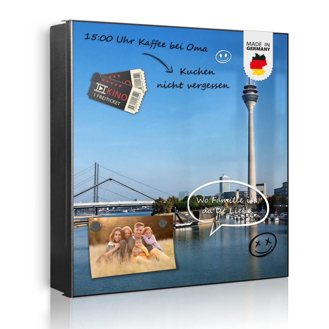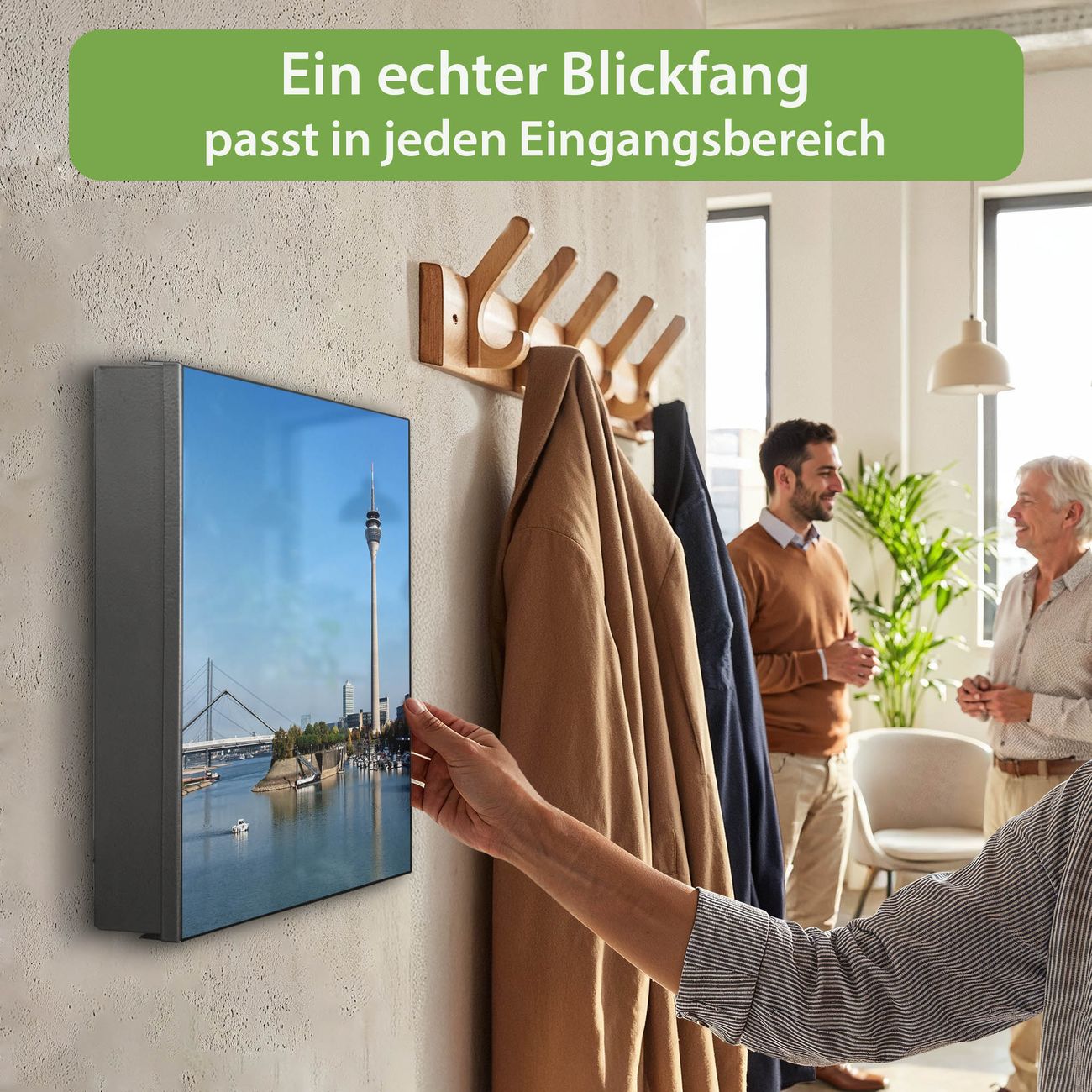 Bringe Ordnung und Eleganz in deinen Eingangsbereich mit dem banjado Schlüsselkasten Motiv Motiv Düsseldorf. Die moderne Schlüsselbox kombiniert funktionales Design mit hochwertiger Verarbeitung und wird so zu einem echten Hingucker in Flur, Büro oder Ferienwohnung. ✅ Stilvolle Schlüsselaufbewahrung mit Glasfront im Motiv Motiv Düsseldorf Der Design-Schlüsselkasten Motiv Motiv Düsseldorf bietet Platz für bis zu 50 Schlüssel, die auf 5 stabilen Reihen mit je 10 Haken übersichtlich verstaut werden. Mit seinen kompakten Maßen von 30 x 30 x 5 cm passt die Schlüsselbox perfekt auch in kleinere Räume. Der weiß lackierte Stahlkorpus mit rechts angeschlagenem Türscharnier harmoniert mit der Glasfront und fügt sich nahtlos in jedes Wohnambiente ein. Ob als Schlüsselorganizer für Zuhause oder als praktische Lösung für Büros, Praxen und Gewerbe, der banjado Schlüsselkasten sorgt für Ordnung und Übersicht. Dank der magnetischen, mit Kreidestiften beschreibbaren Glasfront kannst du Notizen anheften oder Termine direkt auf der Oberfläche festhalten. Die Schlüsselbox Motiv Motiv Düsseldorf zur Wandmontage wird inklusive Befestigungsmaterial geliefert und ist schnell angebracht. So hast du deine Schlüssel jederzeit griffbereit und zugleich stilvoll verstaut. Mit diesem banjado Schlüsselkasten Motiv Motiv Düsseldorf kombinierst du praktische Aufbewahrung mit stilvollem Wohndesign. Ob privat oder geschäftlich, die Schlüsselbox sorgt für mehr Ordnung, Übersicht und ein wohnliches Ambiente.Vorteile im Überblick