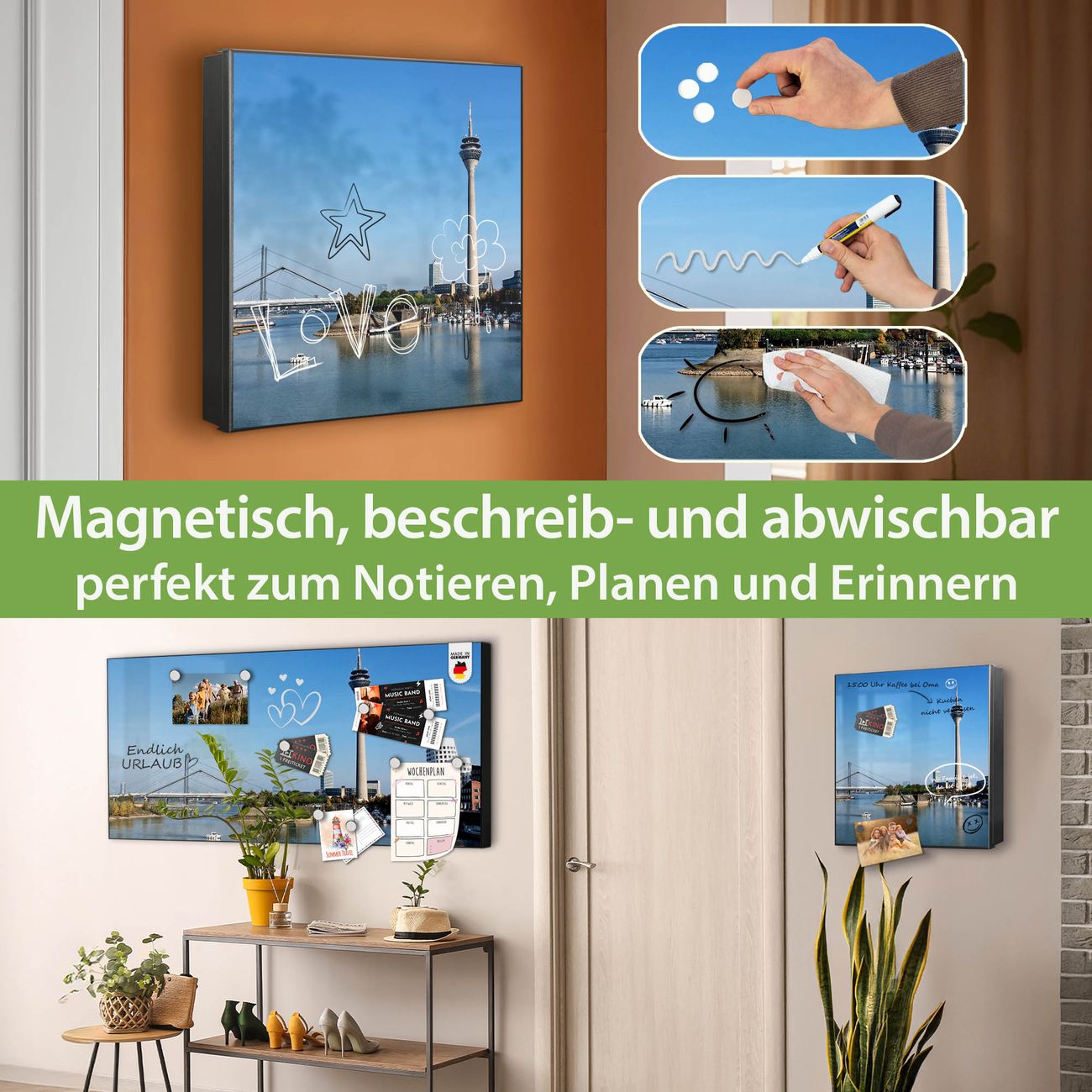 ✅ Magnetisch und mit Kreidestift beschreibbar, gehärtetes Glas, links angeschlagene TürOrdnung und Design in einem